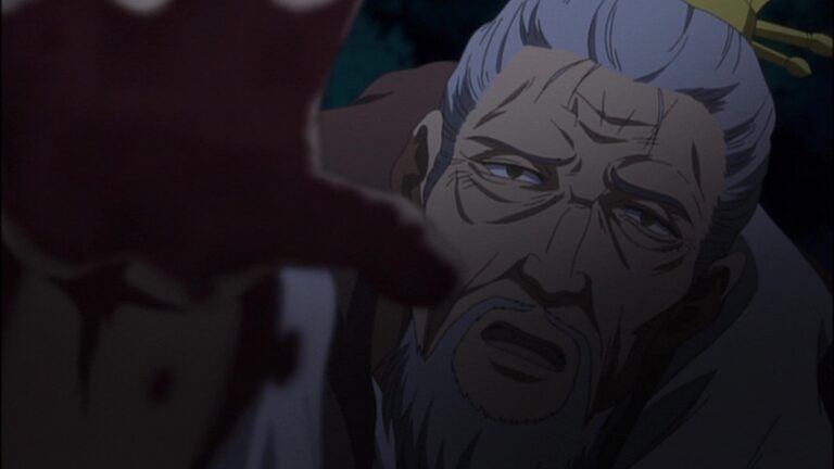I should note here that by the time Chūshō dies, Shūrei and Shunki have already moved on ahead to enter the dungeon and Shō has already left for the ceremony. So the corrupt bastard really is alone, aside from the series’ other old bastard (Advisor Sho) watching his life force fade away.