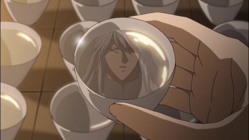 Sakujun tries to provoke Seiran into getting angry and losing his focus by telling him that Shūrei made him Gan Lu tea. Seiran doesn’t buy this for a moment and says that Sakujun must have tricked her into doing it somehow. This shakes Sakujun’s confidence enough that his movements stop dead still for a few moments, the bowl of sake inches from his lips. We won’t learn why until later.