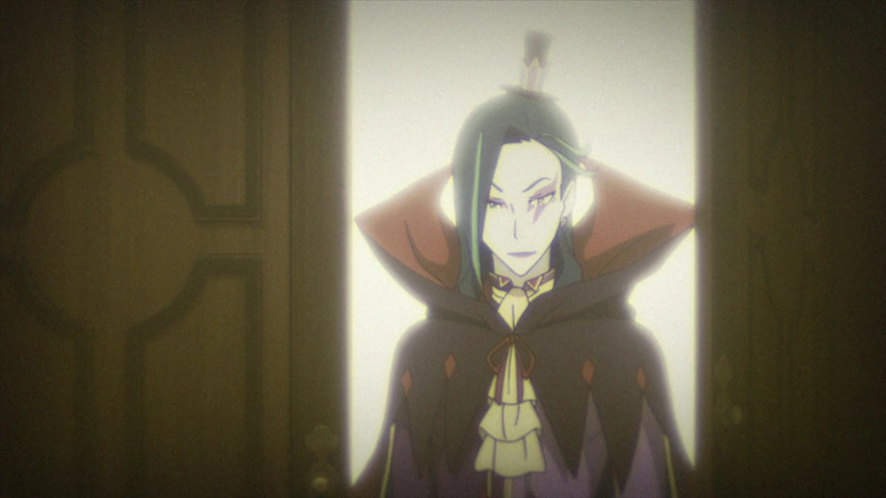 So I checked back to see it again, because red is definitely not the color I remembered for Hector’s eyes. They seem to vary a bit in color depending on how zoomed in the image is, the lighting, and the blueish mist around him, but overall, whenever we have a clear view, they appear rather yellowish, if maybe a tad darker than Roswaal’s; brown maybe, but not red. That said, Roswaal’s eye has also appeared darker on occasion in different episodes depending on lighting etc. so it is not super consistent (in the same exact episode there are plenty of close-ups of Roswaal’s face near the end for instance). And the purplish blue mist around Hector would definitely be affecting the apparent color too, so I would say that the eye colors are close enough to be considered a match if one wants to do so.