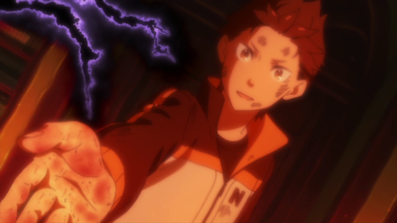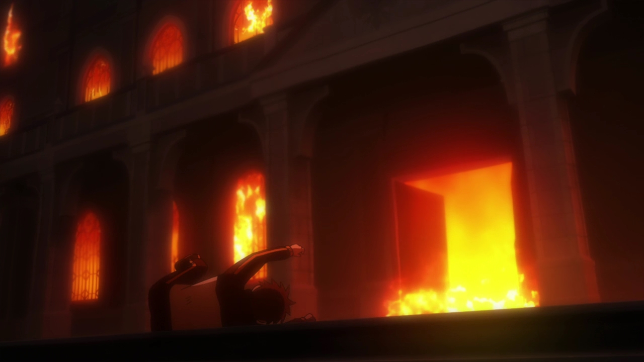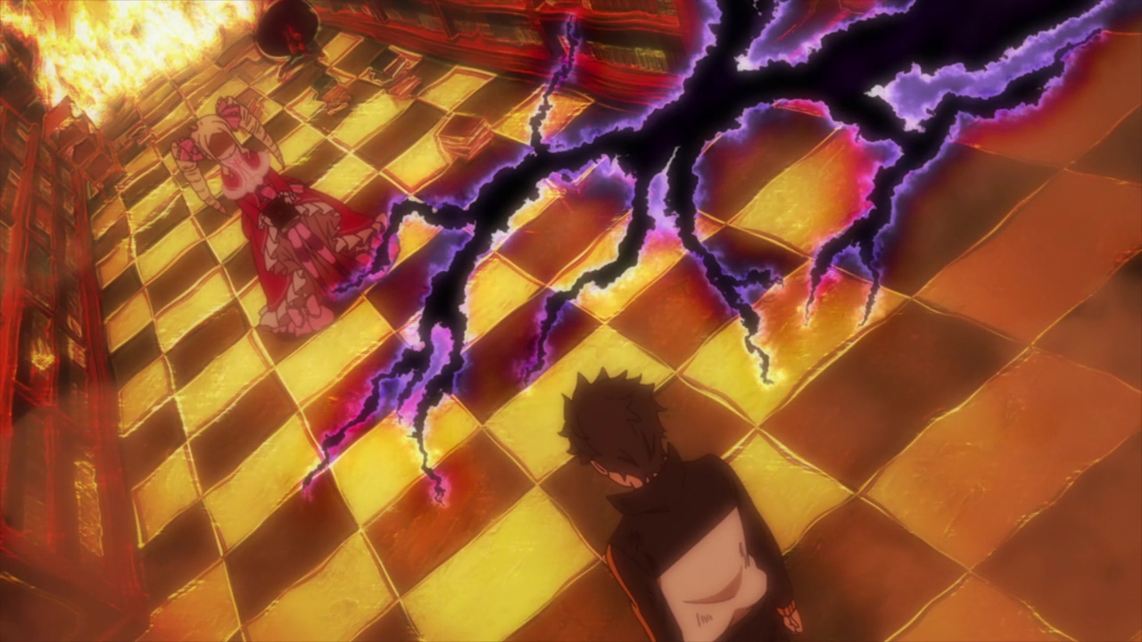 Well, the conversation with Beatrice being a bit repetitive was kind of the point. As far as convincing someone who has had the same mindset ingrained in them for 400 years — the abandonment issues, the loneliness, the despair, the reliance on her contract and isolating herself emotionally as a way to cope — and talking them out of effective suicide goes, it is as short as it can be while staying sort of realistic. And there was definitely a lot of work done to spice it up and make it as interesting as possible. The impending destruction of the mansion and the library and its visual representation — the smoke, the fire, the cracks forming — add a kind of timer and a sense of increasing urgency while Subaru tries to snap Beatrice out of her clinging to her promise, her contract, her memory of Echidna and times past, her abandonment issues. There were even these neat little touches sprinkled all over, like the door handle that froze Subaru’s hand in season 1 (with him retreating in shock and pain) now burning it but being grabbed by him on purpose nonetheless. Or the same central tower of the mansion which was destroyed by Puck in the snowstorm in the first season now collapsing in the fire.