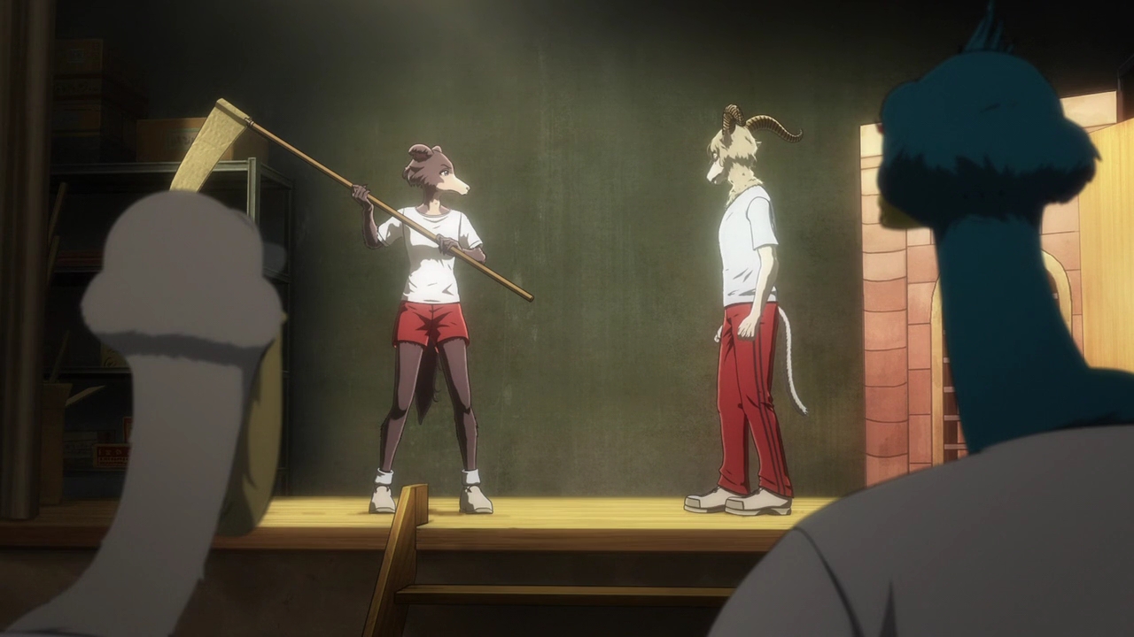 I’m guessing Gouhin is going to give Legoshi a bit of aid. Legoshi says he doesn’t want to punish Riz, but wants to just talk to him. Turning him to the police doesn’t seem like an option he’d take, so would it be rehabilitation? Riz doesn’t really have a meat addiction problem, his problem here is more mental. He keeps entertaining these delusional memories of him and Tem at the end, thinking that Tem LET HIM eat him as a sign of unity in their friendship. Obviously, this is not the case and it’s just horrifying to think about. Right now, Riz is mentally unwell and in order to maintain those false happy memories he wants to kill both Legoshi and Pina. Opening up the episode with Riz talking about Tem and eating him did such a great job setting up the unsettling mood for the rest of the episode. Any time he would appear on screen I’d immediately get nervous, especially during the bathroom scene with him and Pina. And I have to give Pina props for that declaration during their rehearsal, I love it.