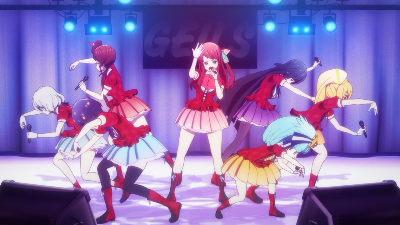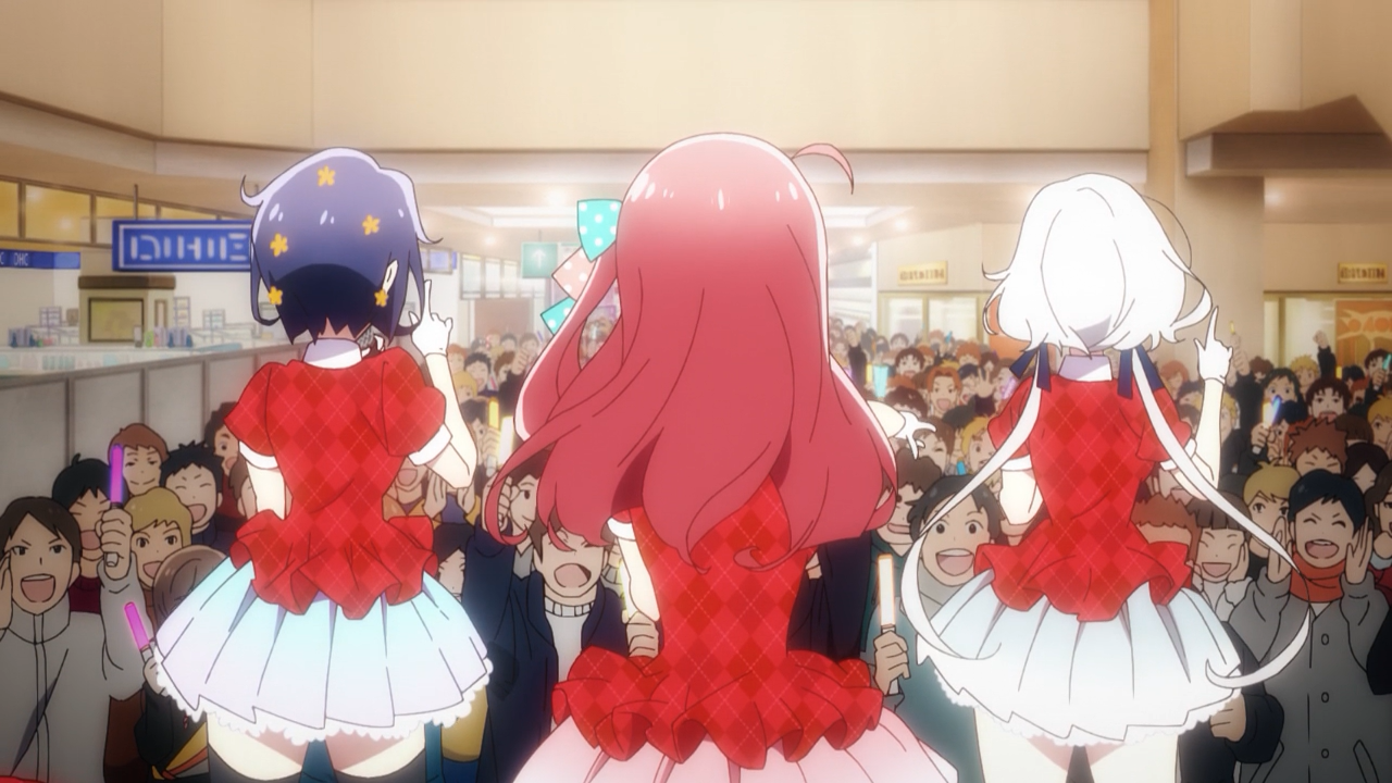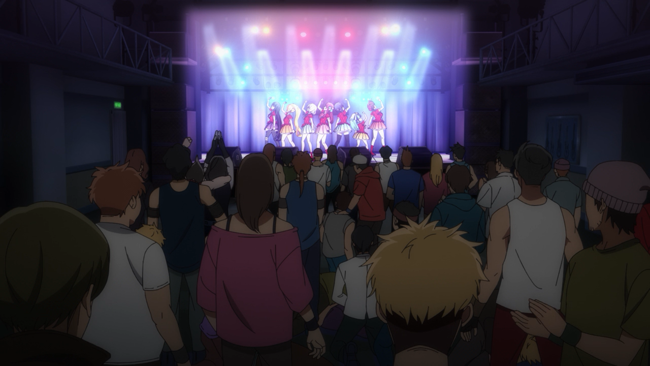 While this premiere certainly didn’t have that same kind of impact as it did in the first season, it was still fun and enjoyable to watch! Of course it is a bit of a shame we didn’t get to see a similar unexpected surprise of a sort. In fact I was kind of surprised Kotaro didn’t get hit by Truck-kun while he was sprinting off to the concert arena- or at least almost. I was half waiting for that to happen hahahaha! Even if it didn’t hit him, I think it still could have been funny to spoof the moment. Nonetheless, it was still pretty funny to see them start it off with the girls at work, Ai leading the Kojima Food Factory’s anthem with of course, a dried squid song. The riot at the concert was probably the biggest highlight for me because besides the fact I saw that coming, it was pretty entertaining to see them continue to perform amidst the chaos, not that it was anything new. After-all, they have been through more chaotic stages before, such as their concert in the Season 1 Finale at Arpino, man that was a doozy!