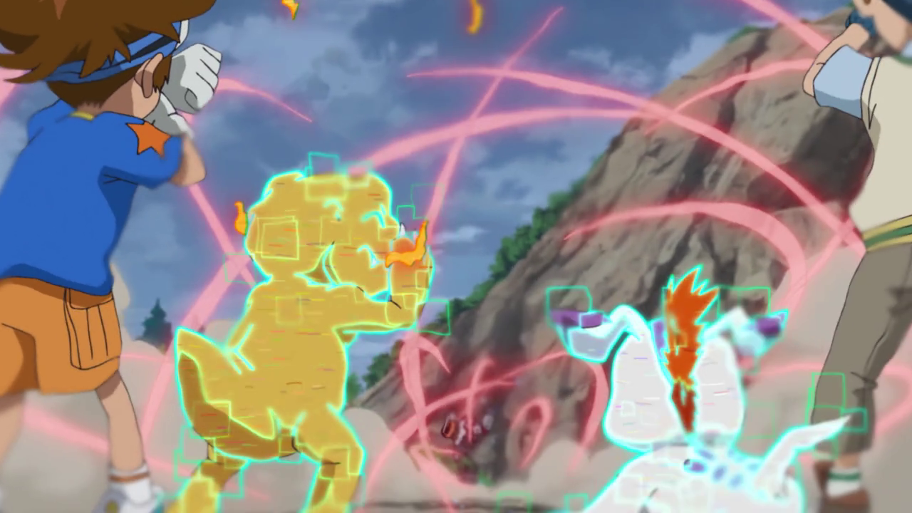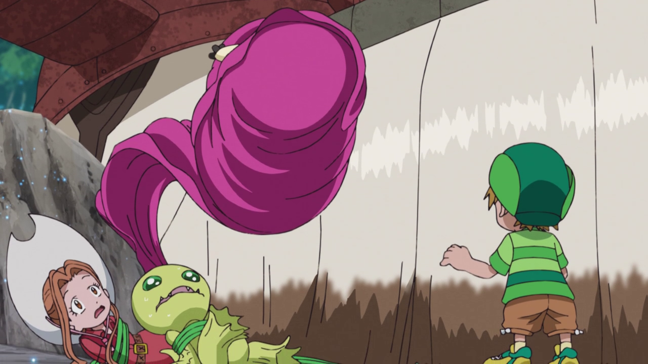 The kids are continuing their excruciatingly long journey towards FAGA and Tailmon is having a difficult time figuring out the road from her memories due to the change in landscape. However, they run into a couple of ultimate Digimon fighting over the title of “King of All Digimon” with the power of song… Did Digimon turn into Hypnosis Mic or something? Either way, it was amazingly hilarious to watch these two Digimon basically rap battle each other. Made to be even more chaotic when their sound waves were disrupting the Digimons’ data. Which was a little weird since they were the only ones to be effected in that way while the audience of Digimon were fine. Maybe it was because the Digivices were being affected? It was a bit unclear. However, it was pretty hilarious how everyone was affected.