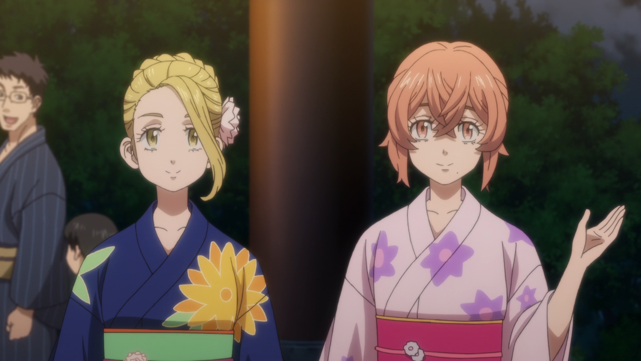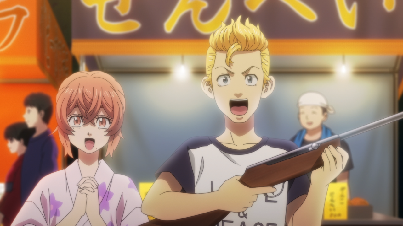 I actually really like how this episode balanced the slice of life elements with moving the story forward. Having characters just interact in a fun environment is a great way to get to know them. Hina and Emma have become friends, which is fantastic! The two of them can support each other, and it also means that we (hopefully) won’t have any more funky misunderstandings between the two. And hey! at least Takemichi was able to make up for that first encounter by losing at the shooting gallery and also looking out for Hina when her foot was cut up. Takemichi you may be kind of a loser, but you’re a good kid. Sure, it helps that you know the future, but you’re still a good kid.