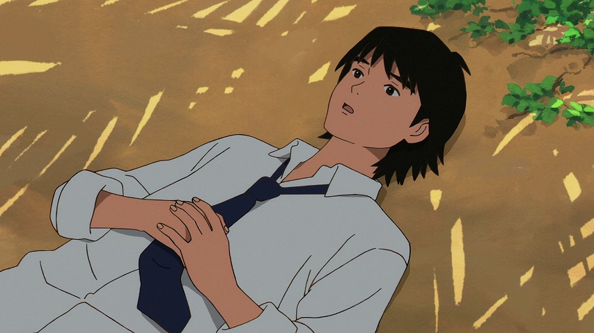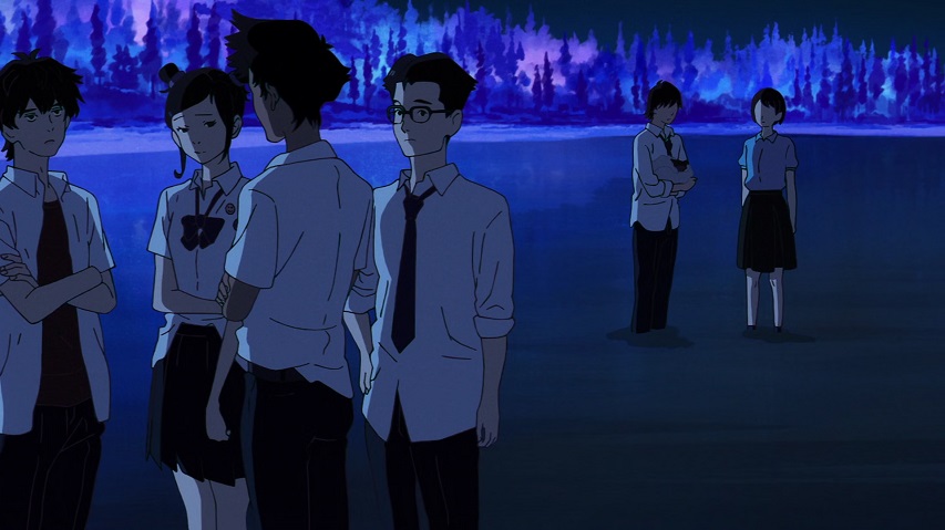 Later, Nagara finds a dead bird that flew into a school window. Nozomi finds him and reminds him that he left another bird to die, back on the day when the school first started drifting. Nagara makes up a weak defense, then gets irritated with Nozomi for grilling him about the past.