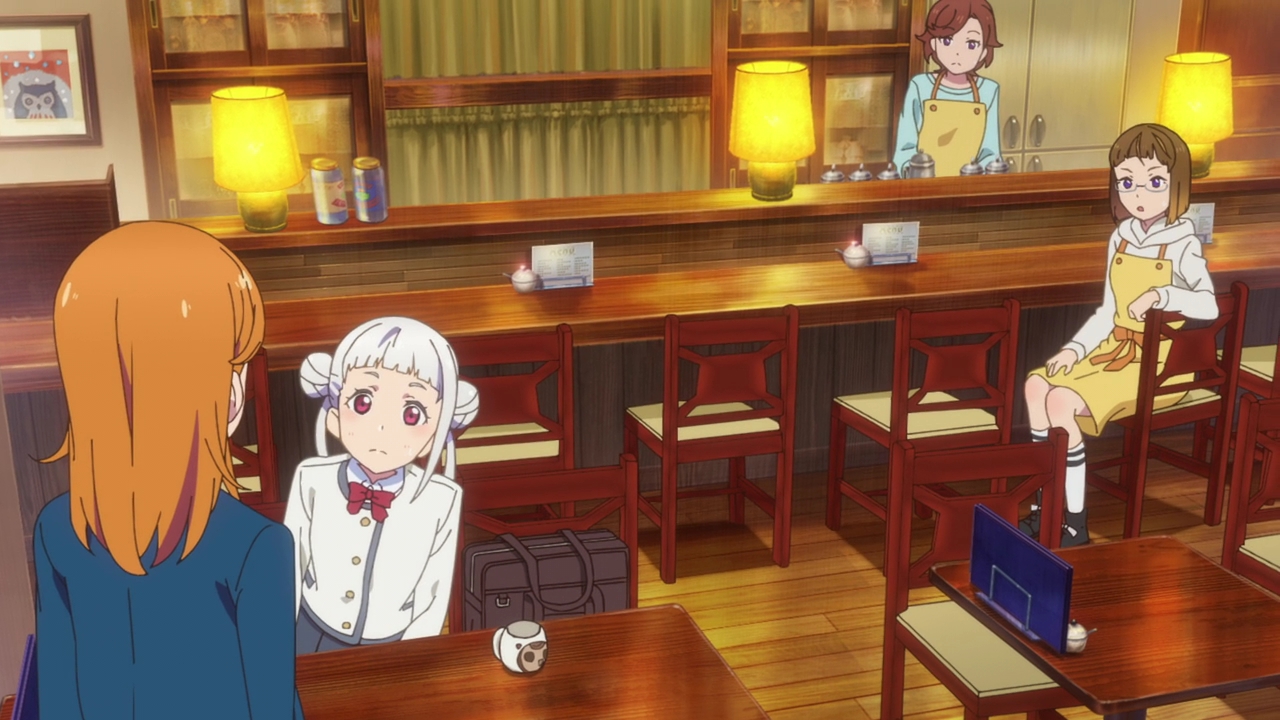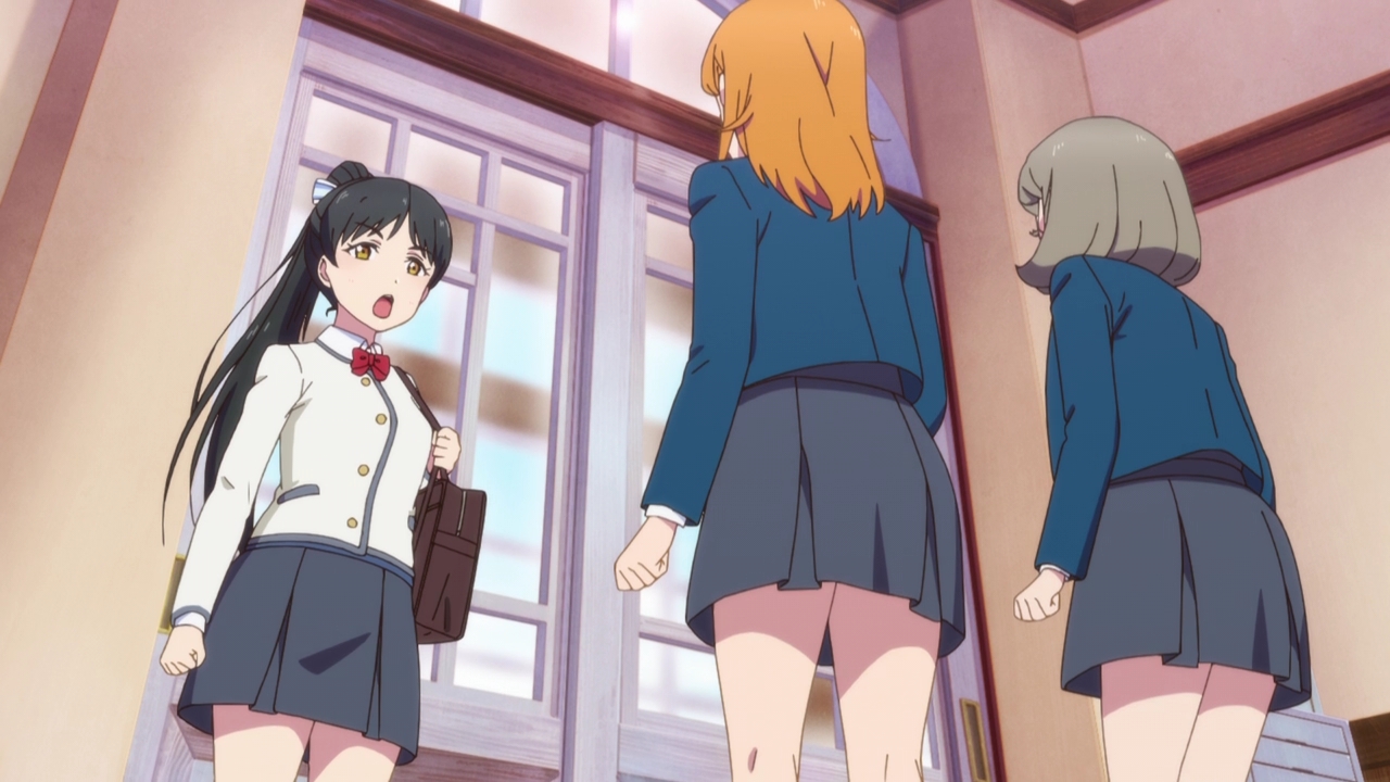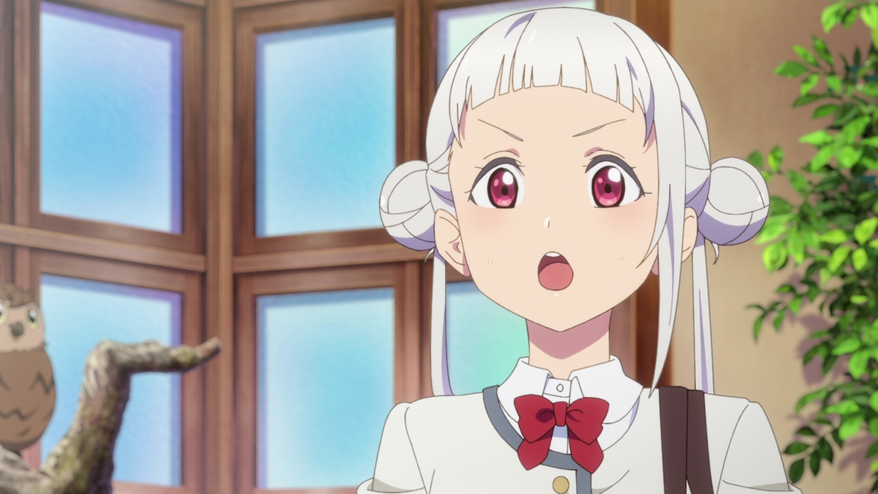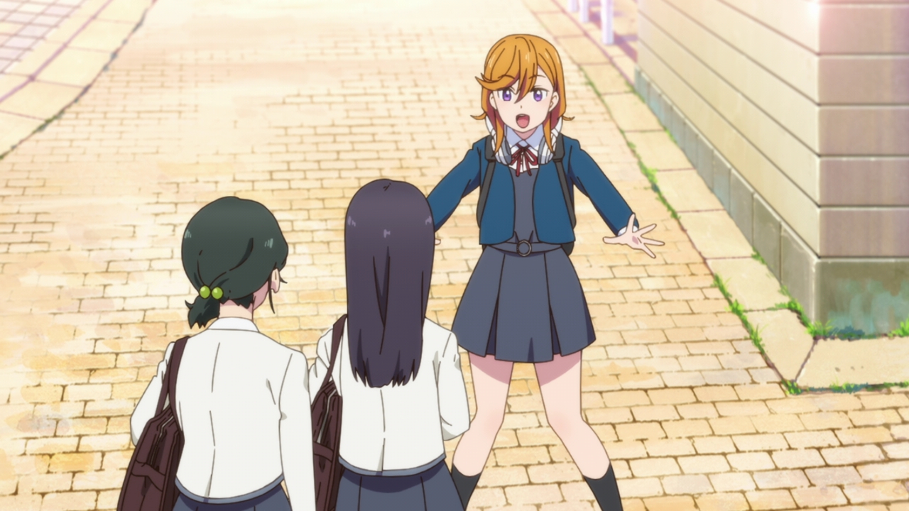Sumire I thought would be the other serious girl, but it looks like she’s the type that’s screaming for attention. Such as going out of her way to yell about her crepe and hoping that people were watching her or something. I’m not entirely sure what her deal is, but at least she won’t be as stoic as Ren. Maybe she’ll be the Nico/Kasumi of the group. And speaking of Ren, she doesn’t make too much of an impression yet. Again, I’ve seen her character type too often so it gets a little boring so I hope they do something different with her. It sounds like she’s under a lot of pressure because of her mother donating to the school, and her emphasis of having their school beat the other schools when it comes to their music programs and all that might be because of her home. I can see her having a strict musical upbringing and being jealous of school idols because they don’t have to take themselves too seriously when they perform (like being more upbeat). That’s fine and all but I don’t want this show being too predictable. Still, we’ll see.