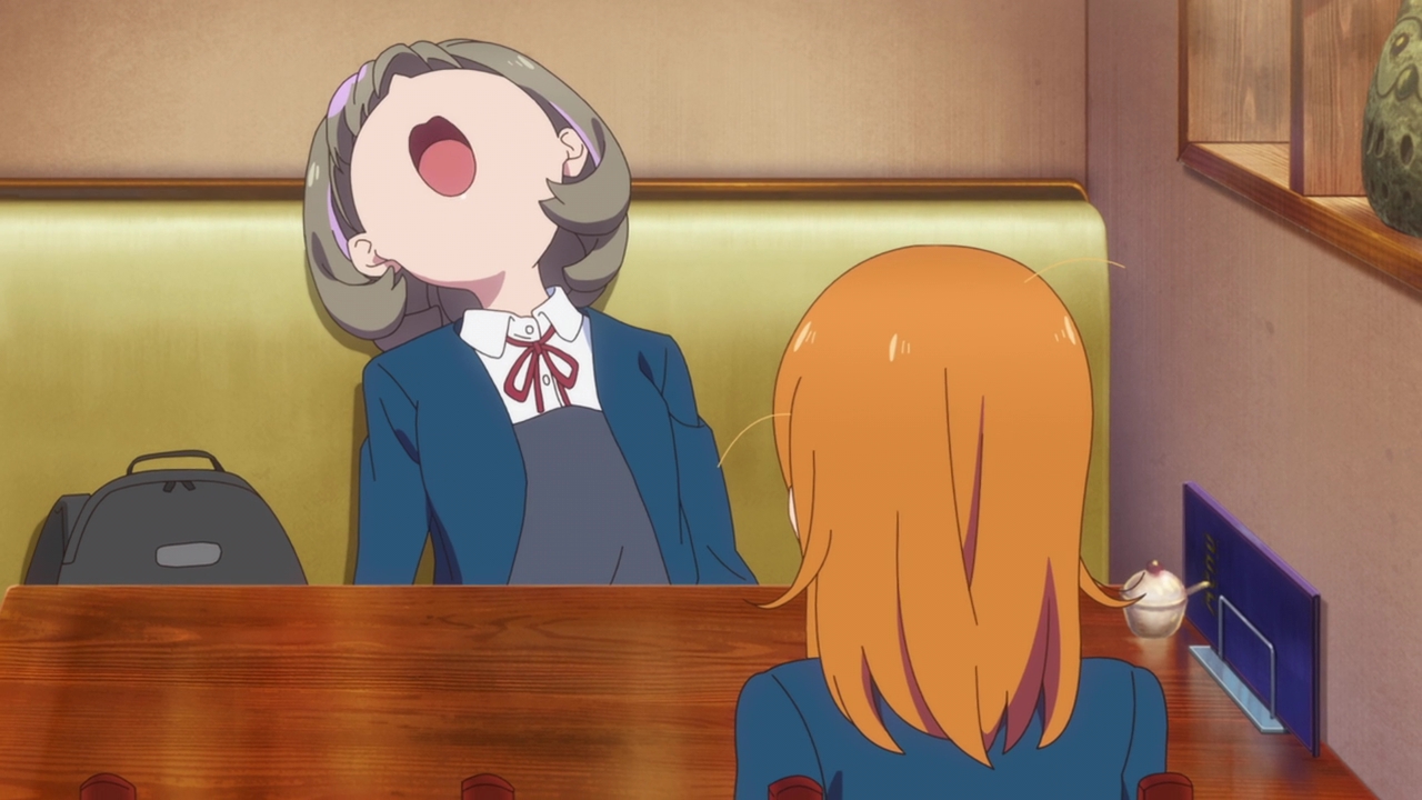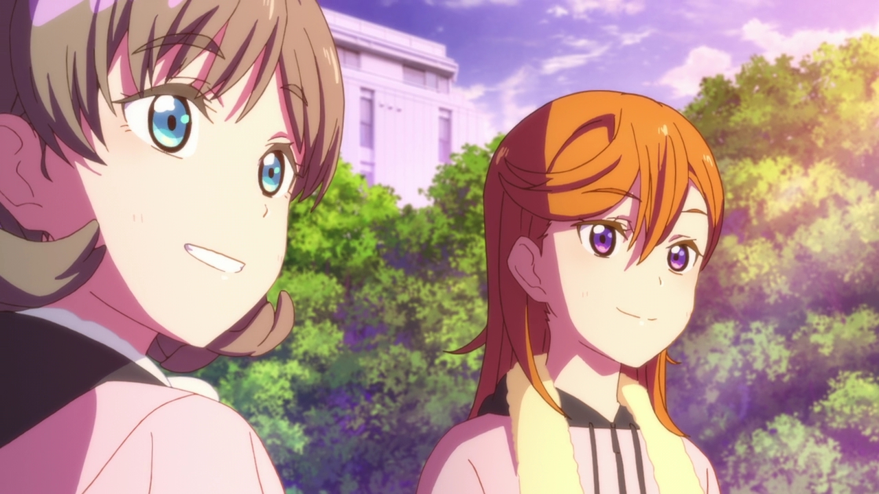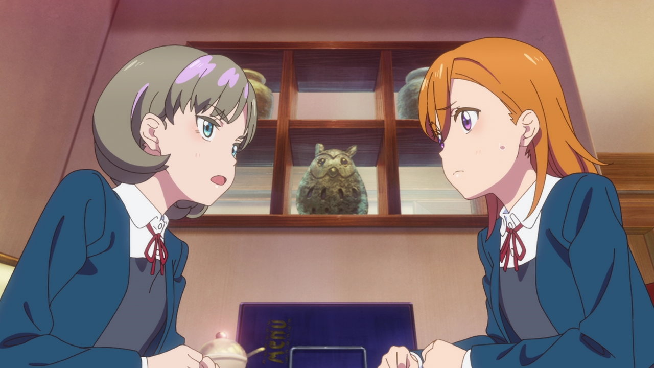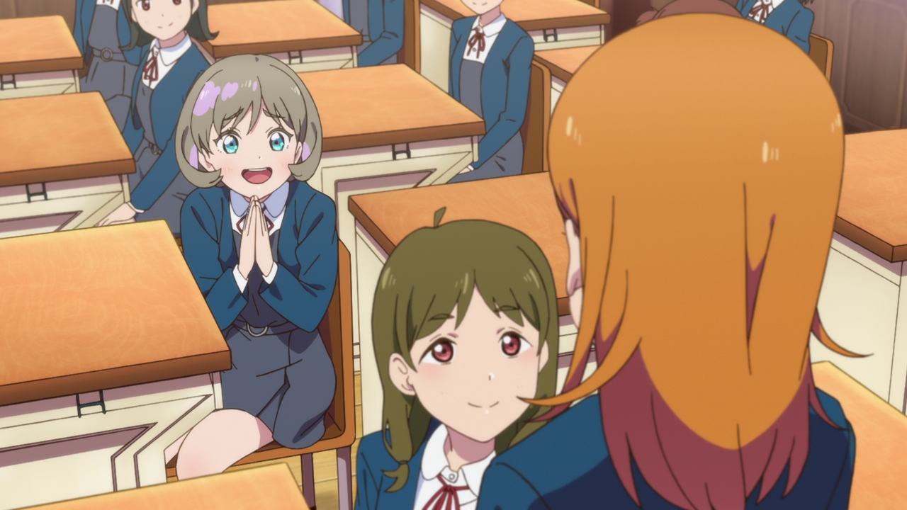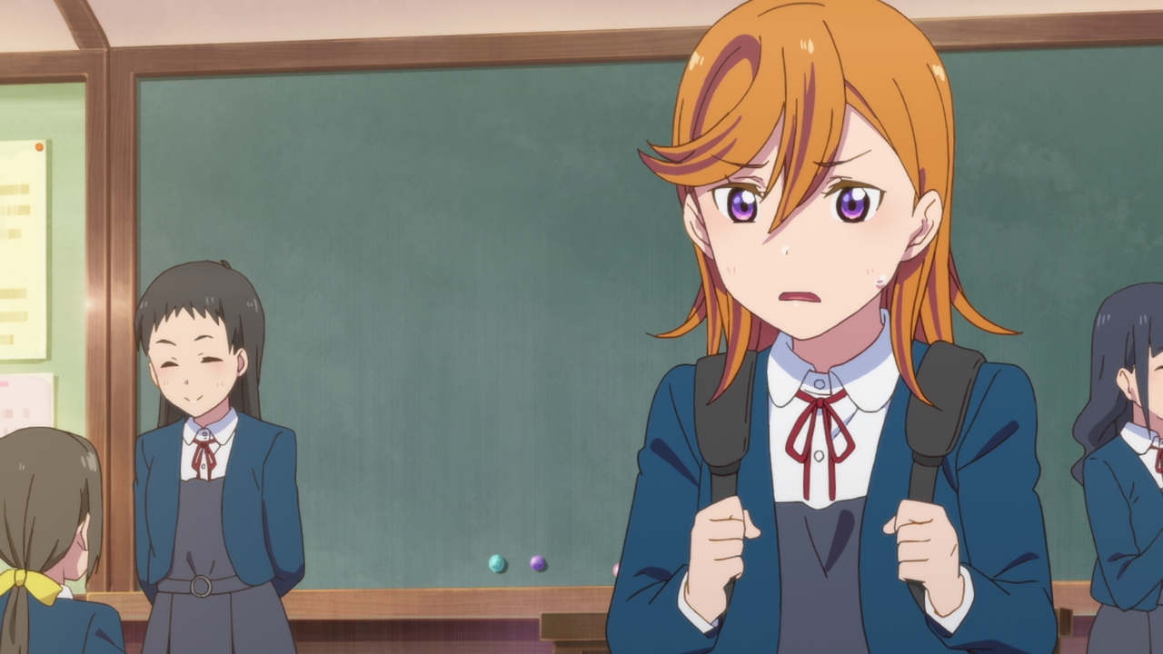 So this episode was lovely, and it really surprised me. Whenever I see an orange haired character, my mind automatically thinks “genki”. We got that with Honoka, and with Chika, so I thought Kanon would be the same way and yet she’s the complete opposite and I love it. She’s straightforward and sort of cynical, while also being a dreamer. Except she can’t achieve her dream because of her debilitating stage fright. This is a great change to the main characters in Love Live since they were all super happy-go-lucky and ready to sing and dance, even if they weren’t that good at it. Kanon on the other hand loves to sing, and she’s very good at it and she’s loved to sing ever since she was a child. But she simply can’t because of her stage fright, which messed up her chances at getting into the music program of the school she’s going to now. This is a serious hurdle to get through and I think a more creative take on the regular Love Live formula. I’m sure there’s many people that can relate to Kanon with their love of music but also having the fear of performing in front of others. It’s sad, it’s frustrating, and demoralizing. And we really see that with Kanon as she wants to be school idols with Keke, but her fear holds her back.