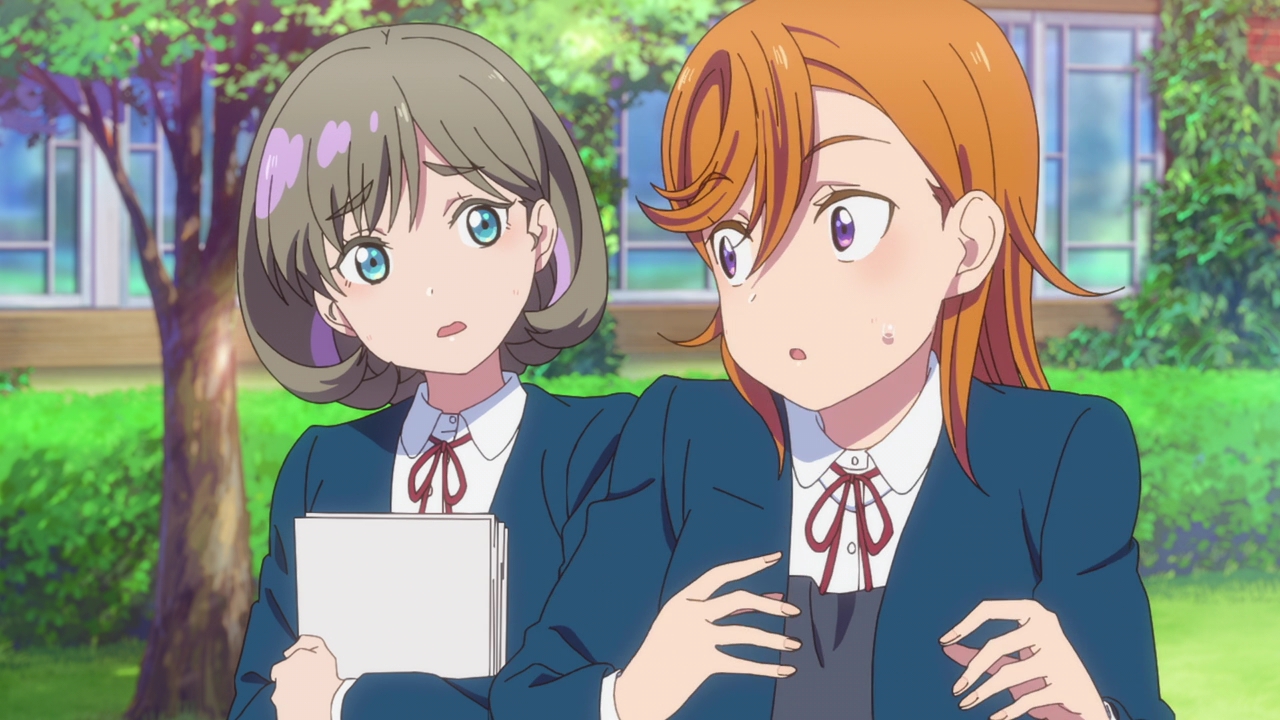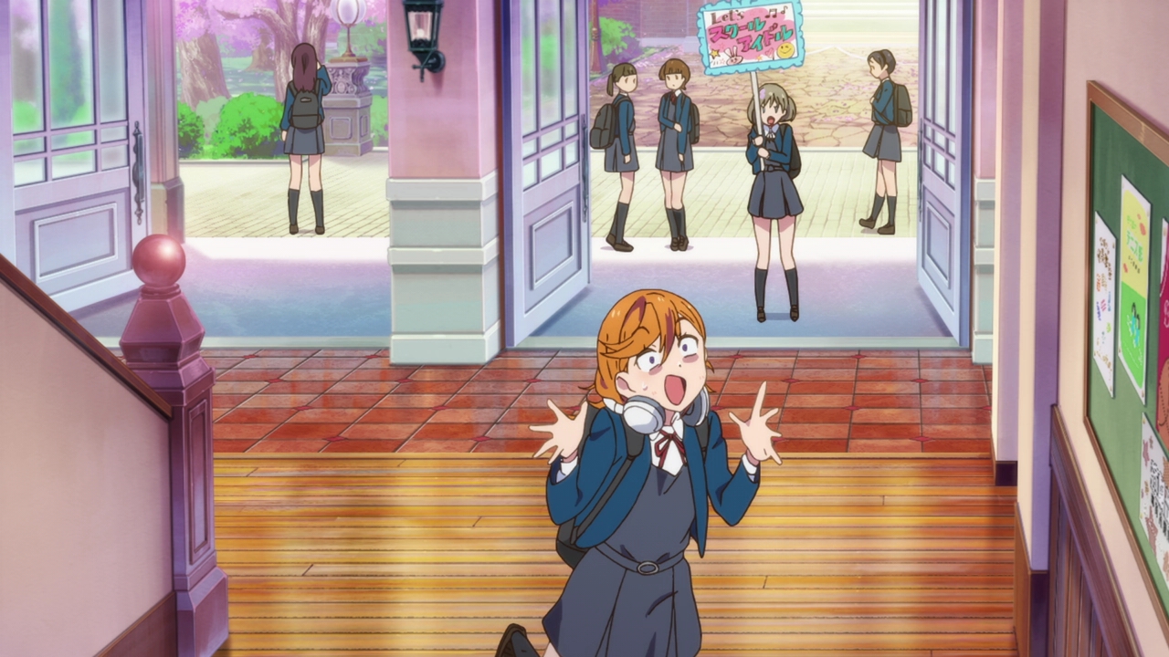 I can’t say much about the other girls as well either since they didn’t appear much. Chisato has an adorable design, Sumire I’m not sure of, and Ren is…yet again, the no nonsense student council president that forbids idols but will also join the main group later on. We’ve had this every season, though now we’re back to the president not liking idols and looking down on them (sort of like Eli). This trope is really boring but damn it it’s not just Love Live, literally every idol/music show that’s set in a school always has the student council president character who’s strict. And I usually do end up really liking these characters a lot (love Eli and Dia, and I liked the little bit I saw of Setsuna) but this trope seriously has got to go.