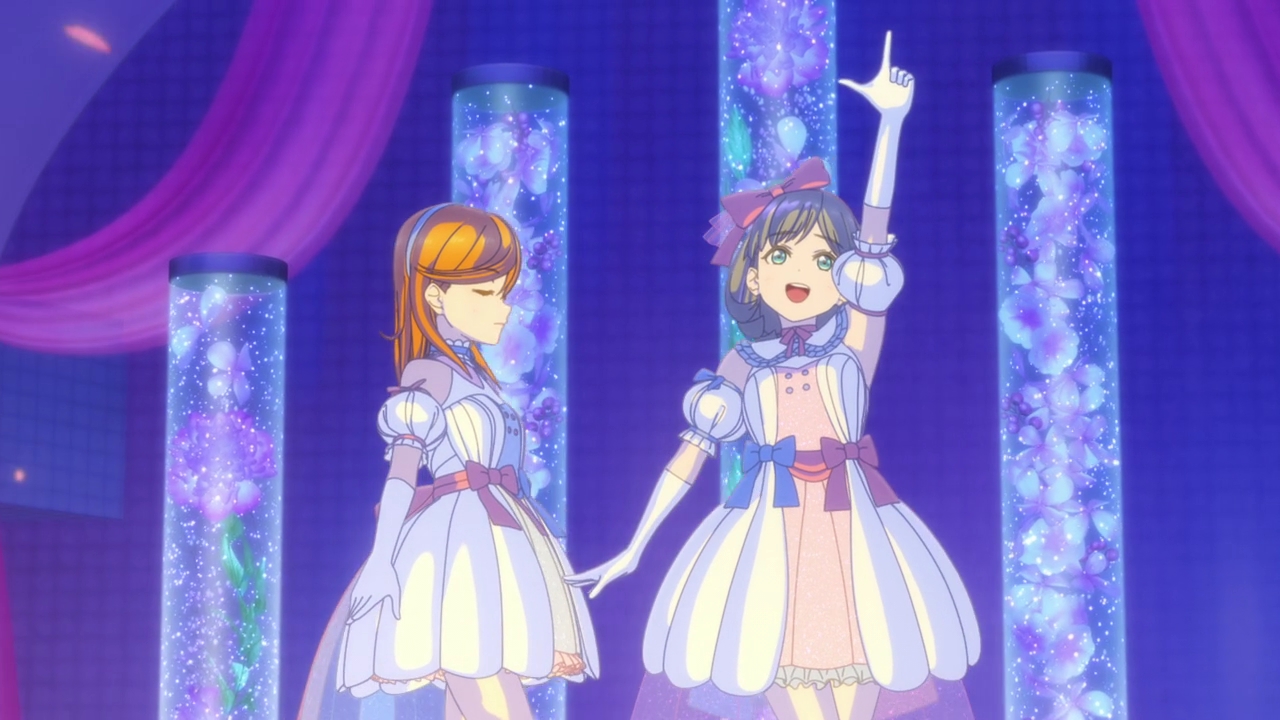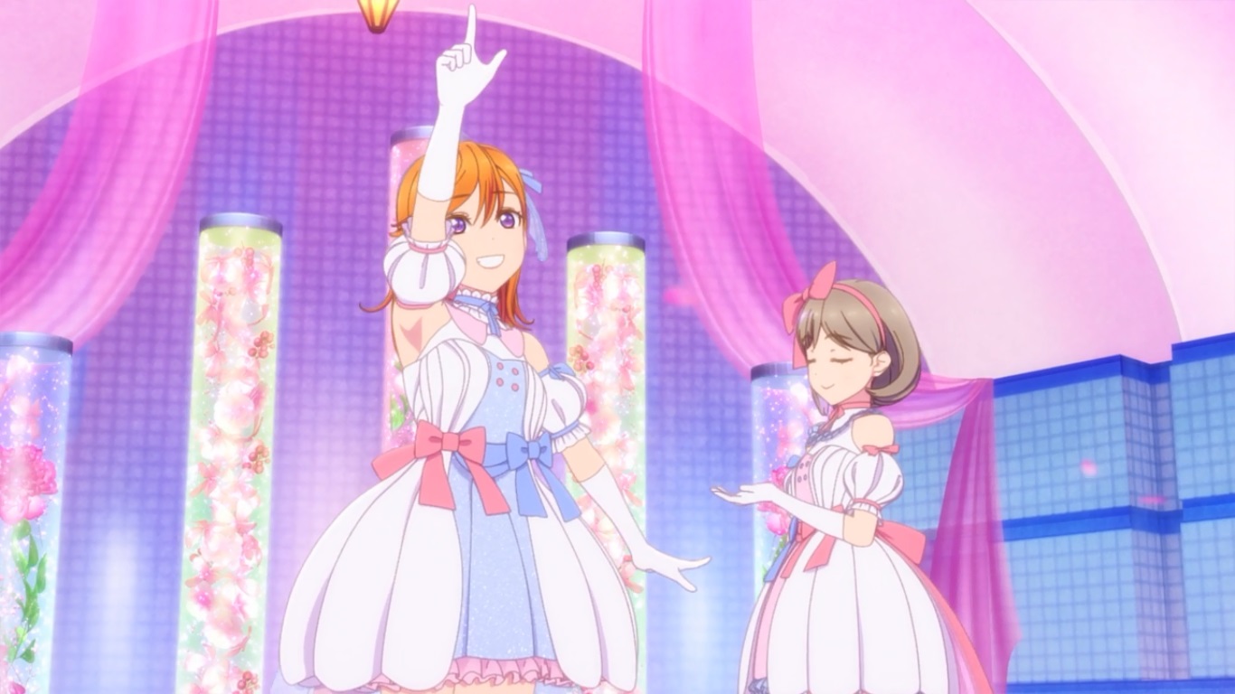 Could this possibly be my favorite third episode “big moment” performance in Love Live so far? It might just be. Is it my favorite song? Maybe not, but it’s riiiiiight behind Start Dash as a very close second because I loved this song. But whenever I hear Start Dash it still gets an emotional reaction out of me, but Kanon and Keke did so well. Aesthetically? This is absolutely my favorite performance by a longshot. White sparkly dresses with pink and blue, and bows, with a beautiful pink stage with more bows and ribbons? All pink? This is my jam.
