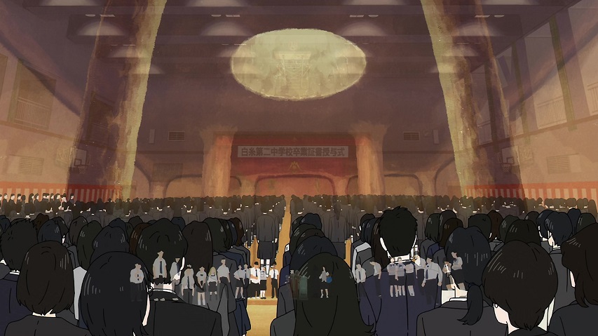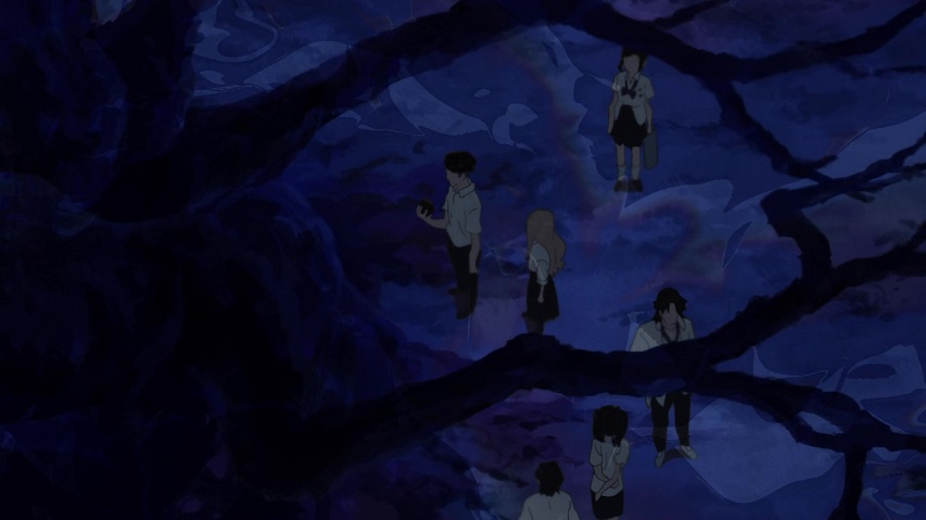 The episode culminates with Nagara transporting the students to the “world” of the composite film, hoping it would allow them to return home. Instead, the students became “copies” within the film. And Nozomi was actually dead! The students could watch themselves attend their graduation ceremony and talk with each other, but would pass through people like air if they tried to interact with anyone in the film.