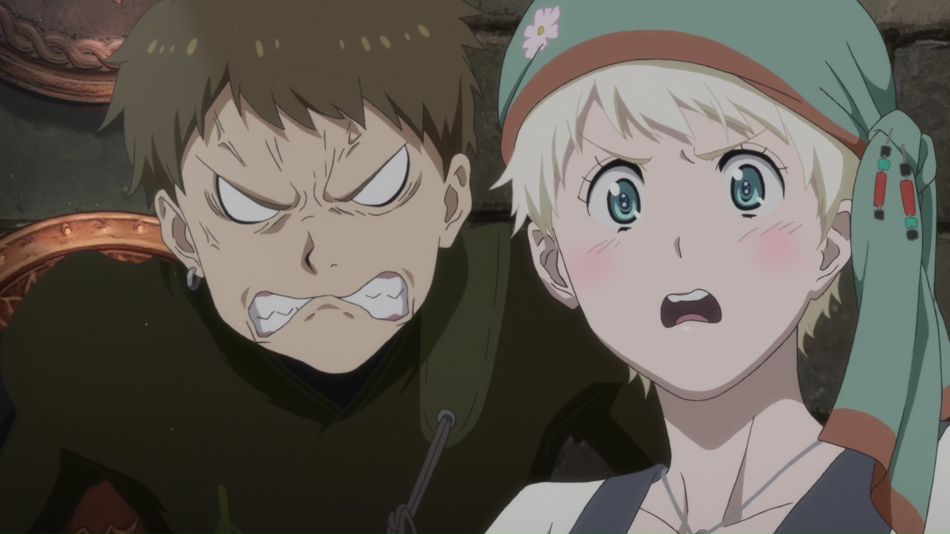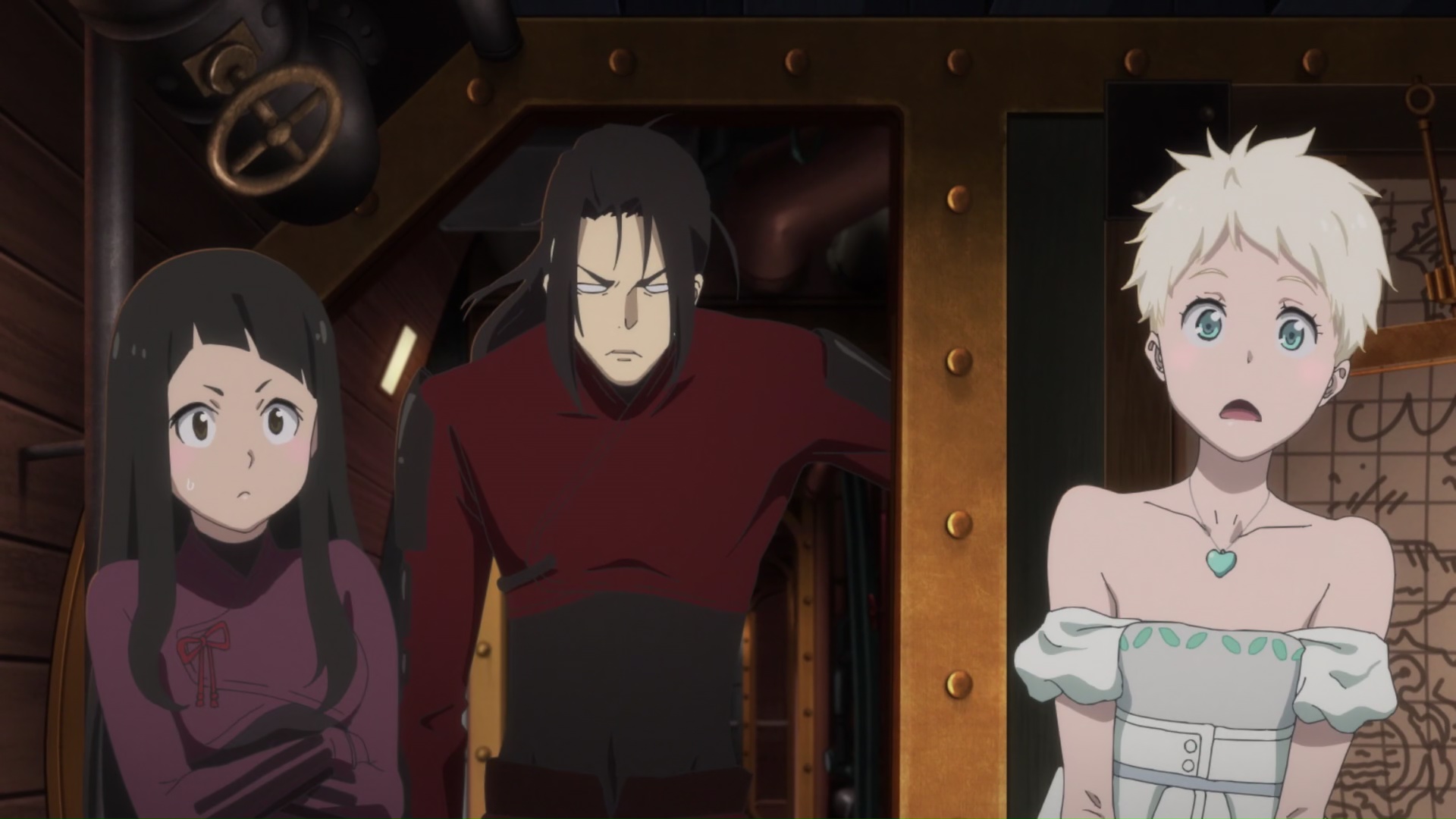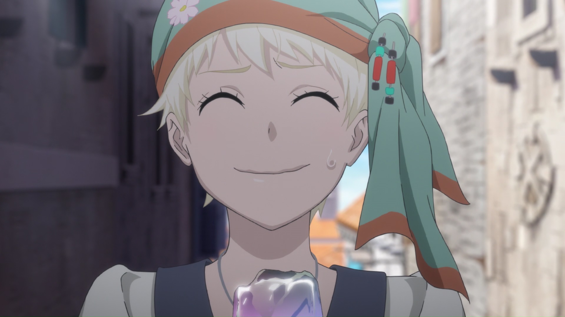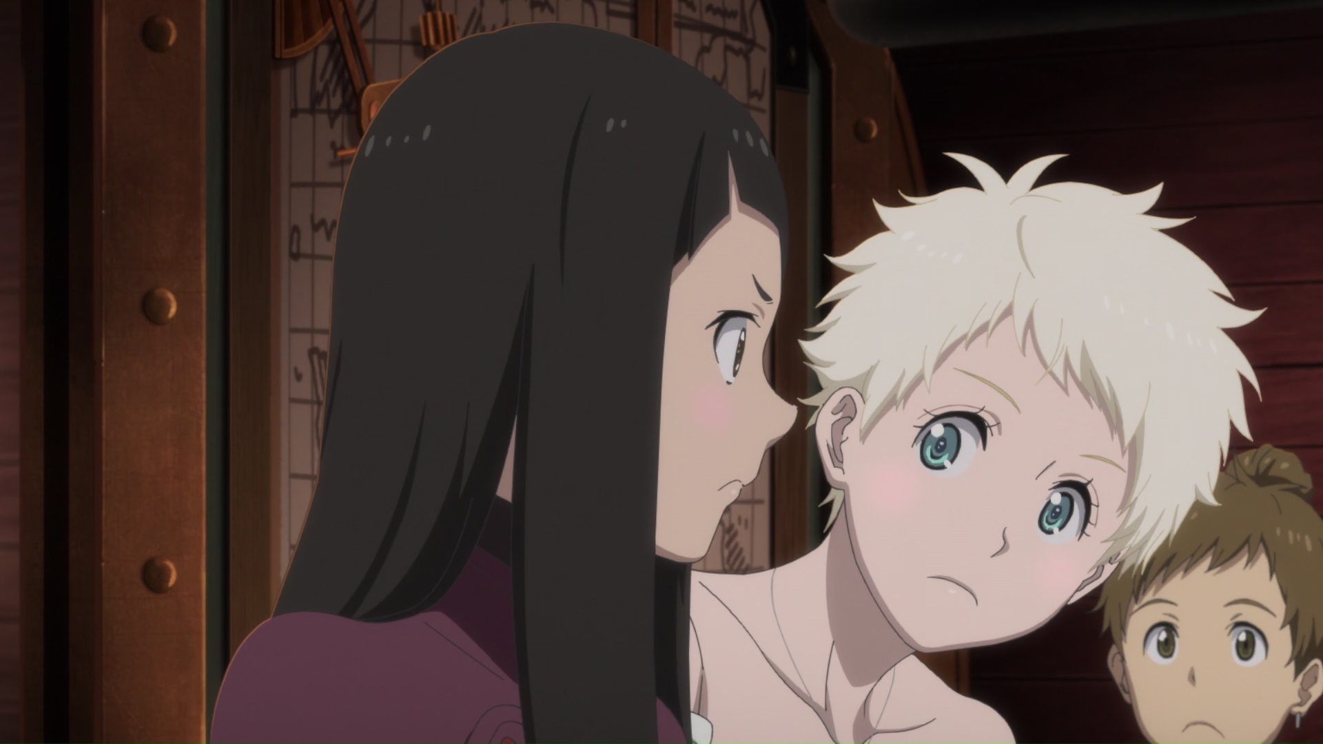 At the end of the episode, we see that the rude drunk was thrown overboard and drowned for failing to capture Fena. Inside the ship is the regal-looking blonde man, whose name we learn is Abel. He has a pale blue heart necklace like Fena does, so this only increases my suspicions that he’s tied to Fena somehow.