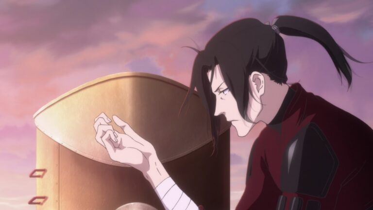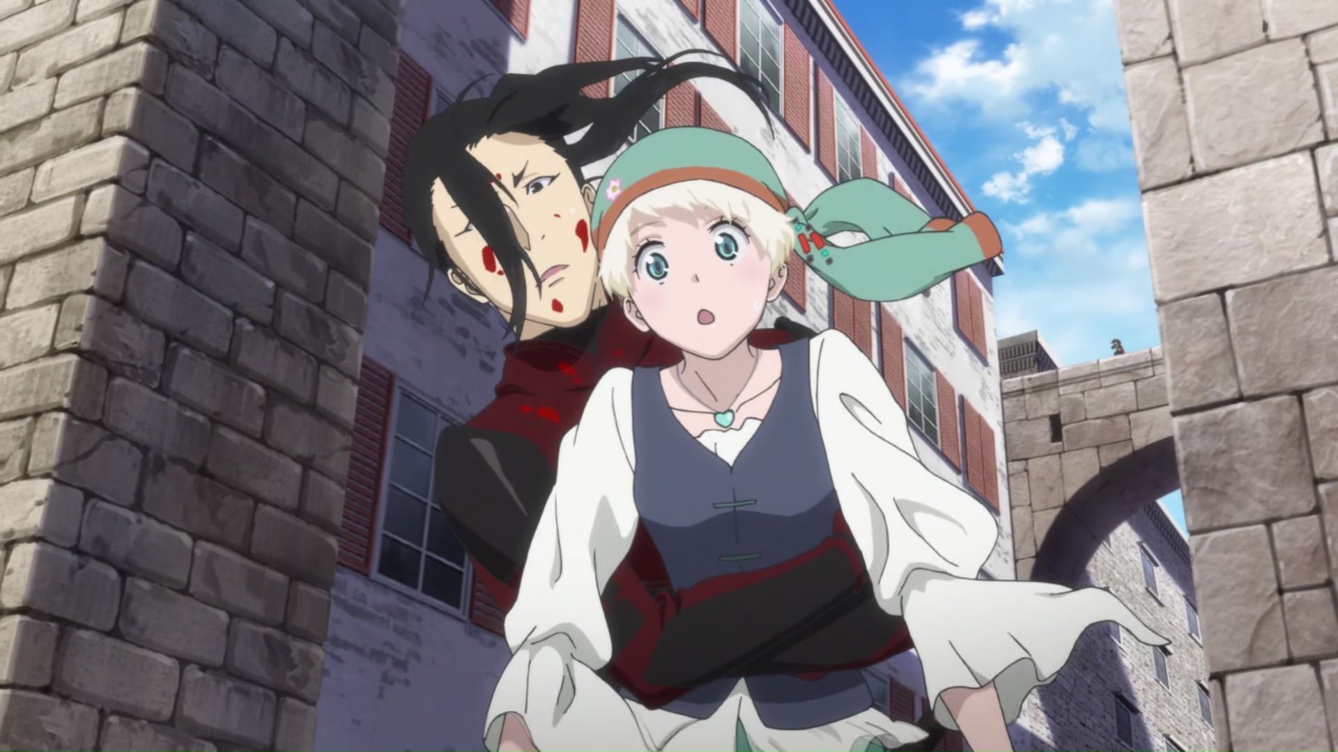 Yukimaru flees with Fena but the gunswoman Hannah catches up to them. Yukimaru carries Fena across the rooftops but is unable to escape a bullet fired by Hannah. It’s not a direct hit though, so Yukimaru and Fena are able to escape to safety.