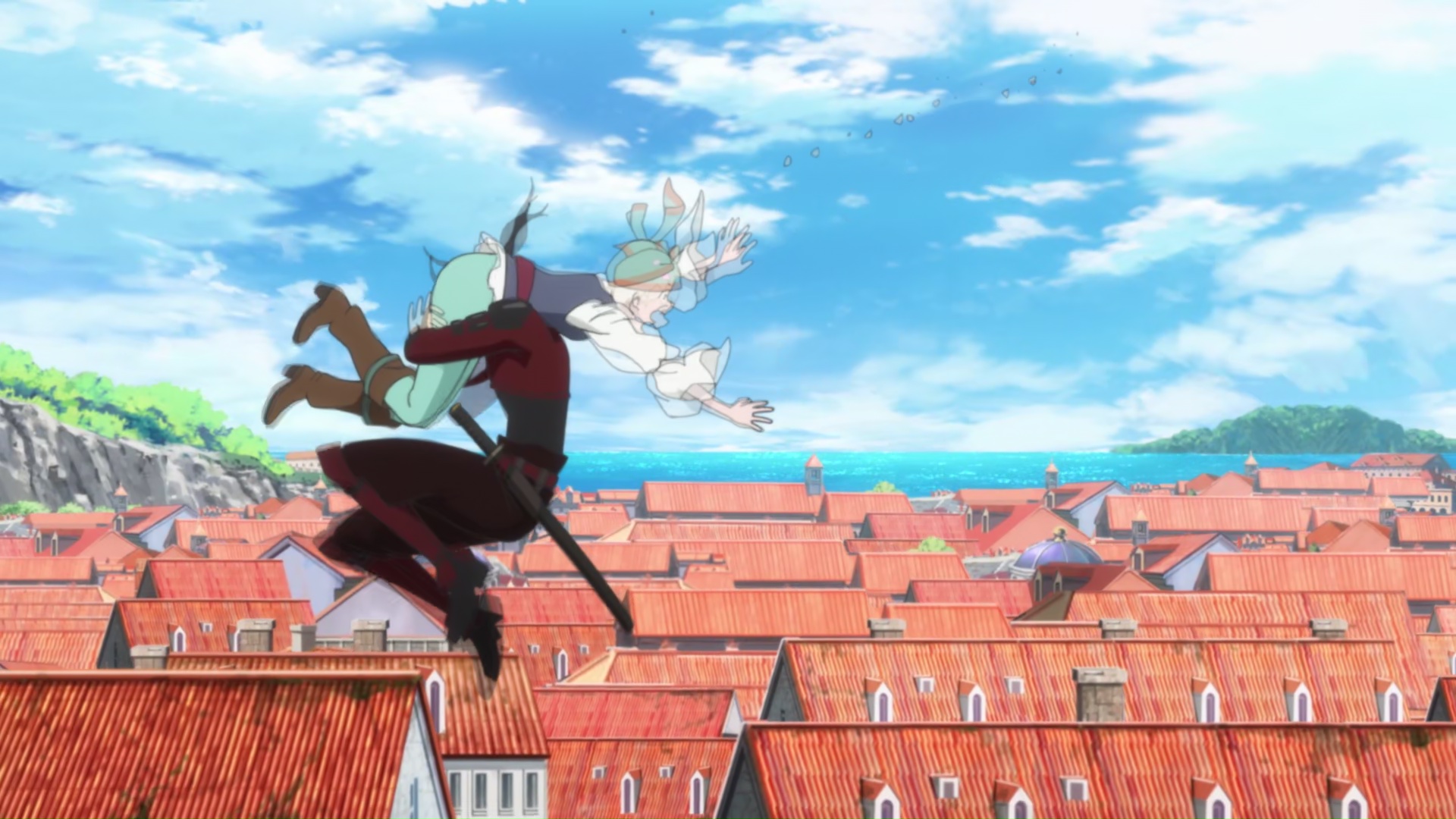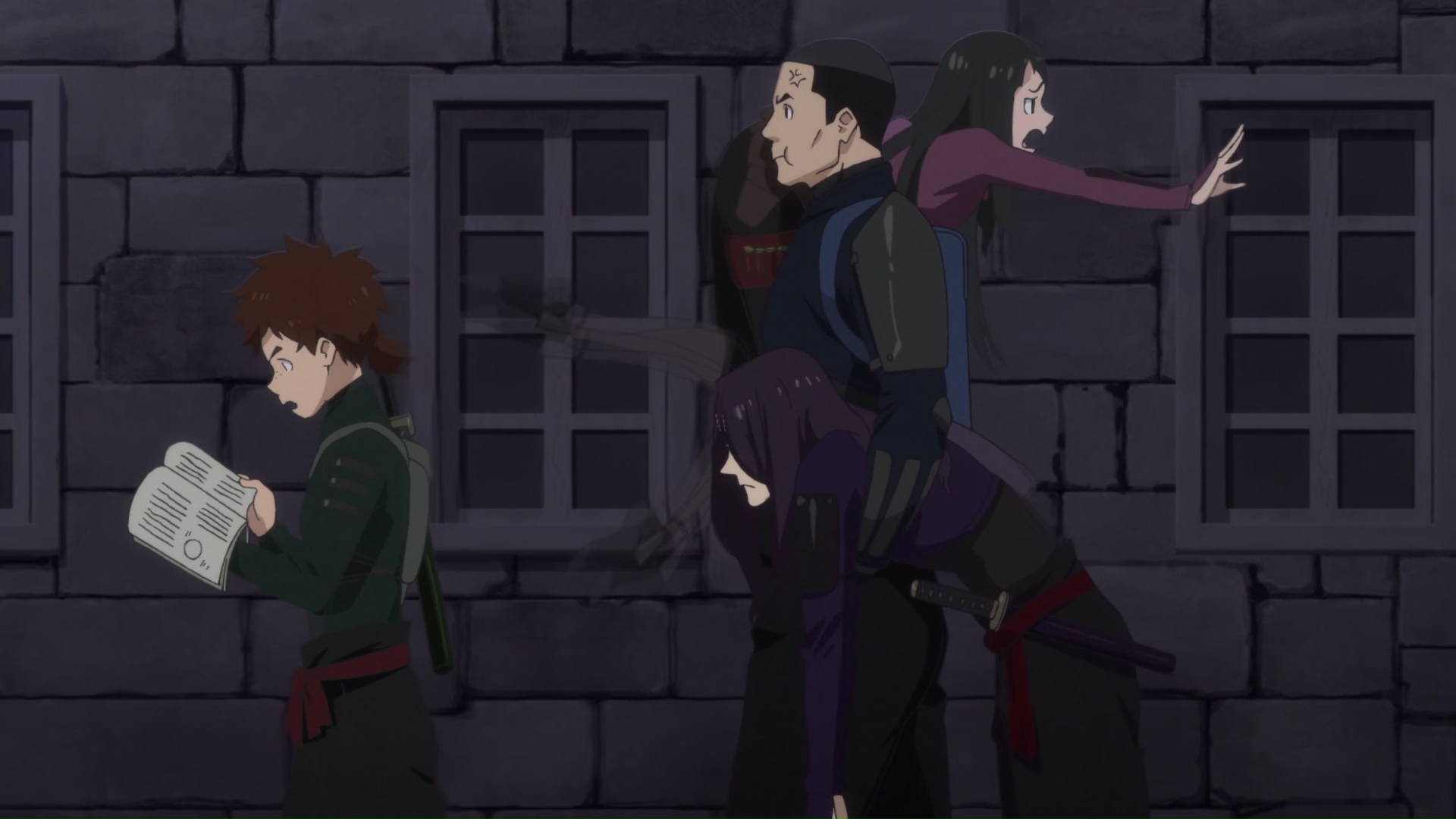 When Tsubaki, Makaba and Karin get back to the ship, it’s revealed that Fena and the twins never made it back. Yukimaru immediately runs back into the city to find Fena. And it’s a good thing that Yukimaru trusts his instincts because Enju and Kaede are in trouble. Or maybe not; apparently they were only hiding their real skills. My bad for forgetting that they are part of the infamous Goblin Knights. Either way, the twins cannot both fight and guard Fena at the same time.