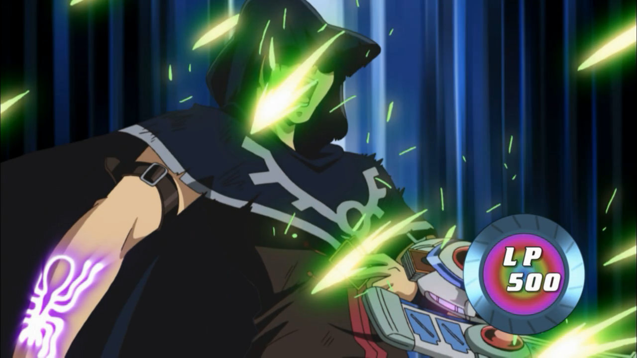 Unfortunately for him, even though they have yet to identify the fifth Signer, the emergence of the Crimson Dragon have prompted the Dark Signers to finally kick things into gear. These guys are certainly not the type to dally as they already taking the initiative to spread propaganda to have the public turn against the Crimson Signers by claiming the Crimson Dragon yearns for “blood and despair”, and will destroy Satellite while the City is left unscathed. And while they are doing that, they also using creepy little spiders to go around and take possession of various people to push that propaganda, and use as their proxy agents to attack Yusei and his fellow Signers. On top of that, these proxies going around picking fights is a problem because whoever gets locked into a duel with them will be pressed with the same danger they would face in volatile psychic duel where both players’ attacks can physically harm each other. While today’s proxy was seemingly spared, there is certainly an an ominous implication of the duelists being “locked” into the duel, unable to escape the ring that forms around them once they are engaged in battle, and the subject of being presented as sacrifices.