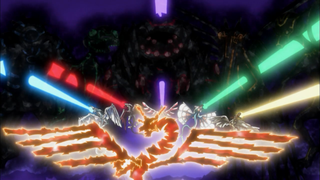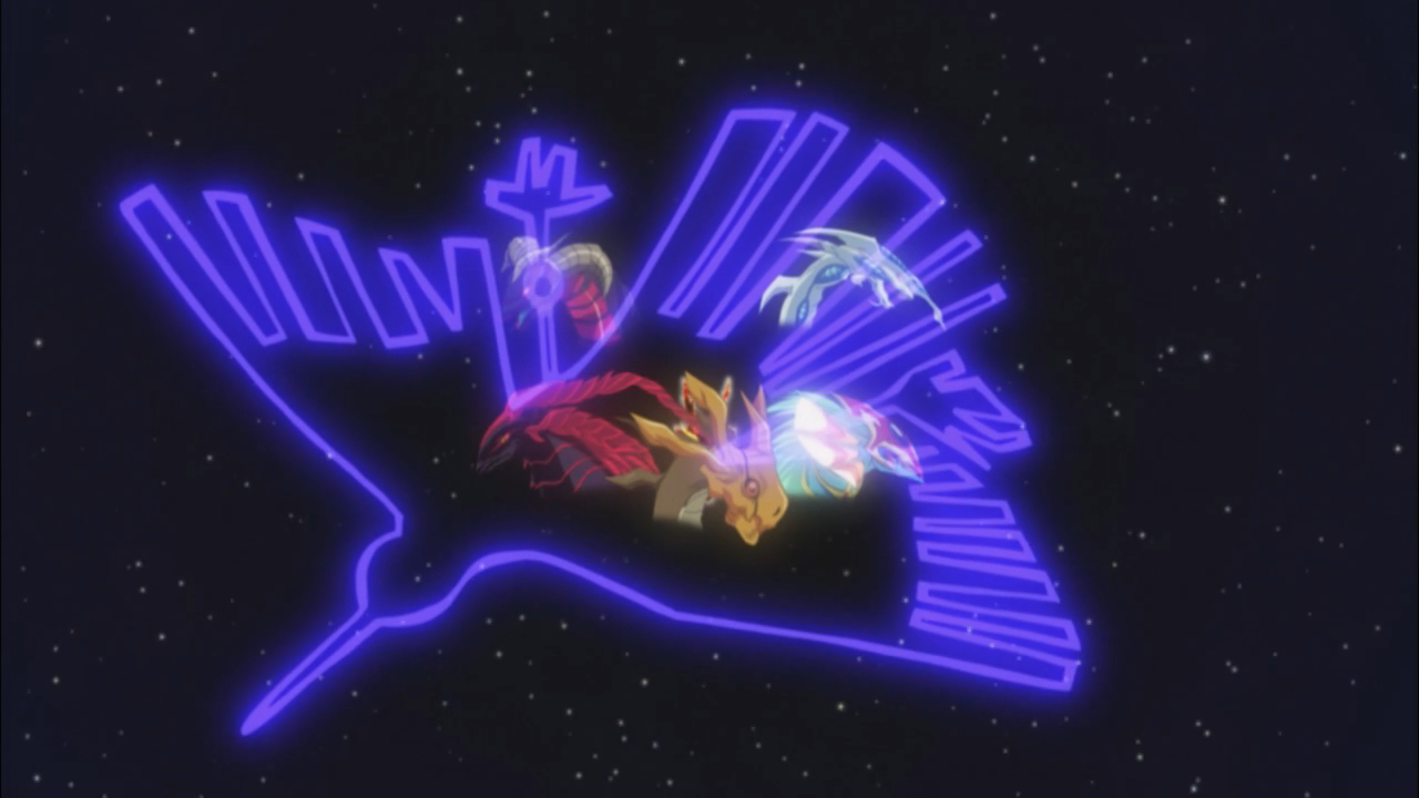 And speaking ominous forebodings, we saw how Rua was having a prophetic nightmare of five dragons (one of them looking awfully like her brother’s Power Tool Dragon- albeit, not quite the same but I digress,) battling the Dark Signers’ monsters. Of course Fairy Dragon is being dragged off into trouble. (And a quick reminder: Rua has yet to obtain Fairy Dragon’s card, as it is still in possession of another.)