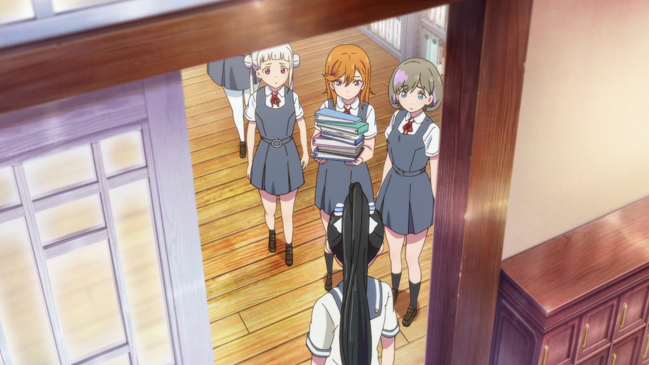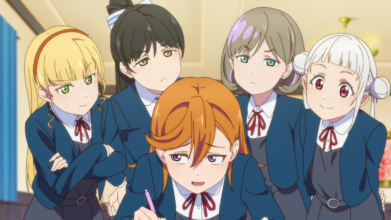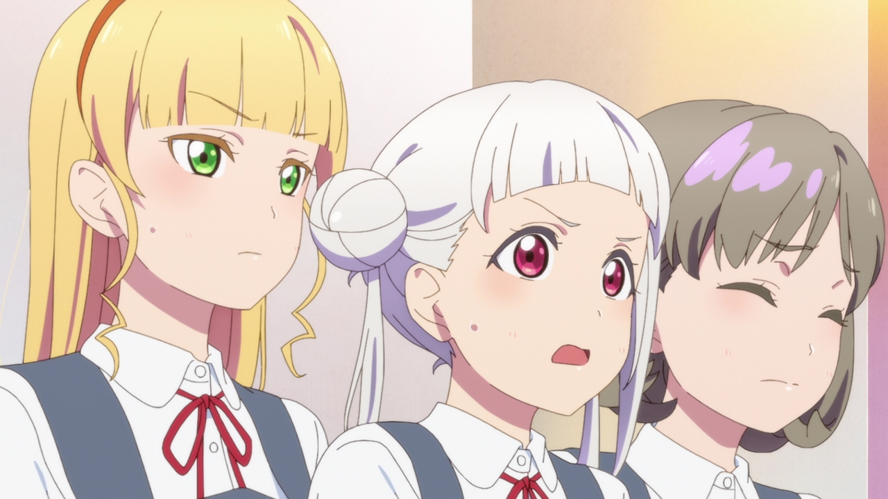 Now, the episode was fine. It was entertaining here and there but I have to mention something. And I feel bad because I feel like I’ve been complaining for the past two of three episodes, but there’s been something that’s been bugging me and it keeps happening which is: The girls rely too much on Kanon. Almost every major thing that happens with the group, the girls turn to Kanon to do something. The student council election? Obviously Kanon has to do it, even though she clearly doesn’t want to! Kanon you’re the leader, obviously you know the most about our group, you pick the name? The whole lyrics thing I guess makes sense since Kanon is the lyricist of the group, but the sheer pressure they put on her was kind of mean since they didn’t even offer helping her. I know each girl has their own role: Kanon the lyricist (sometimes composer), Keke the idol enthusiast with the most knowledge (understands the school idol world best), Sumire understands show business and fame (somewhat), Chisato the choreographer, and Ren the composer and choreography as well. I think it’s great that each girl has a role of their own they excel at and are a great asset to the group, but I just feel there’s too much dependence on Kanon for almost everything. Whenever a decision for the group has to be made, Kanon is always the one that has to make it. Keke always pins everything on her, even when Kanon looks uncomfortable or clearly needs some help. And I don’t know, it’s just rubbing me the wrong way. It puts all this pressure on Kanon, and the rest of the girls don’t seem to have their own opinions. Or when they do have their own opinions, the show purposely makes them too silly so Kanon can have the spotlight again.