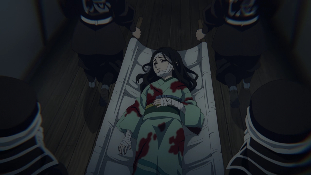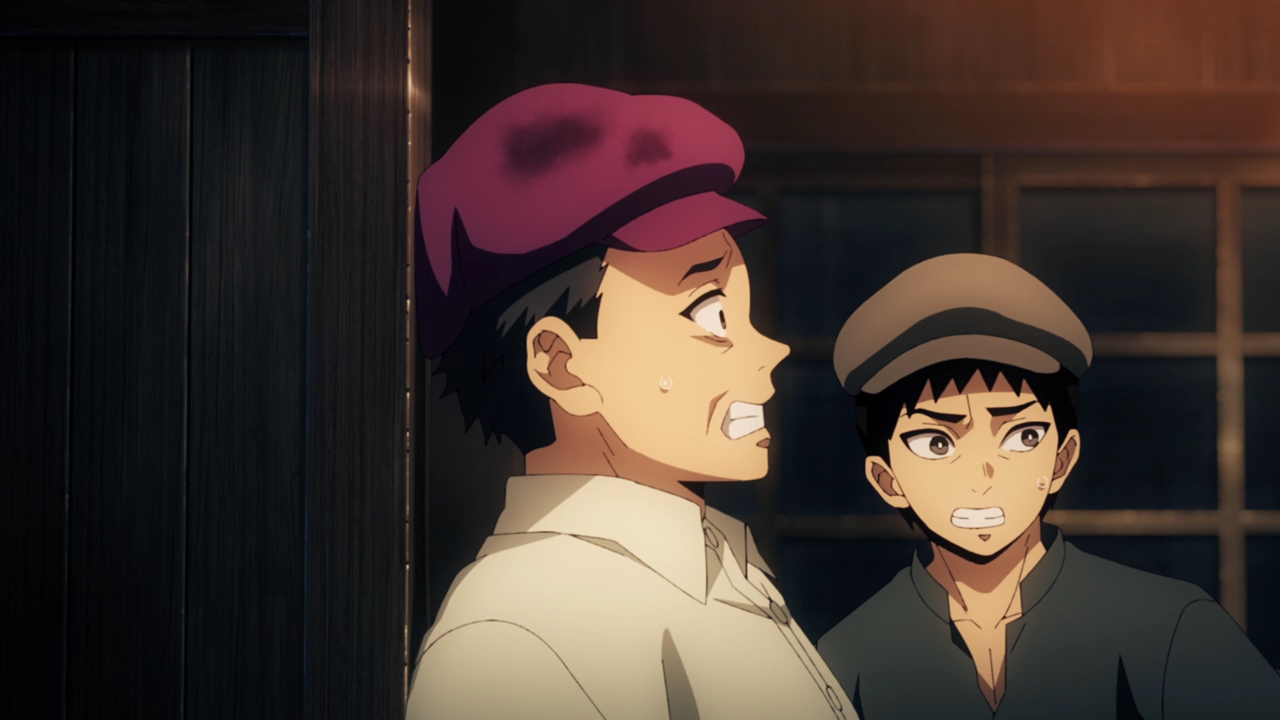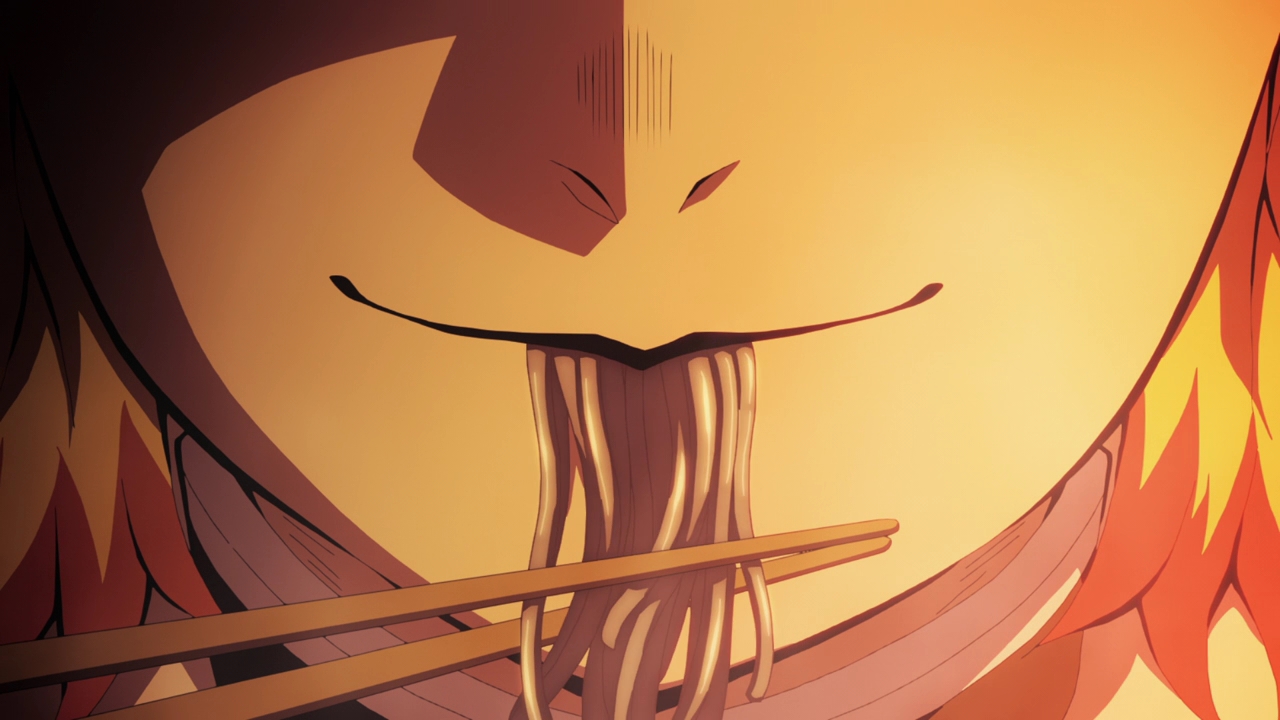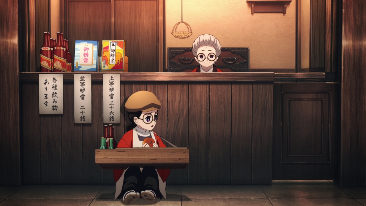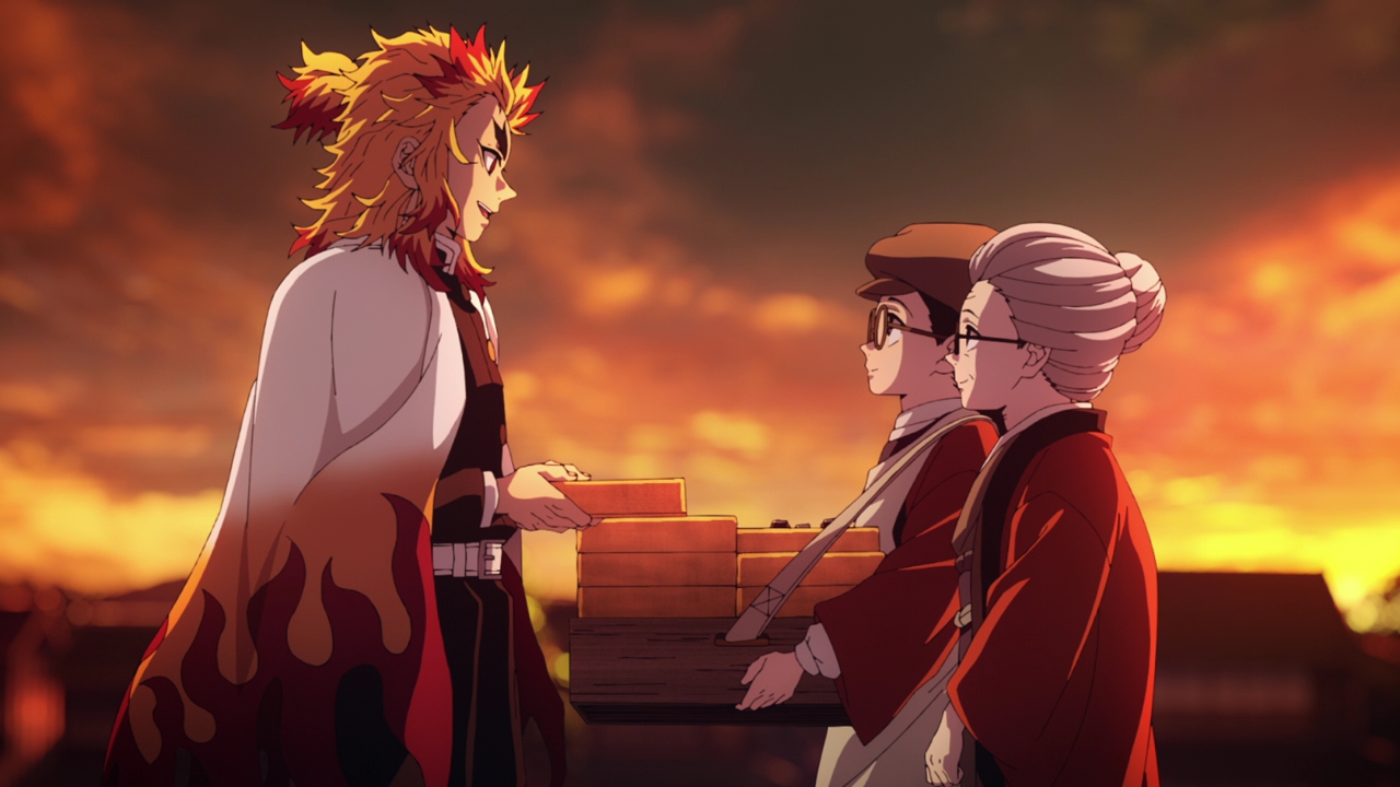 So this first episode, which was not in the movie, follows Rengoku as he goes on his mission to find the demon on the loose responsible for the 40 missing people and for the Mugen train. And my god the amount of delicious detail for the food in the beginning was amazing. Ufotable really made that soup look amazing and now I’m craving it. Delicious! Rengoku hears of a demon called Slasher who has been causing fear and panic in the town, who seems to be the demon he’s looking for as it uses trains to get around. This leads to Rengoku going around finding clues, and then meets with our bento grandma/granddaughter duo. And even if their time is short with us, I did like the relationship Rengoku ended up forming with them. And the fact that his family has a connection with them, what a coincidence. So it makes me wonder if we’ll see these two again in the future.