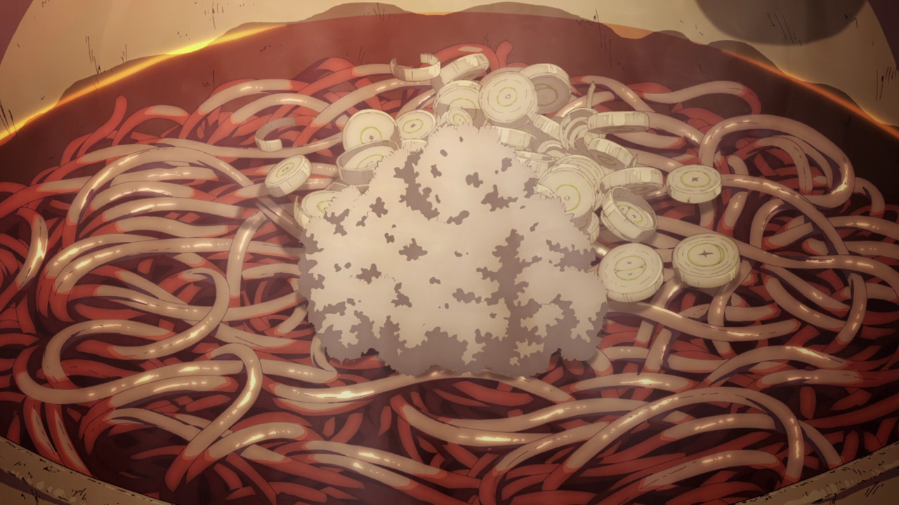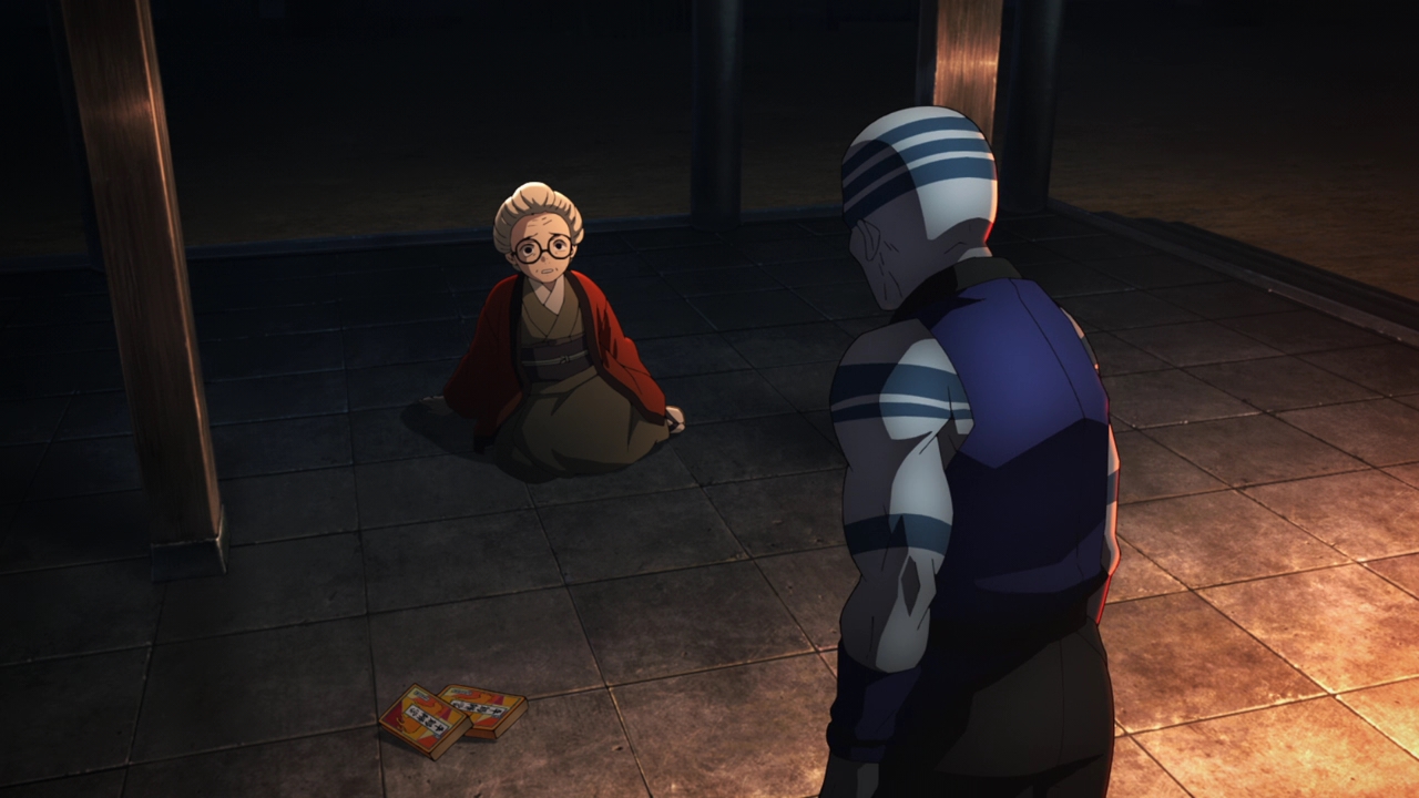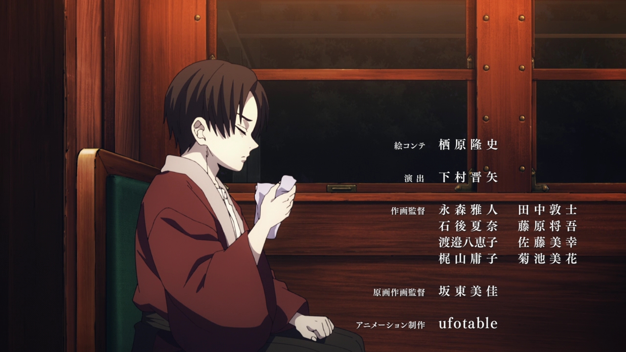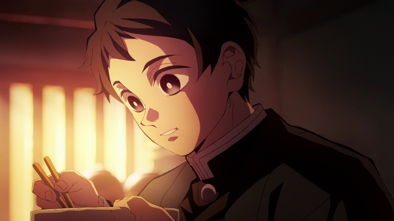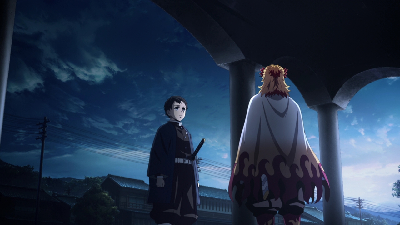So this first episode, which was not in the movie, follows Rengoku as he goes on his mission to find the demon on the loose responsible for the 40 missing people and for the Mugen train. And my god the amount of delicious detail for the food in the beginning was amazing. Ufotable really made that soup look amazing and now I’m craving it. Delicious! Rengoku hears of a demon called Slasher who has been causing fear and panic in the town, who seems to be the demon he’s looking for as it uses trains to get around. This leads to Rengoku going around finding clues, and then meets with our bento grandma/granddaughter duo. And even if their time is short with us, I did like the relationship Rengoku ended up forming with them. And the fact that his family has a connection with them, what a coincidence. So it makes me wonder if we’ll see these two again in the future.