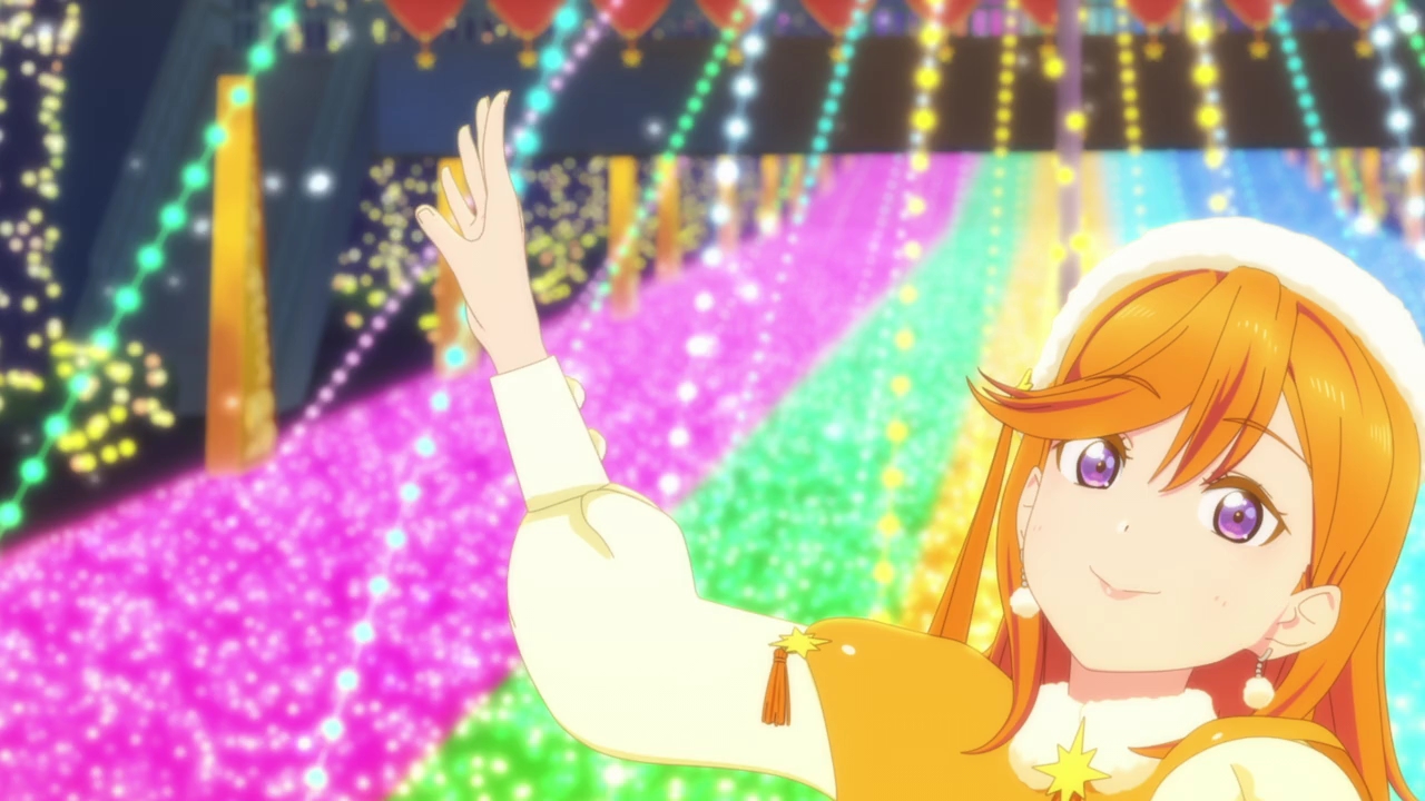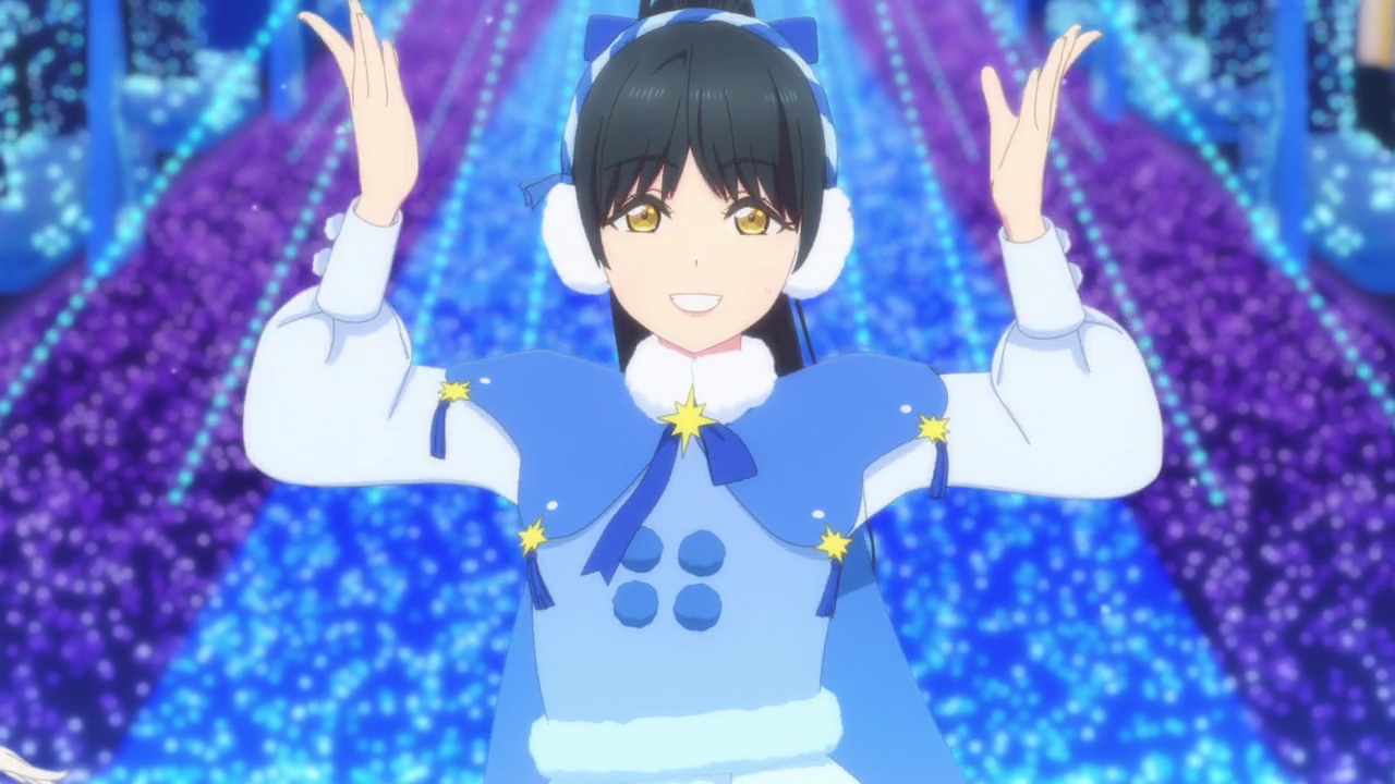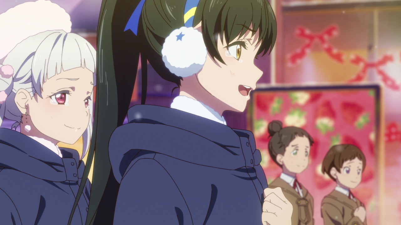 I’m just going to combine both my episode review and final review together as there wasn’t much to say about the finale. It was pretty straightforward as Liella fought to win the Tokyo qualifications. Their theme was to perform near their campus and on Christmas, so it was no surprise that we got a pretty winter performance. Most of the episode was spent with the girls practicing and also trying to find somewhere to perform. Kanon’s classmates volunteer to make the “starry stage” for them in the gym, which ended up being a stage down the street. It ended up looking gorgeous. However in the end, Liella ends up in second place behind Sunny Passion.