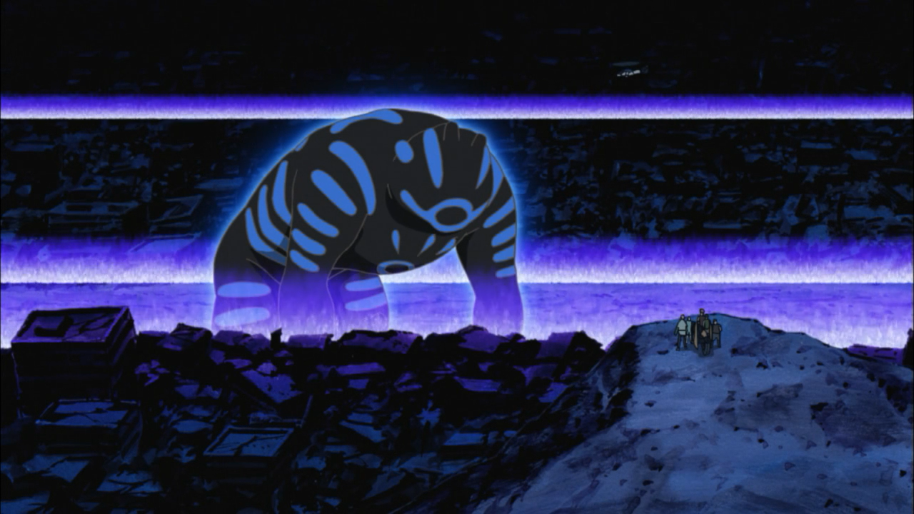 Unfortunately we don’t get to see the rest of that story because before we could, Yusei accidentally dug his own grave when he forced Kiryu to draw and destroyed Hundred-Eyes Dragon. You always know the protagonist is screwed when the side characters start singing praises and how they are so sure they are on the path to victory. Jack however saw through it, and realized that the card Kiryu drew was bound to be trouble. That isn’t to say Yusei didn’t land quite a punch on him, as he did managed to knock him down to 900 LP. However the cost of doing that was too great. The card Kiryu drew was none other than his true ace: Earthbound Immortal Ccapac Apu. This monster ain’t small, it’s gigantic, and it’s one of those types that requires consuming souls to be used. As such, the people who have gone missing in Satellite have been herded together in preparation to be serve as such sacrifice.