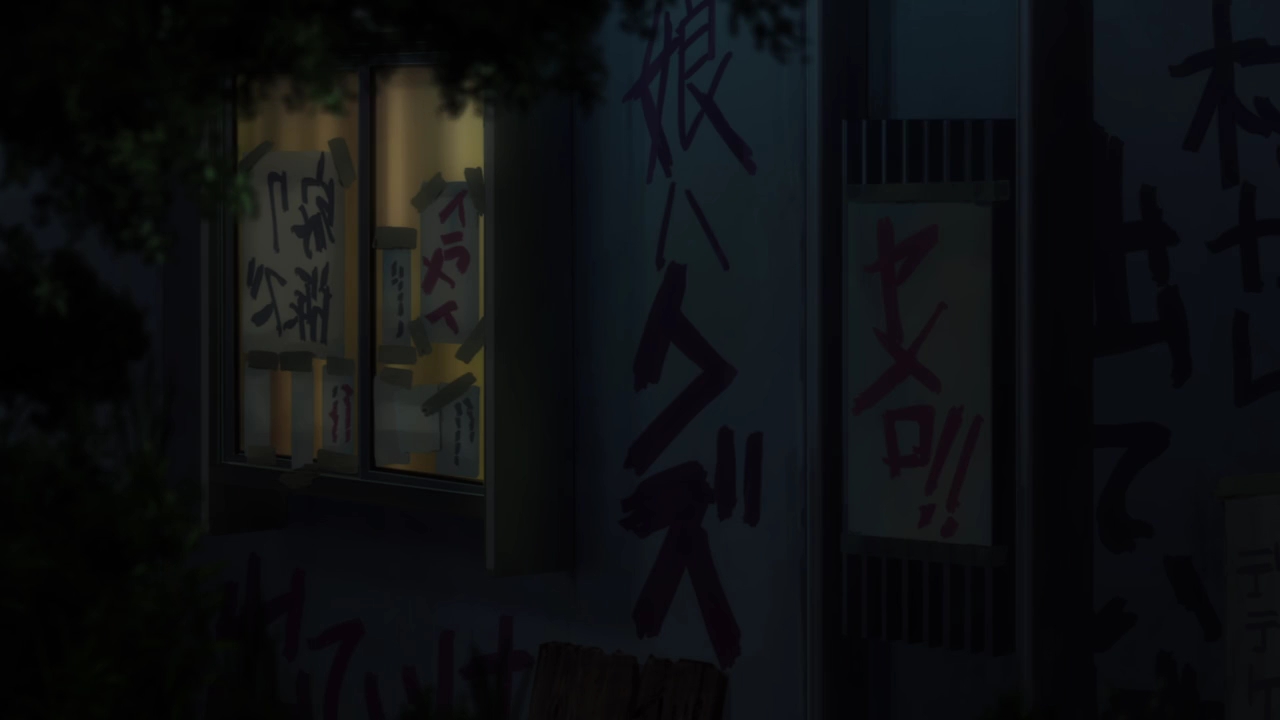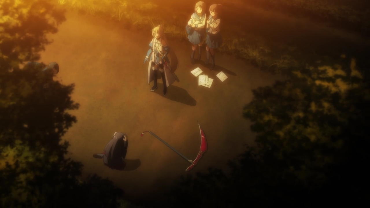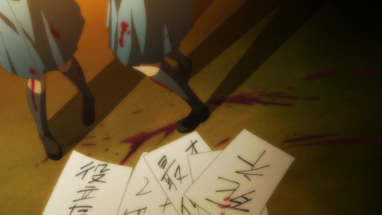I understand Chikage, though. Obviously Chikage grew up in a horrible environment with a drunk father who may have been violent, and I’m not exactly sure about her mother but she didn’t seem like a good one either. The visuals of the home was good enough with all the trash and beer cans everywhere that we got a good idea of the home life. And living in a small village, rumors spread quick and I guess her mother’s affair became public. I don’t understand the whole taxing thing, but amazing that other people will gladly write whore and slut on a house because someone had an affair. Why would you care? I don’t know, there’s probably sooooo much they left out that I kind of have to piece things together myself. It also appears that Chikage already was mentally weak from the bullying she endured from her classmates and village, so having that on top of losing two of her friends horrifically and the general public talking smack about them put her on the brink of insanity. AND…their powers. Their trump card, the black haired girl with the red ribbon said. Which…did they ever introduce us to her? Who is she? This damn season…
