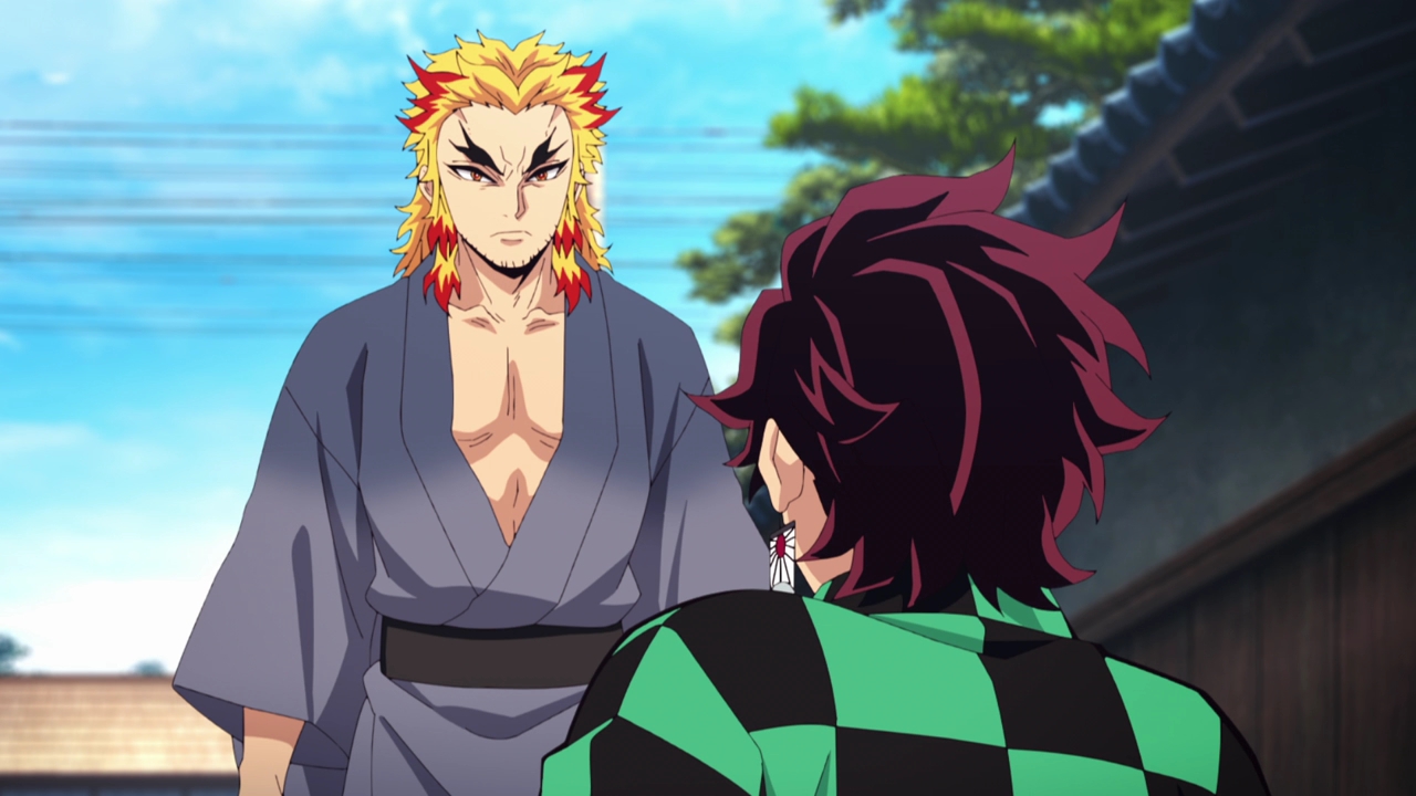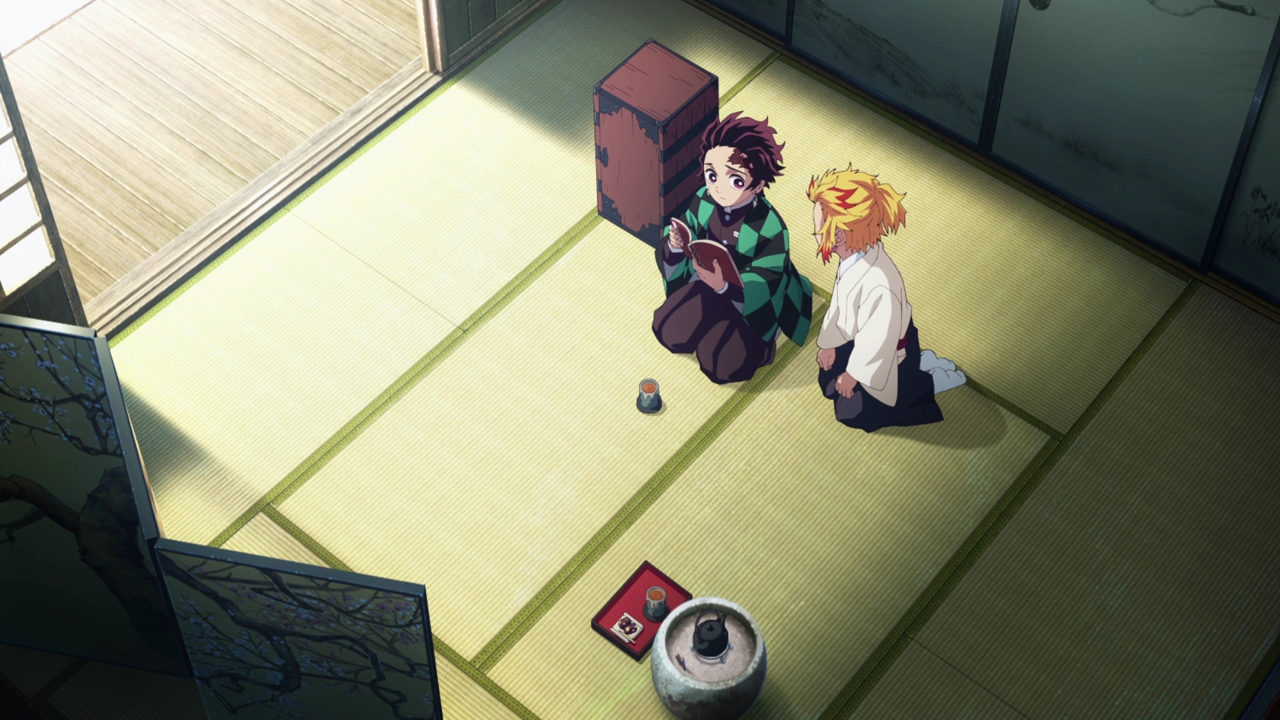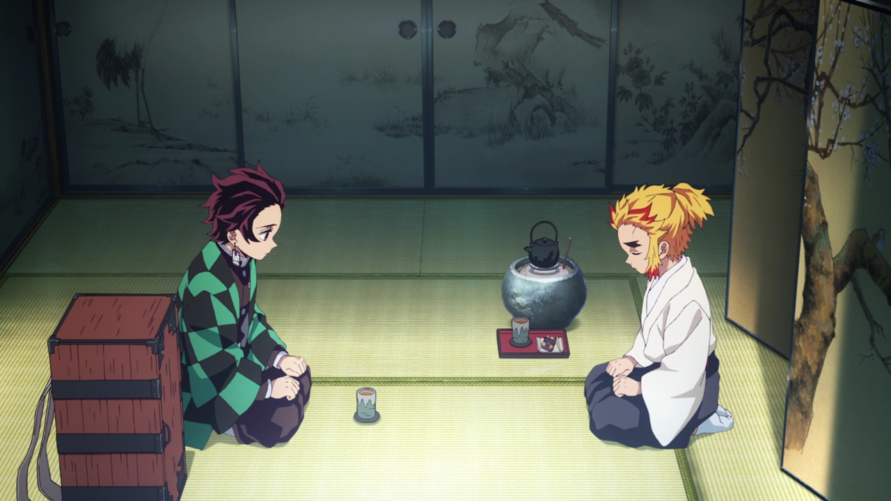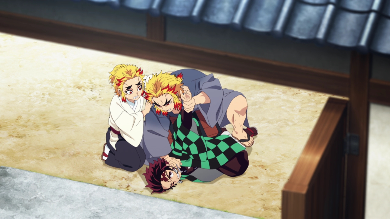 With Rengoku’s last words prompting Tanjiro, he follows his crow to the Rengoku residence where he immediately meets Senjuro. Now, the second I saw him collapse after the crow told Senjuro the news of his brother’s death hurt me so I was dreading this moment because I knew it would be full of emotions. Well, it sure was. All kinds of emotions! Sadness, anger, frustration, pondering. First of all, there was a lot that was going on with Rengoku’s father. He came off as harsh, rude, and just kind of an ass. Well, no, not kind of. He was very much an ass. Hitting Senjuro, yelling at him to quit his crying, saying all kinds of terrible things about Rengoku. As well as getting all aggressive and defensive at Tanjiro even though he clearly had no idea what he was talking about when he mentioned the Sun-breathing technique. He at least intrigues me, because even with how much of a bum he is, we know that Rengoku loved and cared about him, accepting him for who he was. His father had thought his last words would be of him calling out this behavior, but it was nothing more than “Please take care of yourself.” And that was enough to break him and finally, I imagine for the first time since receiving the news of his death, make him cry. That got me. He intrigues me because he wasn’t like this all the time as he was a Hashira himself before and we saw from flashbacks that he was a different person. What happened to make him go against everything he believed in?