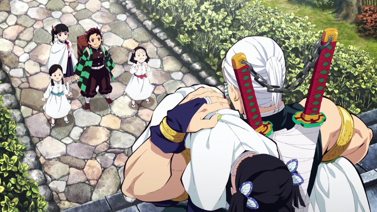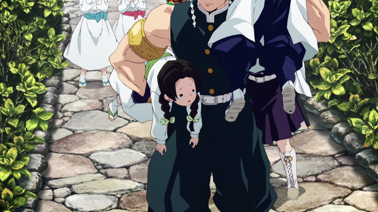 Tengen the former shinobi! Finally, it’s your turn to shine! I like how the opening mirrors the same way Tanjiro and Rengoku did during the Mugen Train Arc, emphasizing how Tengen would be the one to guide Tanjiro and his friends this time. I’ve been waiting for the dynamic between Tanjiro and his friends with Tengen! Unlike the friendly and considerate Rengoku, Tengen has no consideration whatsoever with how the other Corps member feels as long as he got the job done (if not, there’s no way he would just kidnap girls for his mission while ignoring their plea). He said he didn’t need Shinobu’s permission to bring the girls for his mission, but I doubt Shinobu would stay quiet if she knew this. (^_^;)