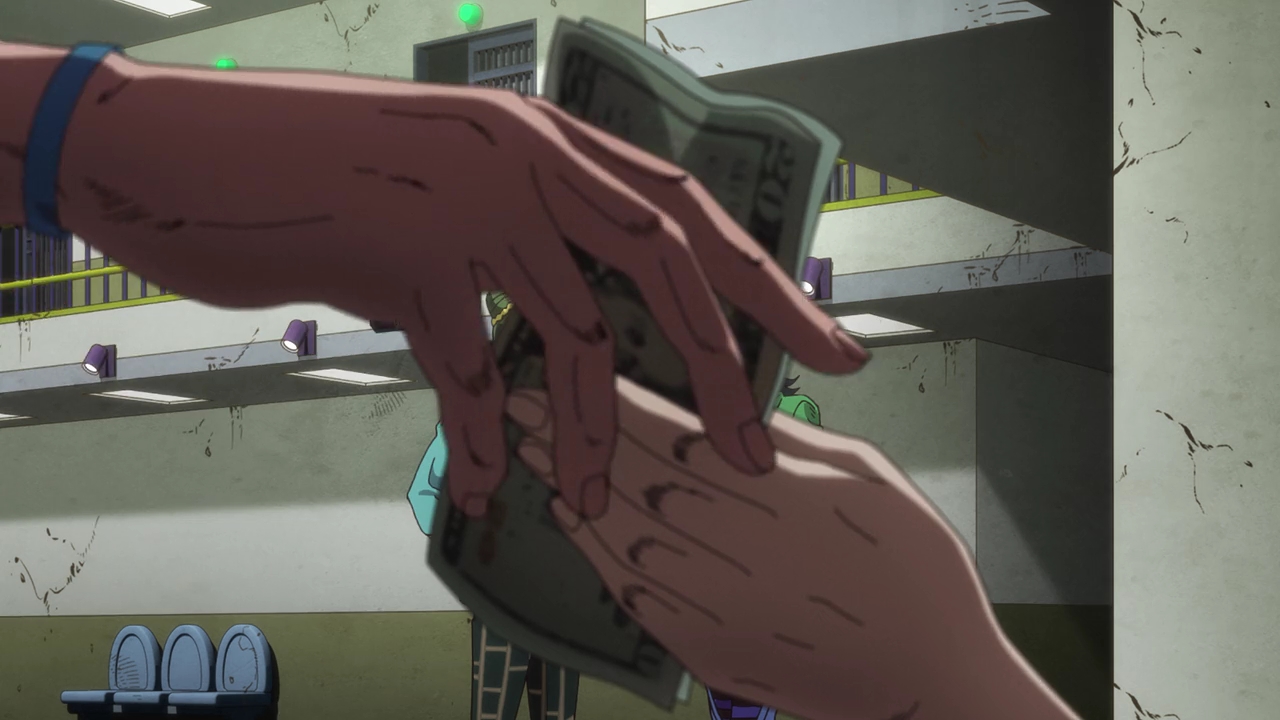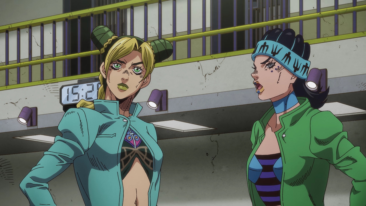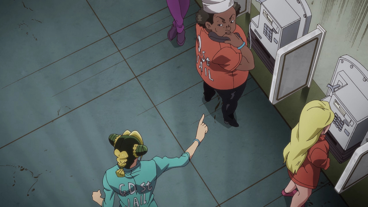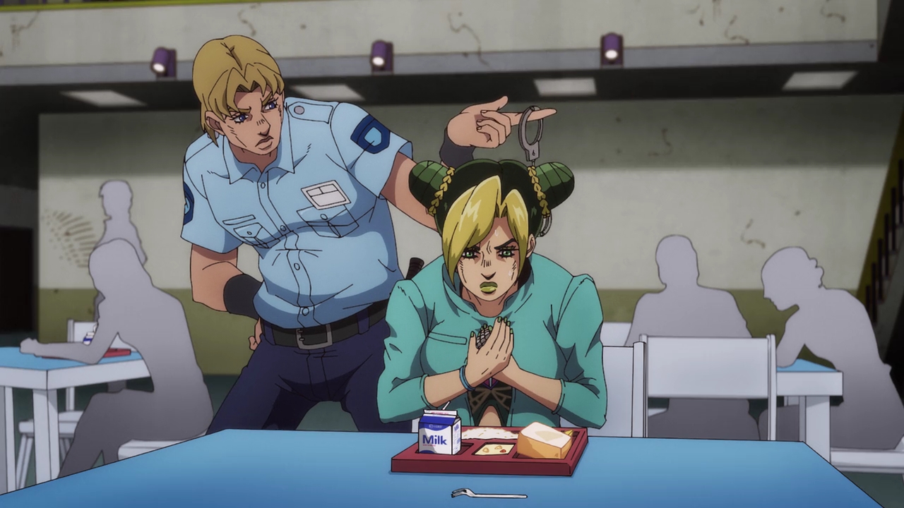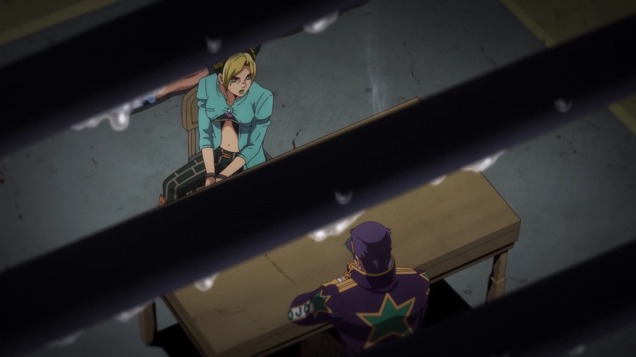 We see a bit more of the prison, mainly of how things are run there. Jolyne tries to use a pay phone to speak with her mother, but learns that there’s a certain system in place for the prisoners. There’s lots of systems running rampant in the prison, such as the business with lending money and not landing yourself as the target in the prison. Gwess is still around, but at least this time she’s not here to screw Jolyne over anymore. She gives her some pretty good advice about her lending the dollar to the girl on the phone. Not being able to extort the money back makes you a target to the other inmates as a pushover, leading to daily bullying in a place that already feels like a living hell. And Jolyne makes her presence known among the other inmates as she was able to get $10 from the girl she borrowed the money to, though having a Stand certainly helps. But what I love, other than the fact that Jolyne won’t stand for people treating her like crap, she won’t let others treat others like crap either. I loved that Jolyne also messed with the other inmates so the bullied girl could her get chance to get her money back. It says a lot about Jolyne that she would give her the opportunity to do this, while also giving her the advice that it’s only up to you to survive in a place like this, so find that strength. Just like Gwess giving her some advice, Jolyne imparts some advice of her own.