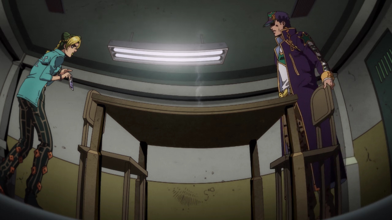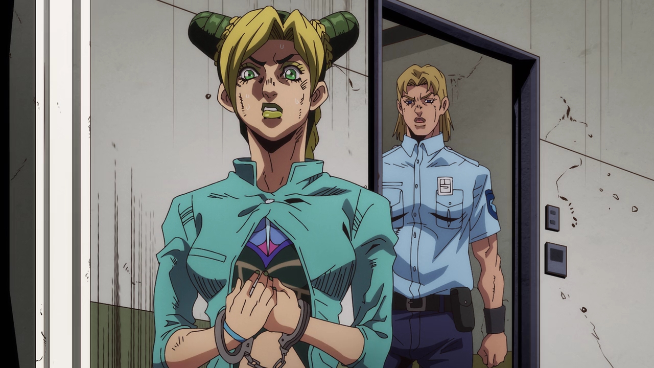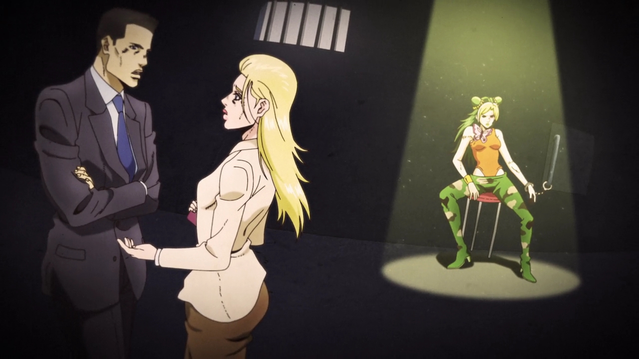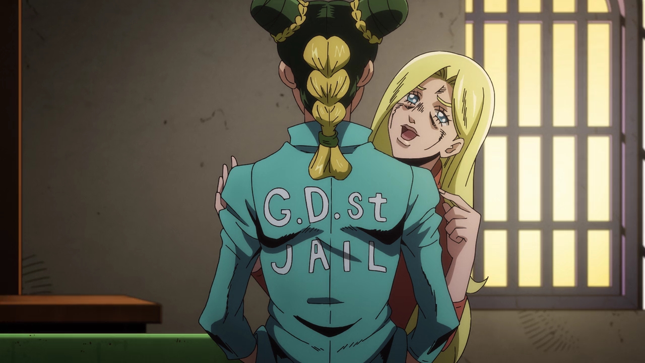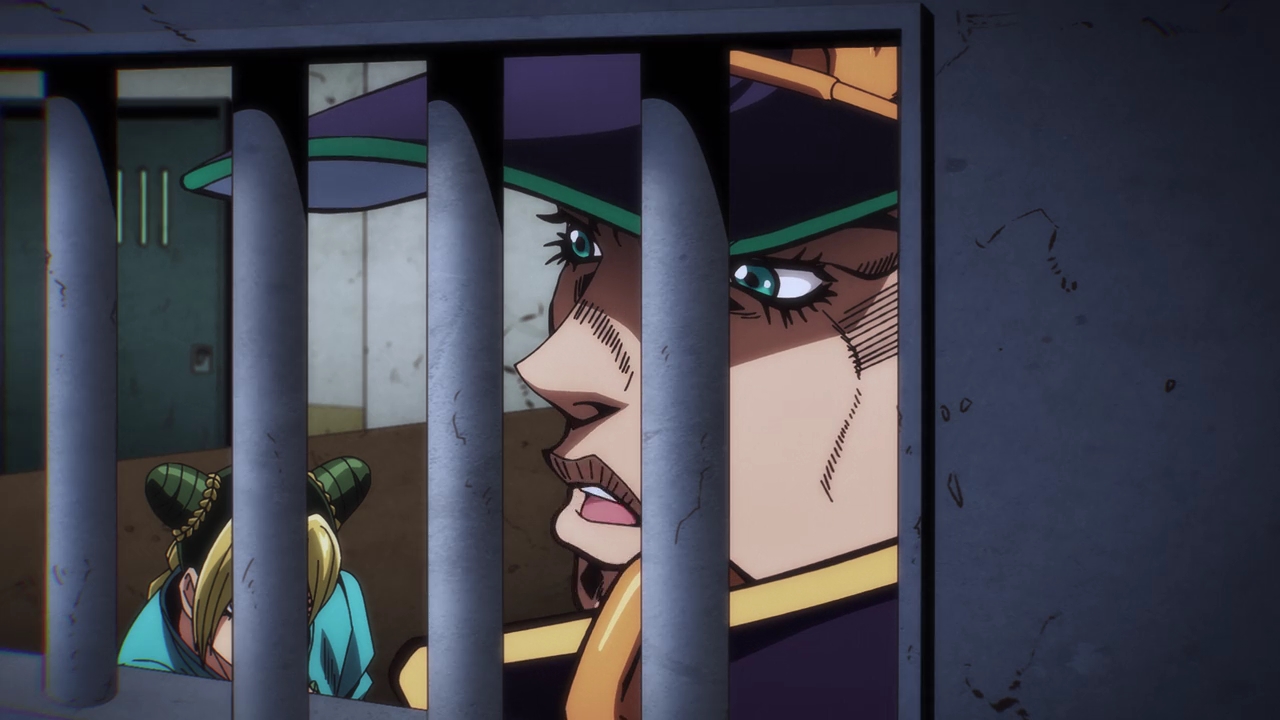 And to really show us how broken this family is, we get a very quick flashback of Jolyne getting into trouble and Jotaro not being there. Thanks for making it painful already. And Jolyne is NOT happy to see him at all, in fact she gets so mad that she knocks out the guard, ruining her chances of being able to leave. It’s not the warmest of welcomes after…I’m not sure how long they haven’t seen each other, as Jotaro immediately goes straight into business. We learn that Jolyne was completely framed from the very start by a man named Johngalli who happens to be follower of Dio’s. And since Jolyne is a descendant of the Joestar family, she’s automatically a target of Dio’s grudge, even if she has nothing to do with anything that happened back in Egypt. But how and why does Dio have followers after all this time? There’s still so much to unravel, and at least that gives an explanation for some things. But it also comes into question how Jotaro was able to find all of this out in the first place to give Jolyne such a detailed explanation of this Johngalli A guy. There’s a lot going on here that will be revealed soon. And before they could even come up with a plan of getting Jolyne out of prison, they’re already under attack by Johngalli’s Stand.