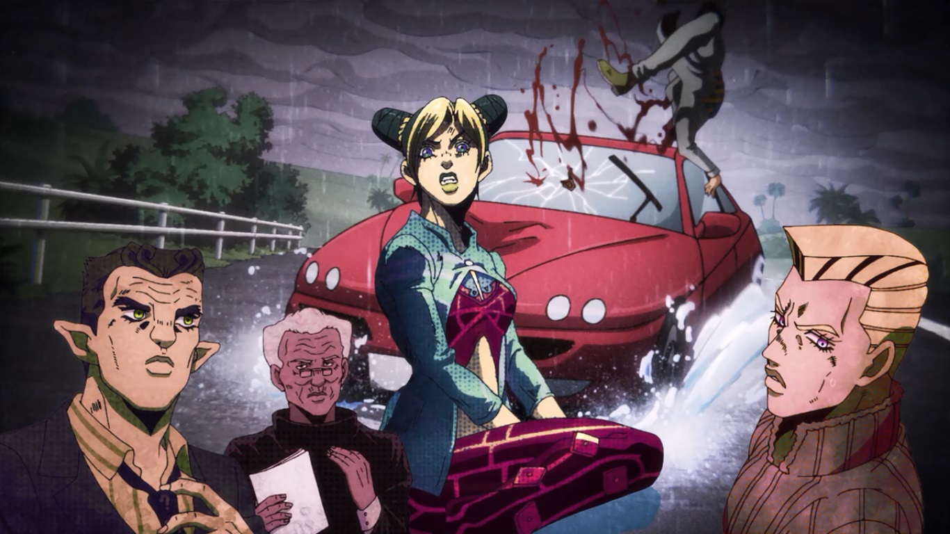 The episode ends with Jotaro’s protecting Jolyne and getting a shot from Johngalli’s Stand, so we’ll see the father-daughter duo fare next time. And trust me, things are only going to get weirder and weirder.