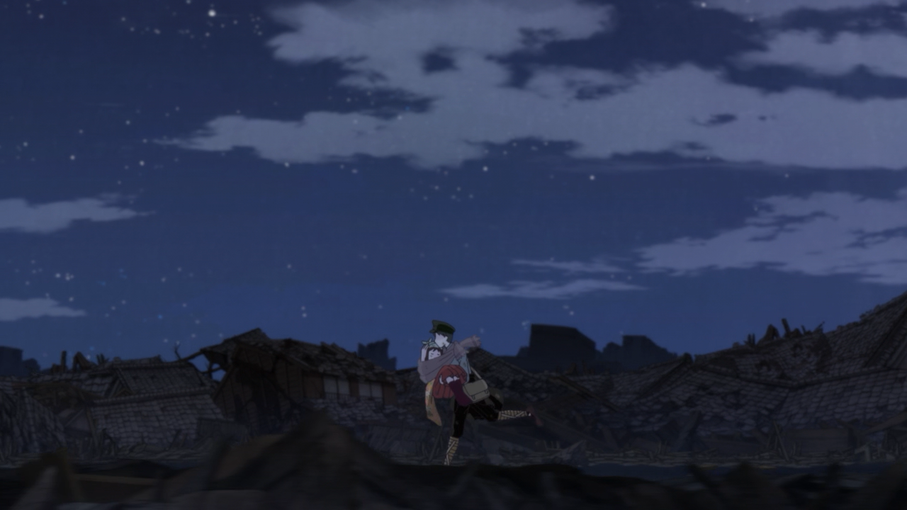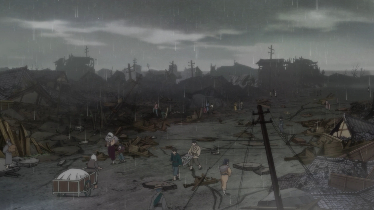 Tamahiko and Ryo make the journey to Tokyo together since Ryo wanted to find her brother Ryotaro. It took several days to get to Tokyo by foot, and along the way they both witnessed and heard about the horrors of the aftermath of the quake. When they arrived in Tokyo, the only thing that was left standing was the Tokyo Station, everything else was rubble or had burned down from the fires.