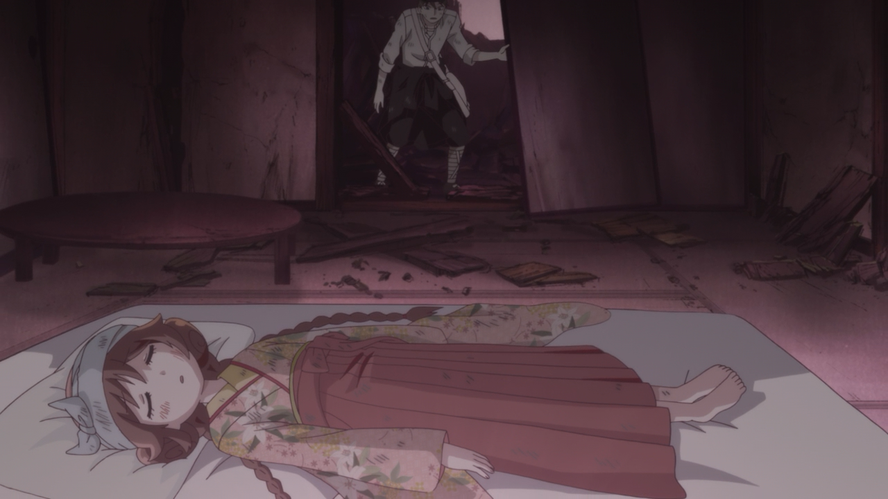 There Tamahiko was able to meet with his uncle and his Tamako, who joins him in his search for Yuzuki. They spend several days searching and eventually find a small lead when they happen to encounter Yuzuki’s friend Midori. They were able to identify her thanks to the talismen she had been holding that Tamahiko gifted her for safe child-birth. We learned that Midori and Yuzuki did get injured from the quake, but the real problem was when the fires broke out and separated the two. Yuzuki spent many days wandering and eventually encountered the children who had been separated from their parents. They were the ones who took care of her when she fell unconscious, and were also responsible for leading Tamahiko to her by the miraculous chance.