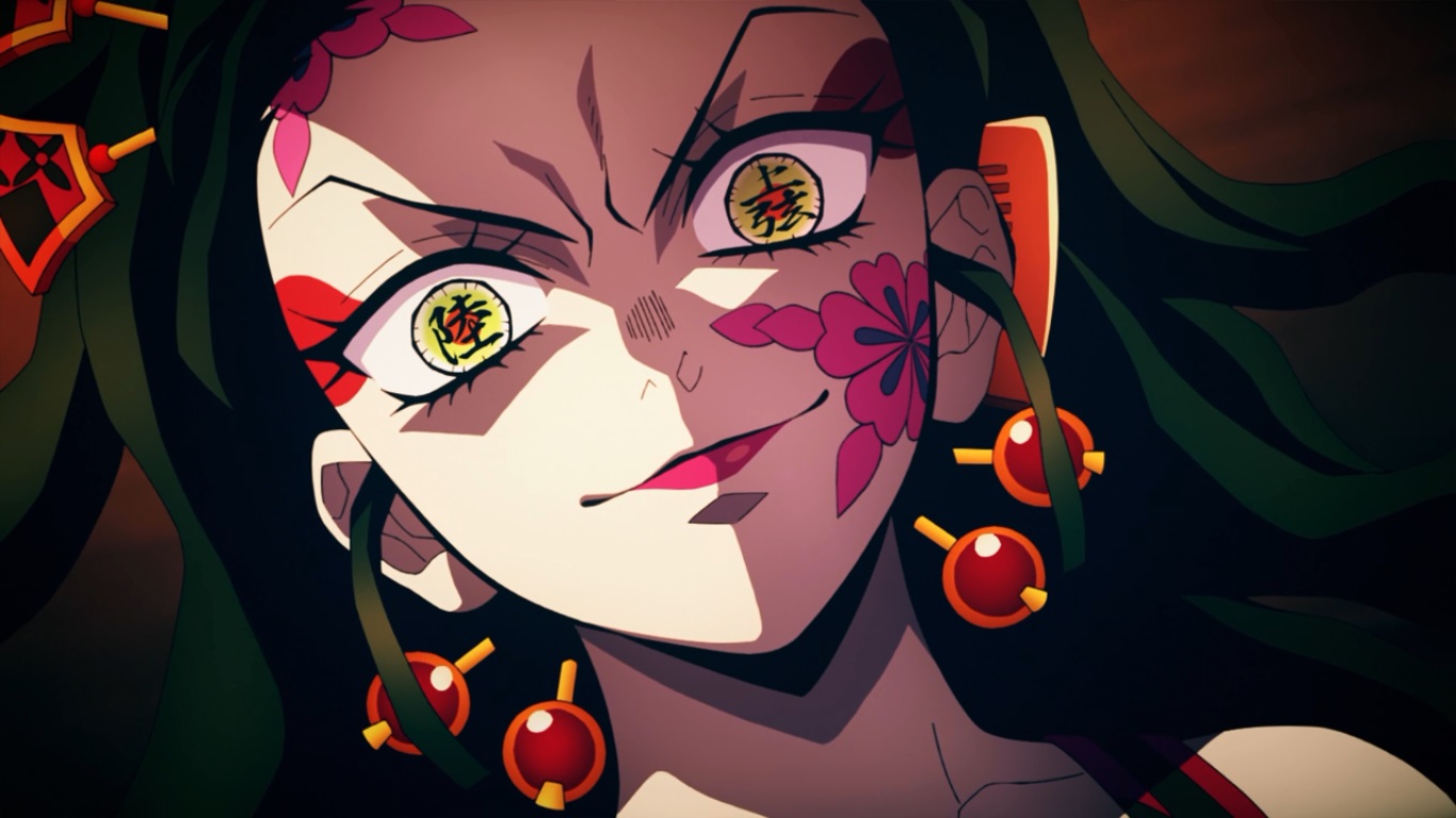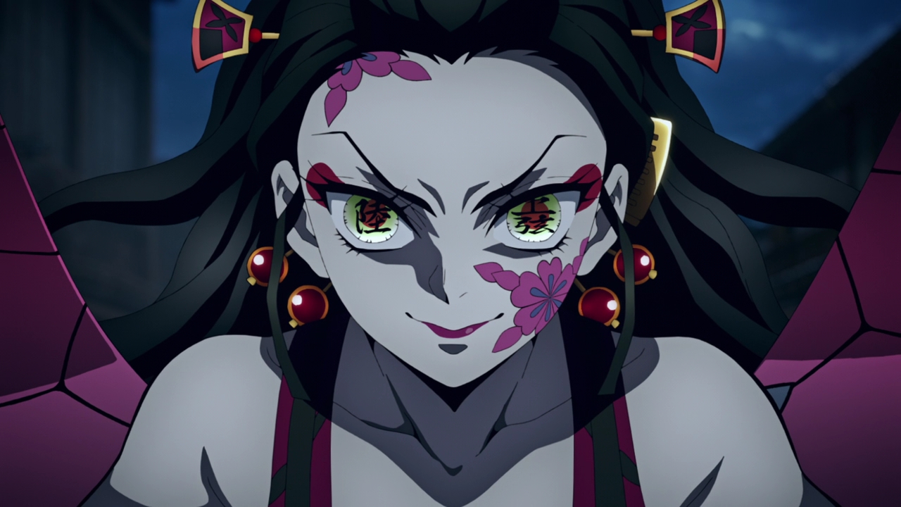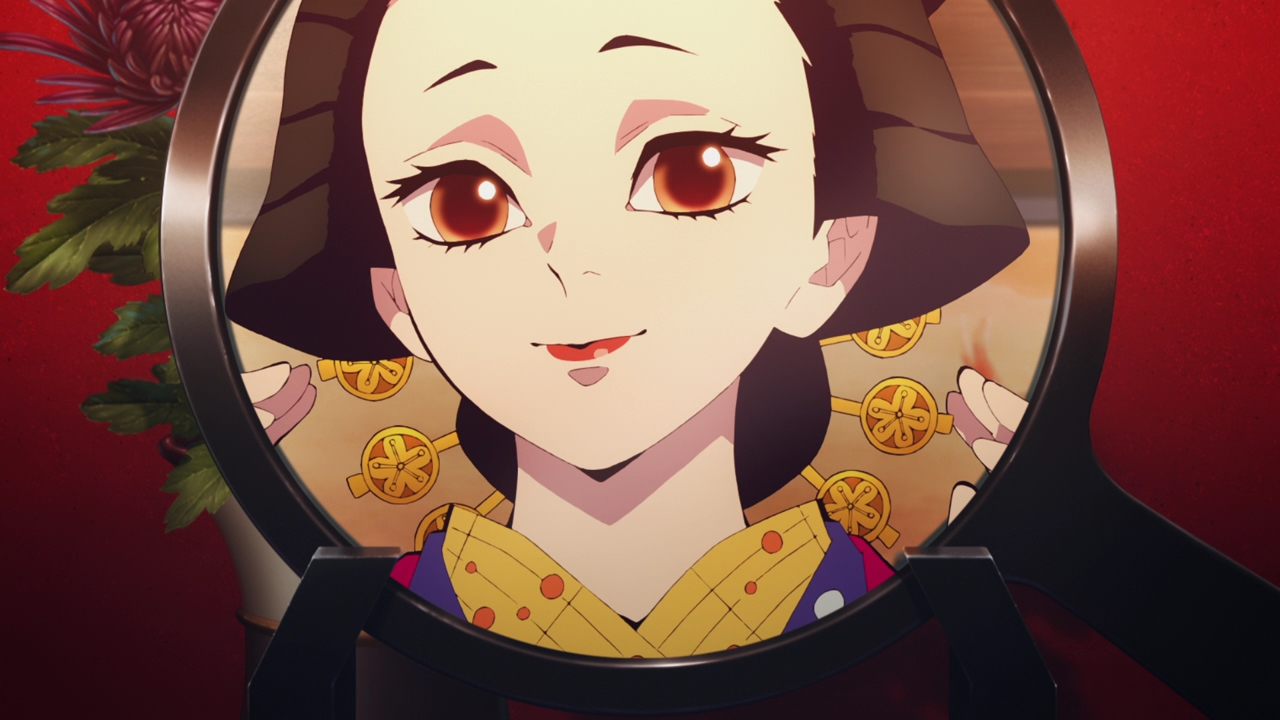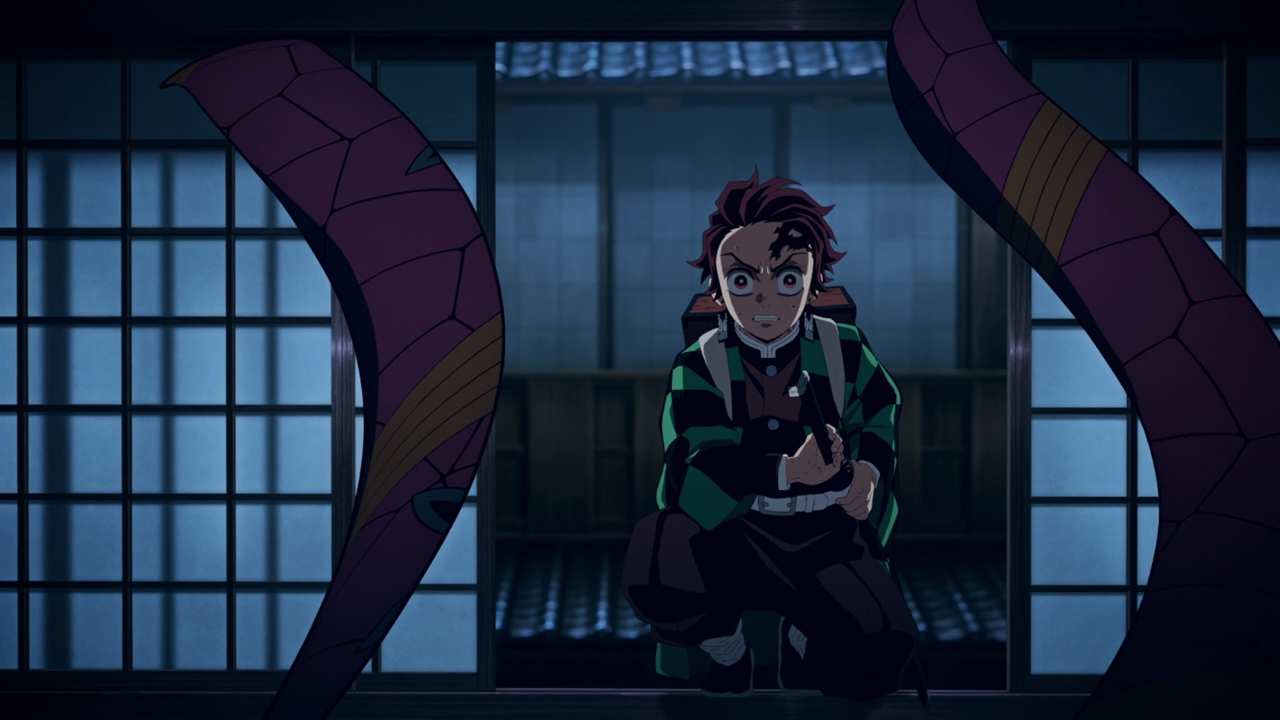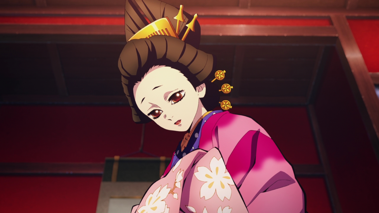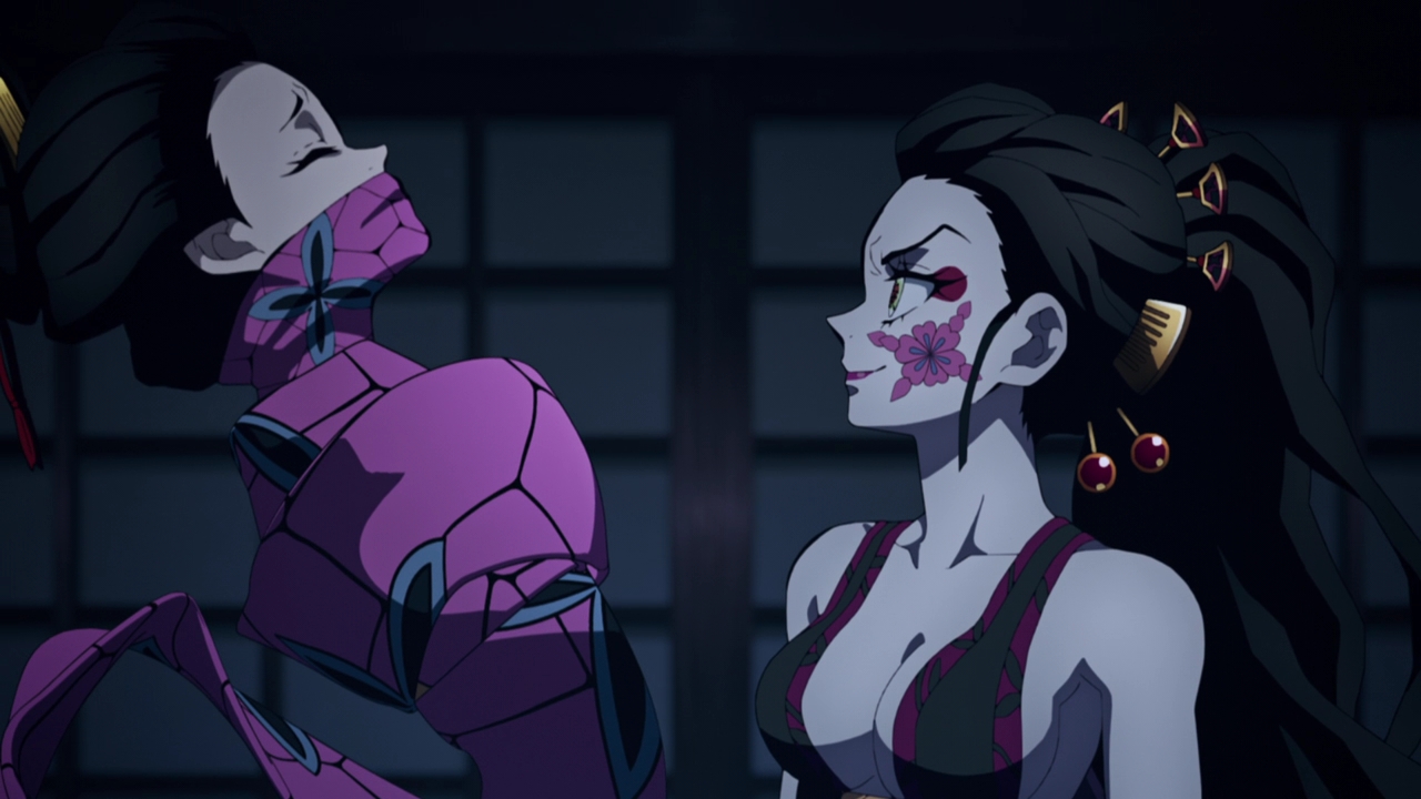 It’s interesting how Daki’s power works, and also makes sense how Zenitsu and Makio were taken away. With her obi sash, it seems like she can trap and absorb them into the cloth and keep them there until she kills them. It explains how neither Makio nor Zenitsu can be found, and it also explains how Daki was able to grab Makio and drag her out of the house through the attic. She may also be able to do that to herself as well and technically teleport herself to different spots, as she was able to appear in Koinatsu’s room out of nowhere. As we saw when Tanjiro was running on the rooftops, it wasn’t completely sundown yet so that should have been the only way that Daki could have appeared in her room. It’s such a cool and terrifying ability, it’s no wonder that Daki has been able to devour and get rid of others in all of these centuries. You really can feel that Daki has control of this place.