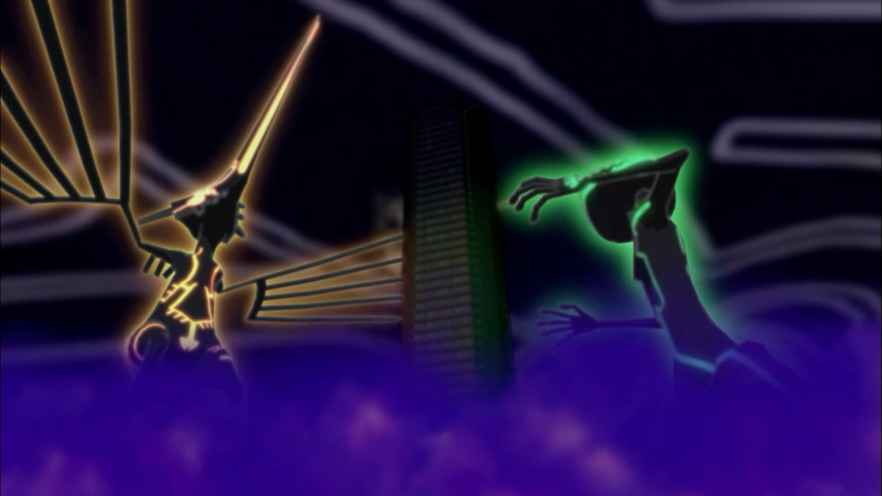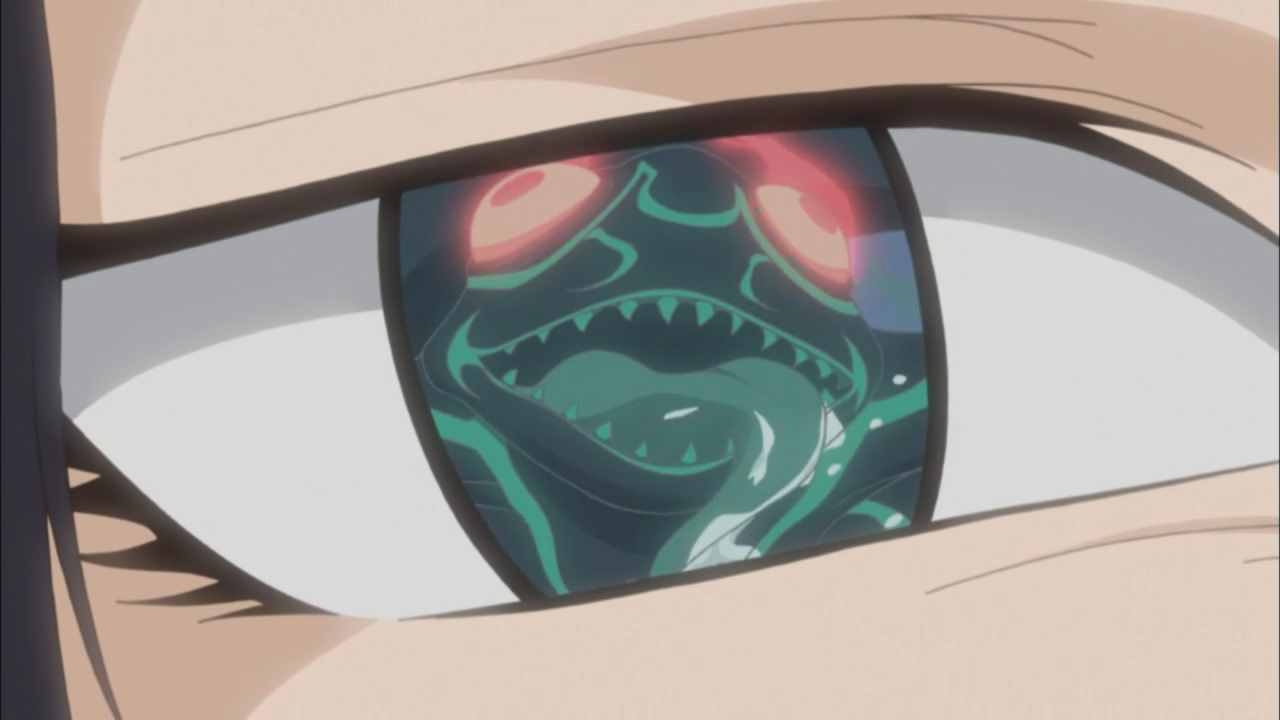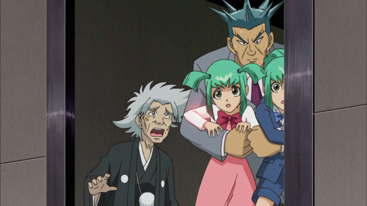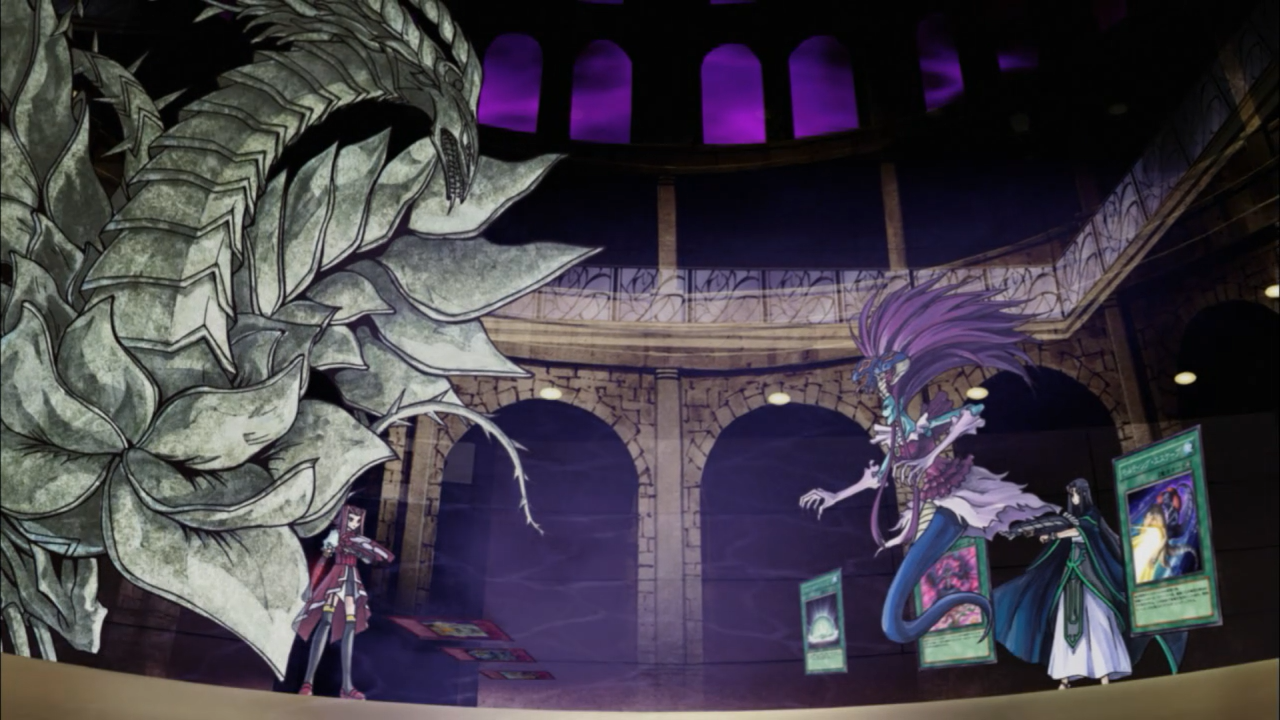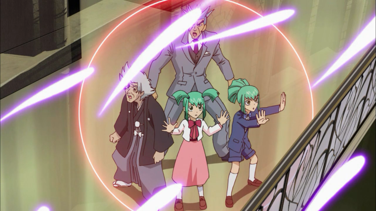 Remember how Godwin was preaching at Yusei about keeping the battle in Satellite? Well, so much for that huh, because two Dark Signers decided to make their debut at the exact same place and at the same time, wrecking havoc across the city and sucking up people’s souls to summon Earthbound Immortals Ccarayhua and Aslla Piscu. Well I suppose you have to thank Divine for that considering his headquarters is located in the City and that’s where Aki has been living. After-all, that’s the only reason why the Dark Signers showed up there in the first place. But boy, it was certainly hella creepy to see both of them surrounding and peering into the headquarters like that.