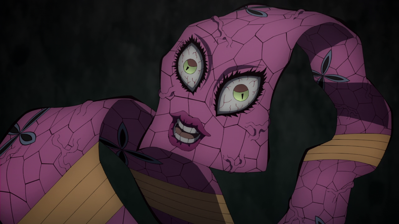 I was wondering why the voice back in episode 2 was different from Daki’s voice. We find out that the sash is a separate entity that most likely stems from Daki, but can operate independently while still keeping a telepathic connection. Which just makes Daki all the more dangerous as she has so many different ways to get and keep an eye on people. That’s honestly pretty terrifying. Daki can be houses away and she’d still be able to get you due to this sash thing.