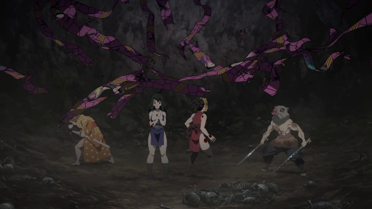 While Tanjiro does his best to fend off Daki, Inosuke finds the underground system that Daki has been using for hundreds of years to capture and store people she plans to eat. But before that, the fact that Inosuke can dislocate all his limbs was DISGUSTING. Definitely helpful in this situation, but DISGUSTING. Not to mention he was still able to move in such a tight space. Talk about claustrophobia to the max. We knew he was flexible, but I don’t think anyone expected him to just dislocate his arms like that just to fit through a hole. This strange boar man never ceases to surprise me. However, this gross maneuver does allow him to literally worm his way to the “food locker” as the demon so eloquently put it.