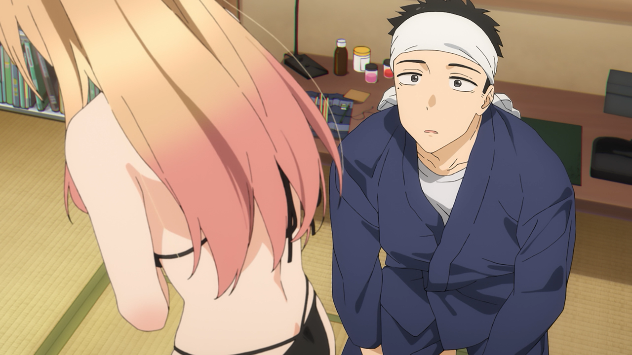 The plan was to wait till Monday, but Marin was too excited to wait till then so she hunted his house down to visit him on the weekend. Honestly it was just better they did this at his place then because I don’t think Wakana would have been able to mentally get through it if they were to do the measurements at school. He was flustered enough as it is. Marin on the other-hand, wasn’t particularly concerned whatsoever with the process. She cleverly decided it would be better to be dressed in a bathing suit instead of her underwear to make it less awkward and embarrassing for both of them. But even so, for Wakana, all of this is completely new to him, a first having someone over in god knows how long and now he is being asked to take measurements of a girl, his anxiety is off the charts.