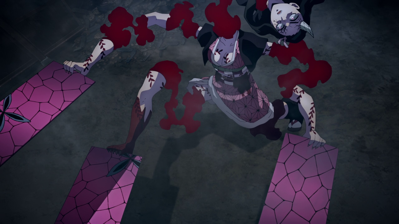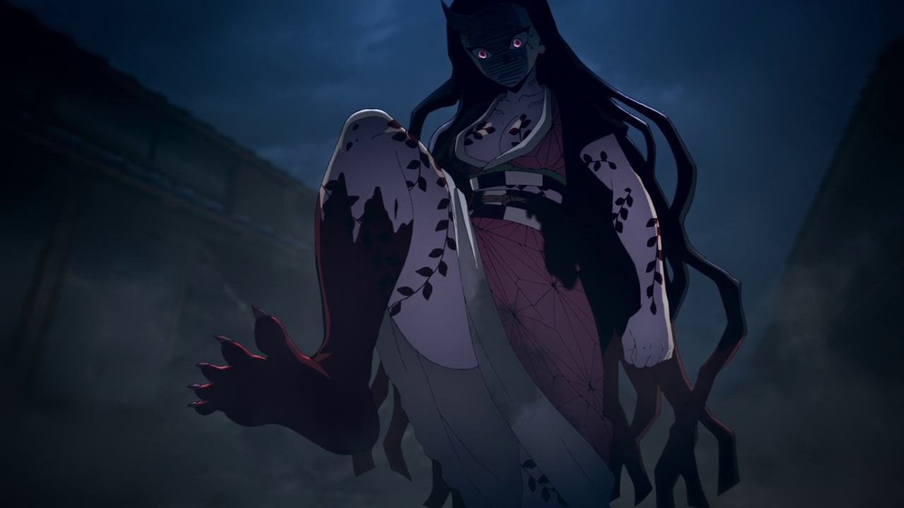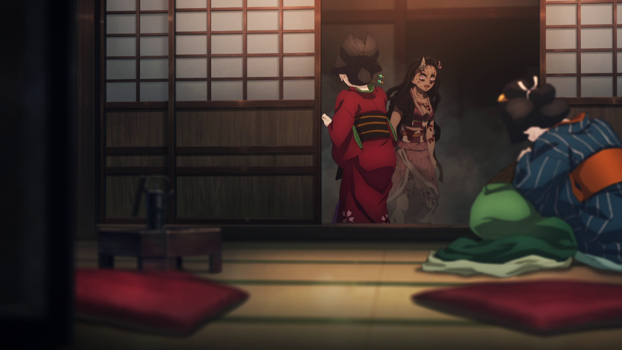 Now, last episode Tanjiro kinda creeped me out. He completely lost himself when using his Sun Breathing over and over. That blank look on his face and that rage was something we’ve never seen from someone like Tanjiro so it was so shocking and scary. The same thing happens to Nezuko as she looked and felt more like a demon. She was powerful, strong, and she even found pleasure in torturing Daki with her violent assault. It was completely unlike we’ve seen her before. The part later in the episode when she was about to attack a wounded woman after seeing her blood was more or less how she was in the very first episode, but the twisted pleasure in her actions and the brutality of it was something we’ve never seen from her. The way she looked and acted was basically like any other demon we’ve seen in this show and that’s a scary thing. And sad that Nezuko basically lost herself if it weren’t for Tanjiro holding her down. If he weren’t there, I do believe that Nezuko would have attacked that woman. I really wonder if it really was just the pure anger of Daki’s destruction and death of the district that made Nezuko transform like that. Their little brother mentioned she and Tanjiro could be scary when it came to protecting others, so that could have been the trigger. But so much so that she wouldn’t completely lose herself?