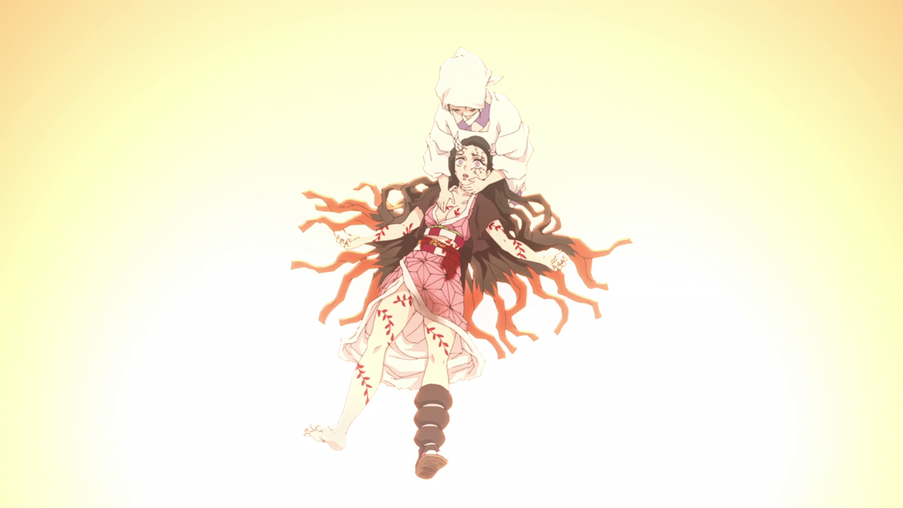 Now, last episode Tanjiro kinda creeped me out. He completely lost himself when using his Sun Breathing over and over. That blank look on his face and that rage was something we’ve never seen from someone like Tanjiro so it was so shocking and scary. The same thing happens to Nezuko as she looked and felt more like a demon. She was powerful, strong, and she even found pleasure in torturing Daki with her violent assault. It was completely unlike we’ve seen her before. The part later in the episode when she was about to attack a wounded woman after seeing her blood was more or less how she was in the very first episode, but the twisted pleasure in her actions and the brutality of it was something we’ve never seen from her. The way she looked and acted was basically like any other demon we’ve seen in this show and that’s a scary thing. And sad that Nezuko basically lost herself if it weren’t for Tanjiro holding her down. If he weren’t there, I do believe that Nezuko would have attacked that woman. I really wonder if it really was just the pure anger of Daki’s destruction and death of the district that made Nezuko transform like that. Their little brother mentioned she and Tanjiro could be scary when it came to protecting others, so that could have been the trigger. But so much so that she wouldn’t completely lose herself?