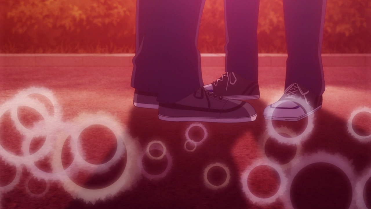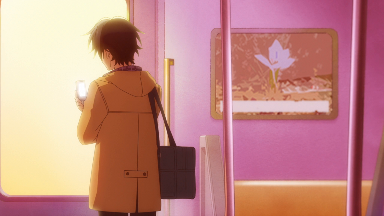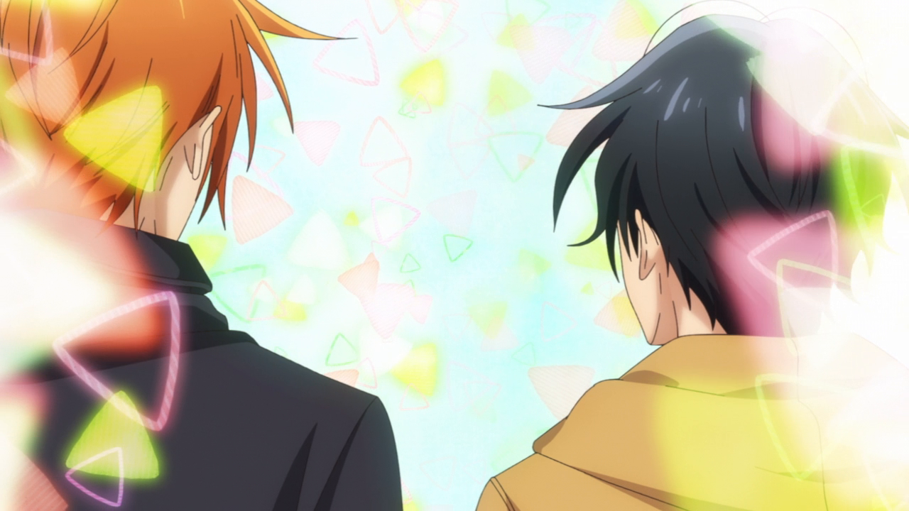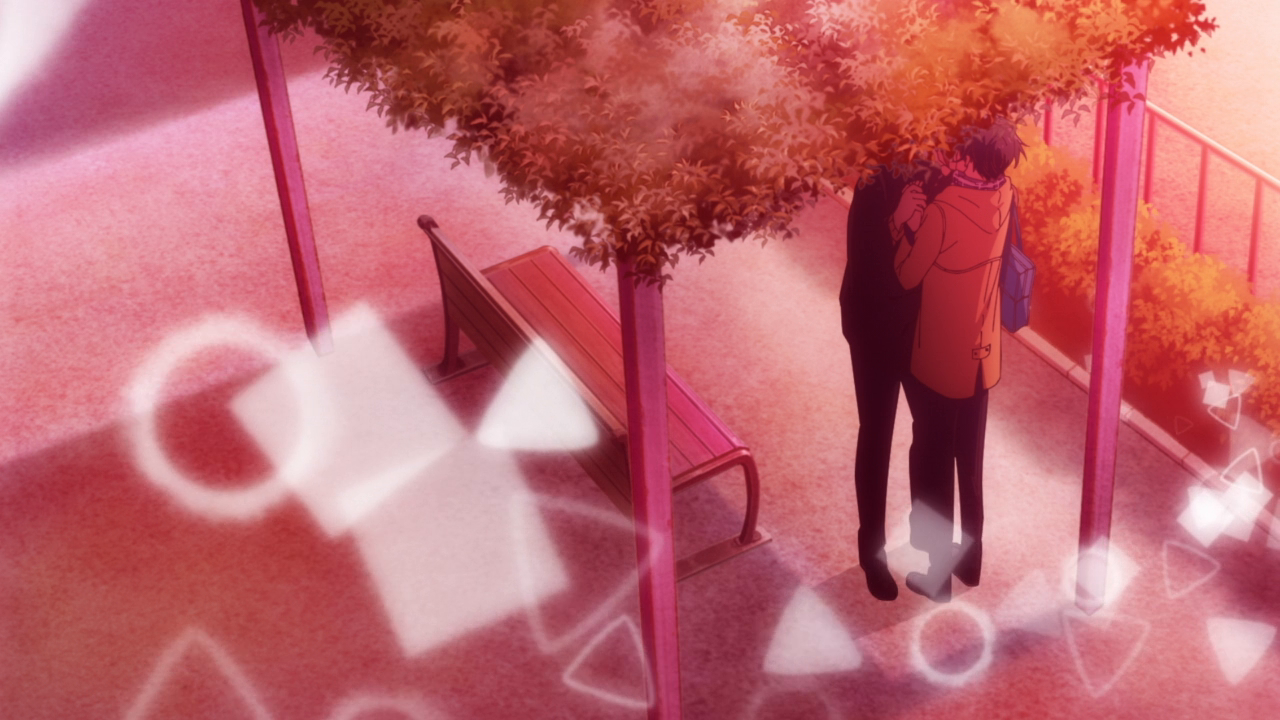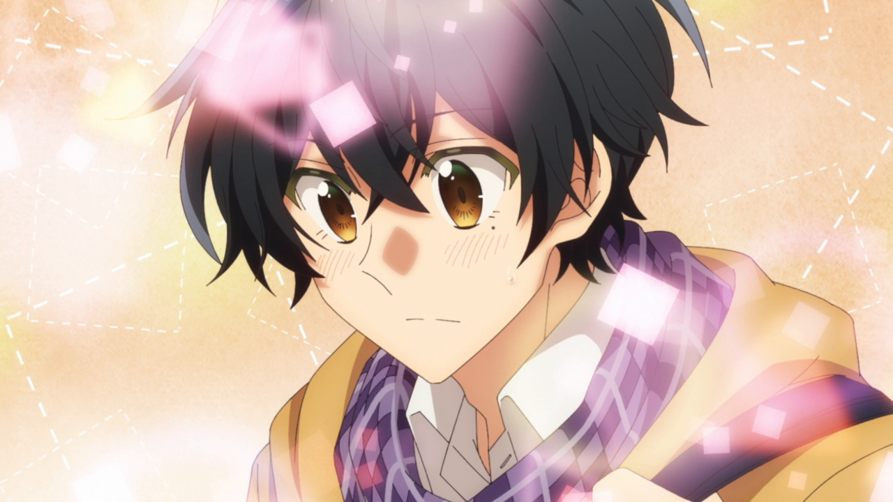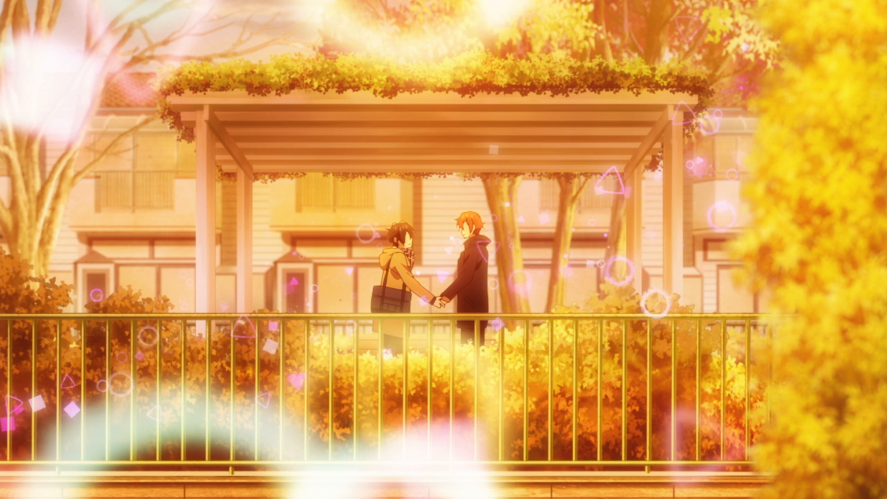The first half did also feel repetitive in the sense that most of the time Sasaki and Miyano’s interactions were just at school. And it was just normal stuff like meeting up at class, or in the hallway. Not exactly the most interesting so it sort of felt static. Things did pick up in the second half with the cultural festival, the boys going to the movies, and then the Christmas date. That is what I had wanted, but it did take awhile just for the setting to get less boring. This might also have to be because of the direction and set up of the scenes. The animation for this show was pretty average to be honest. Studio Deen is pretty average when it comes to their animation, and kind of weird. They have a couple shows here and there that can look gorgeous and stylistic, another couple here and there that look butt ugly, and then most of their shows being in the middle. Sasaki and Miyano has the Deen problem where the shots weren’t all that interesting either. For example, here’s Sasaki and Miyano walking in the hallway. Here they are in the train again. Here they are sitting. Here’s a static close-up shot of their face, and some really cute chibi. And of course all the bright shoujo floating shapes and the backgrounds. Even the shots in the OP and ED are pretty standard stuff, like the walking and the characters shyly looking at each other. Not terrible or anything, but it could have been better. More dynamic shots, more symbolic shots. I just wanted something more. And you can see that there were moments where the animation looked…not too good, or just lazy. Damn it Studio Deen. However, there were definitely some shots that looked beautiful, all during the romantic moments like the confession, the fireworks scene, and Sasaki’s confession, and other moments too. So I’ll give credit where credit’s due.