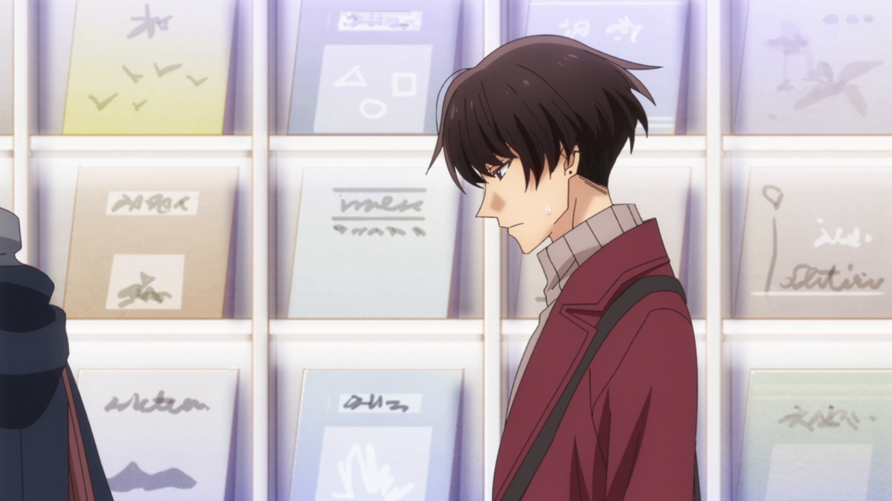 It was so cute how differently Miyano looks at Sasaki now. Before he would just see him as his really cool senpai, but now the more he looks at him, the more cute he seems to him. He’s a lot more flustered around him, and a little awkward too. Mostly because his mind is constantly working out a plan for him to finally tell him his answer. It was funny watching him try over and over, but again it’s ironic he had all the opportunity in the world since summer (it’s now December/January), and how when he’s finally ready he can’t find any time because Sasaki is busy with studying and exams. He had the perfect chance during Christmas when they went to the exhibit, and I am kind of disappointed they didn’t show it. The “couples break up when getting together on Christmas” thing was silly but he was definitely stalling and trying too hard to find a perfect moment. I wonder how it’ll go what with the near-kiss at the end. Also the detail of Miyano switching his bag around so it wouldn’t hit Sasaki when they walk together IS SO CUTE!!! Such a cute little detail I never even noticed, but says so much about Miyano’s character. Just lovely.