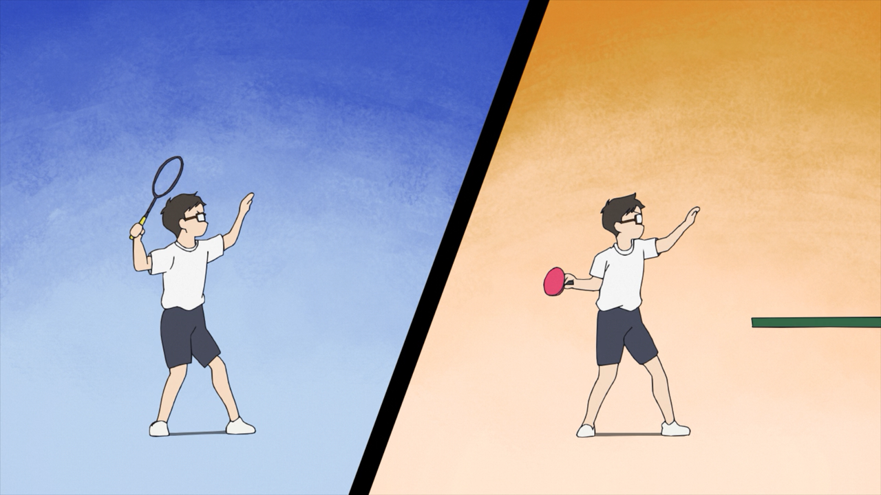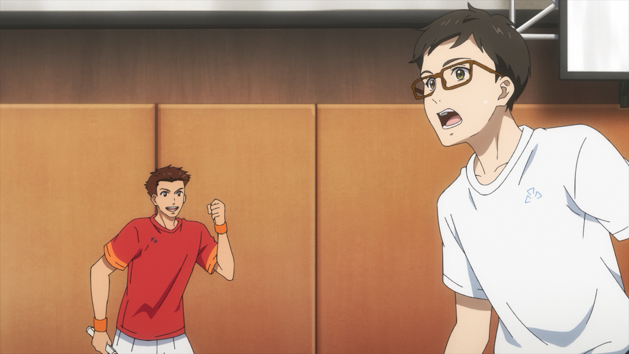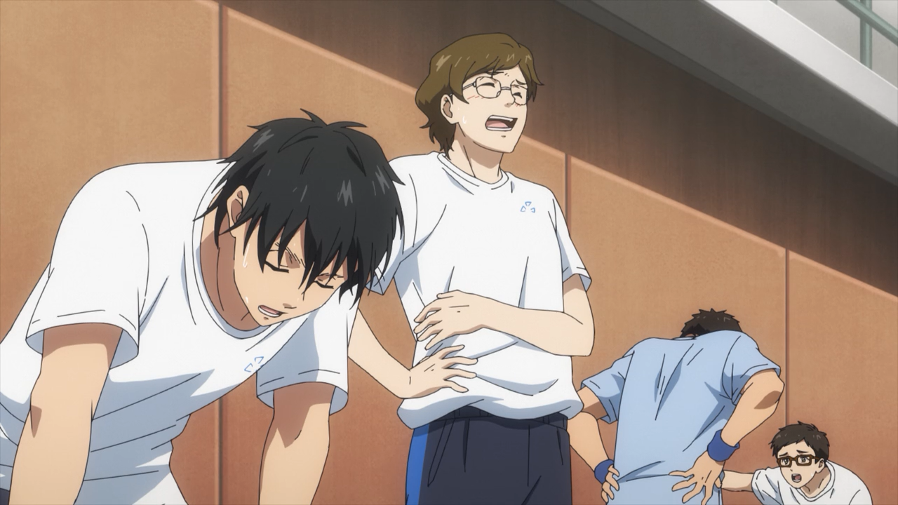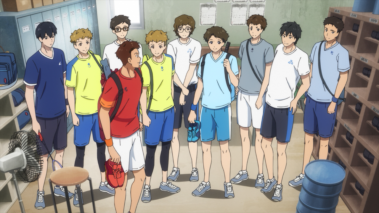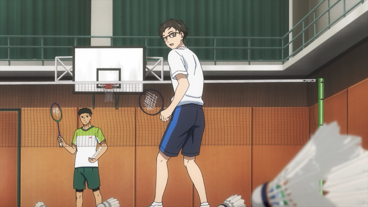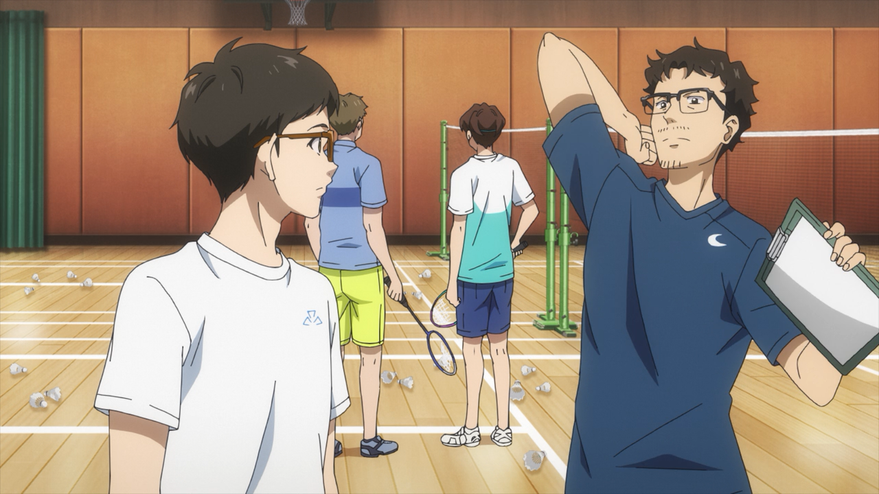 Meet Uchida Akira, the only first year who have participated in the club’s trial to stick around. Unlike the other boys, he is a complete newbie when it comes to badminton, and admittedly had a rather discouraging start with struggling to hit the birdies. The problem was that Akira had previously played ping-pong, so out of habit, he was swinging too late because he is more used to using a short paddle than a long racket. To fix this, Coach Ebihara gave him a helpful pointer how to set the beat, and with that Akira was finally able to land some hits! He is quite an endearing character, and it’s very heartwarming to see the boys be super supportive of him. This is the wholesome goodness I like to see!