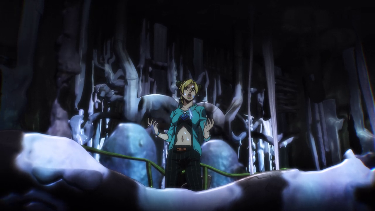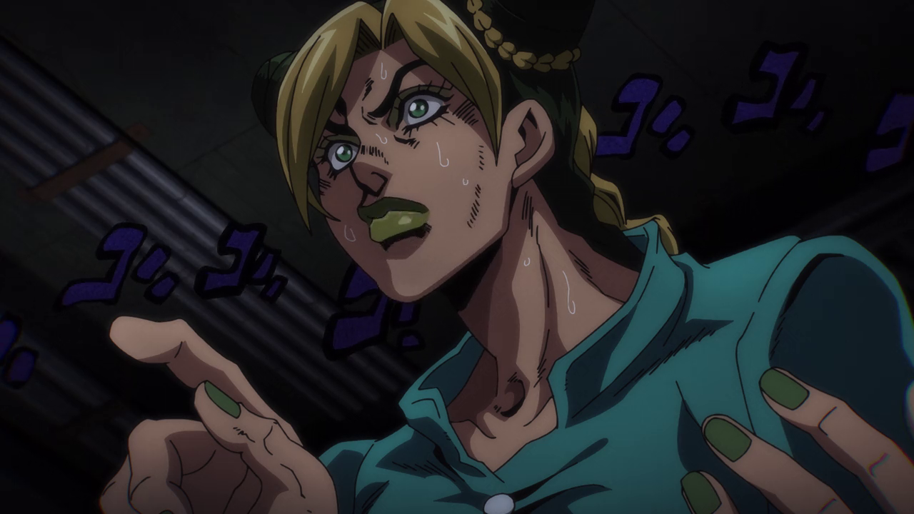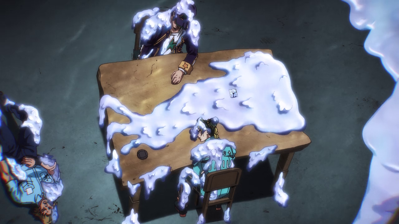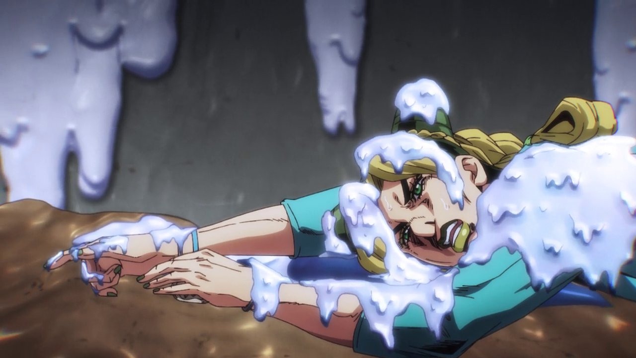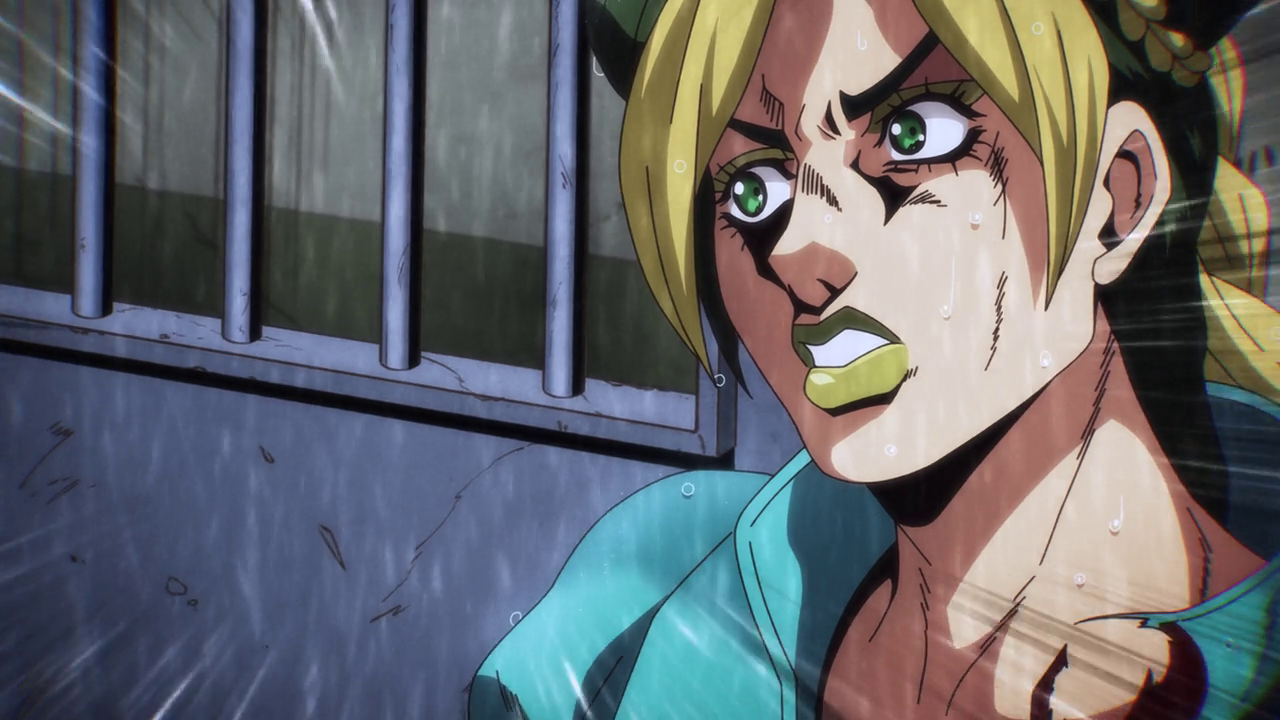 In typical Jojo fashion, things have taken a turn for the weirder. Jolyne went after the child and managed to take down Johngalli A’s stand, using a trick with the gas pipe. It seemed like everything was settled, but things get strange quick when the child suddenly disappears from the room, Jolyne sees Johngalli’s in the actual room, and the fact that Jotaro has no idea what she’s talking about when it comes to literally everything that’s happened to them so far. Turns out, the second she stepped into the visitation room is the second they walked into his trap. Just like the child said, don’t go in the visitation room. Jolyne wakes up to this…slimy melting weirdness. I really was curious how they would adapt this part because of how weird and gross it is, but oh my god the sound effects make me nauseous. It’s just this really gross goopy sound that I DO NOT like listening to so the faster Jolyne or Jotaro can wake up and get themselves out of this weird room, the better. Dx