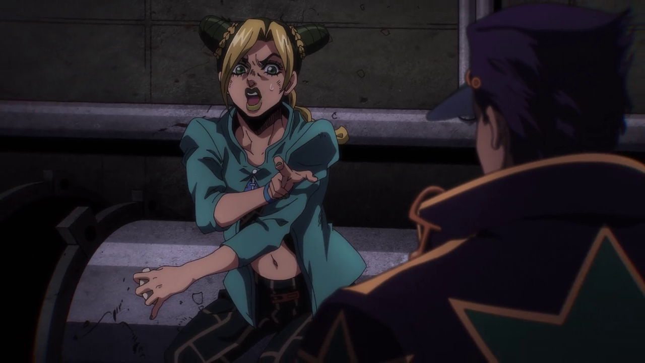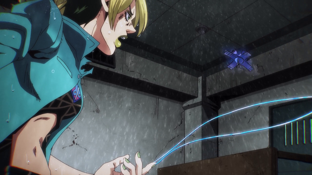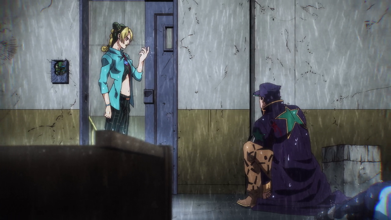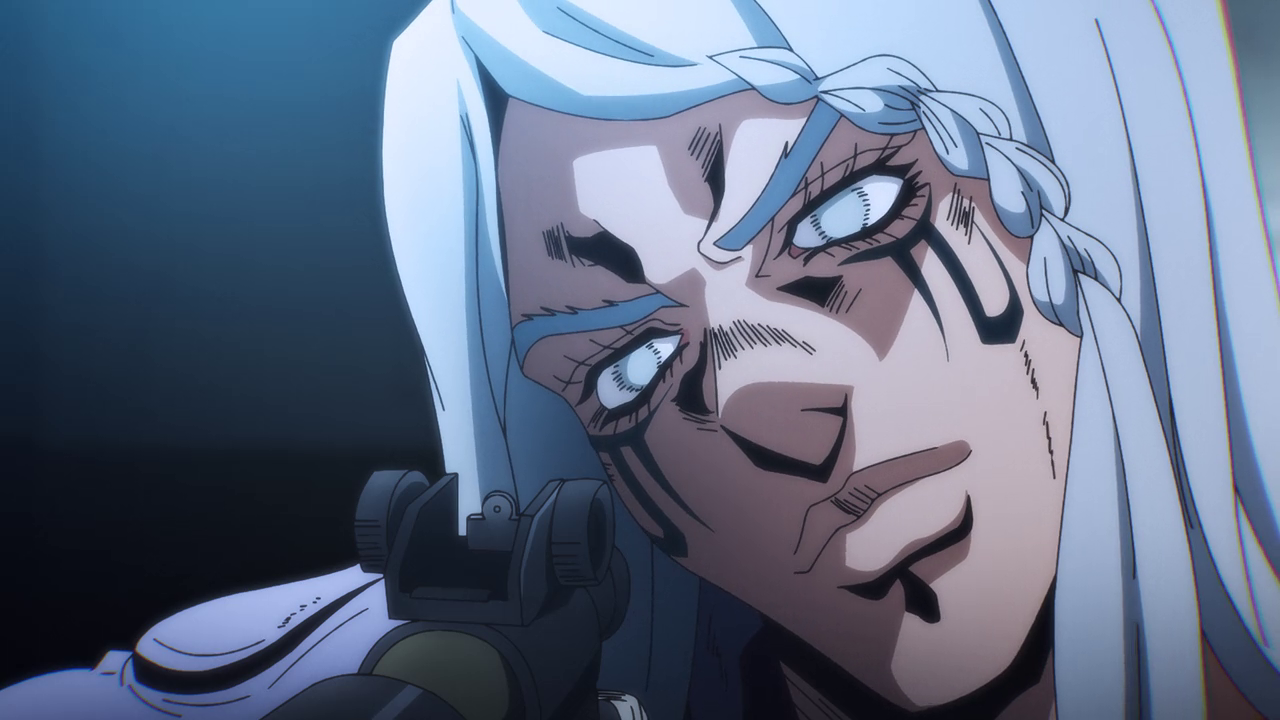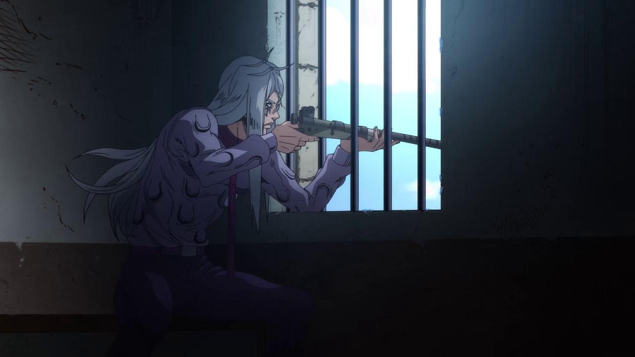 And now we’re back to the Johngalli A. fight, which isn’t even done yet. Jolyne and Jotaro are still figuring out a way to best take down his stand through knowing his ability, which is the stand being able to track their movements through air movement. Once knowing their location, Johngalli A. shoots from his rifle in the men’s prison, which travels and strikes his target.
