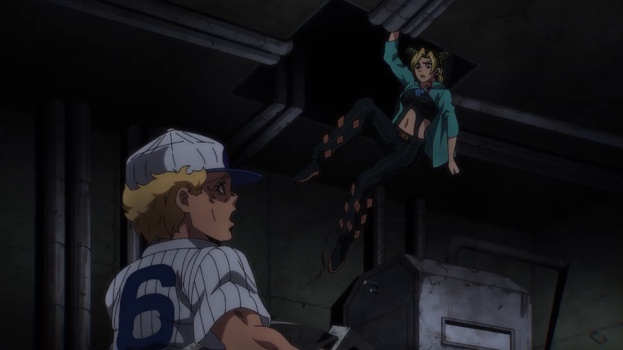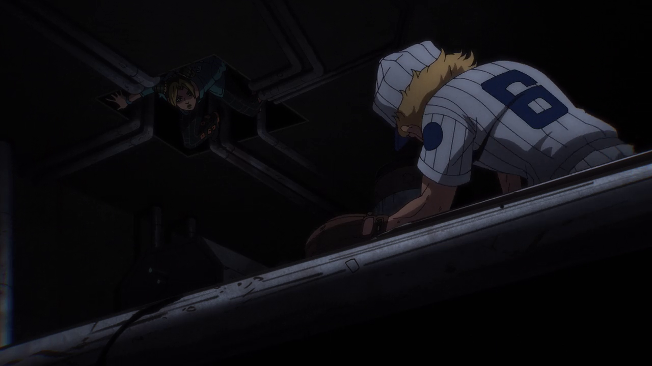 At first it seems like Jolyne had the right idea by activating the emergency sprinklers to mess with the air in the room but that didn’t really go as planned. She gets a surprising tip but the boy in the baseball uniform again when he tells Jolyne to knock out the base of the pillar in the room. He doesn’t explain how or why he even knows that’s there, just that he wants Jolyne to survive. This child has been extremely mysterious so far, what with the bone, being able to travel around the prison, and telling Jolyne strange things that happen to come true. And the weirdest is that fact that he’s a child in this prison. What is a child doing in a place like this, and why specifically in a baseball uniform. Just like Jolyne says, he’s like any other kid you could find in a park, but instead he’s running around this prison dropping cryptic messages. And it’s like he has a connection with Jolyne already, pleading with her to survive. It’ll be exciting when we can actually meet him.
