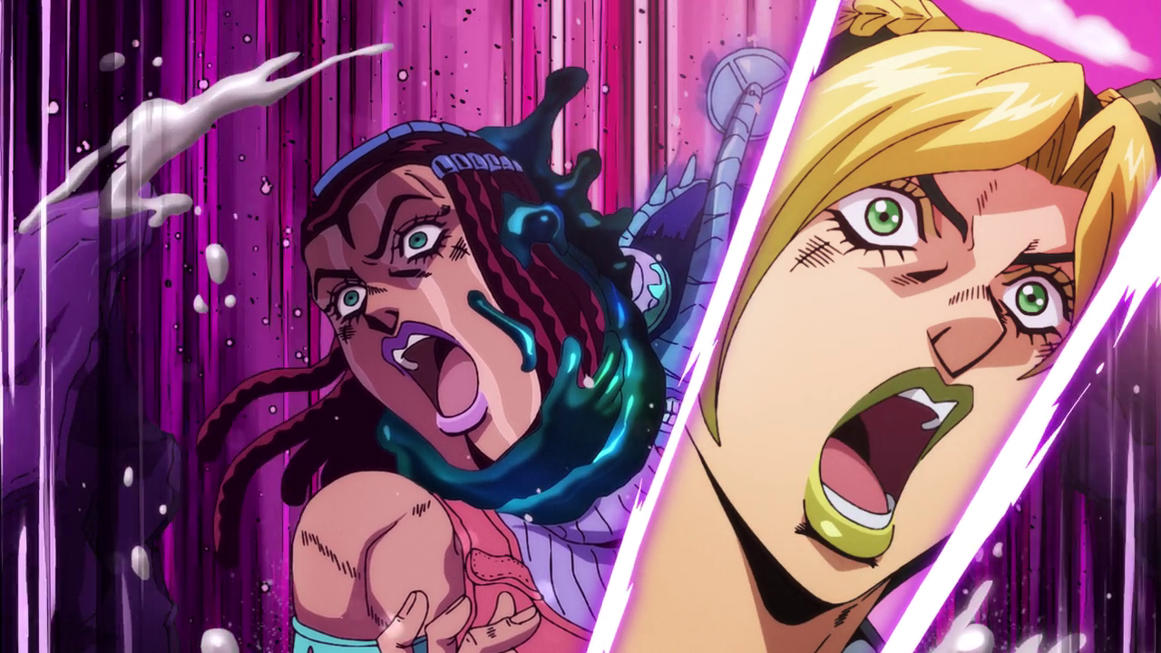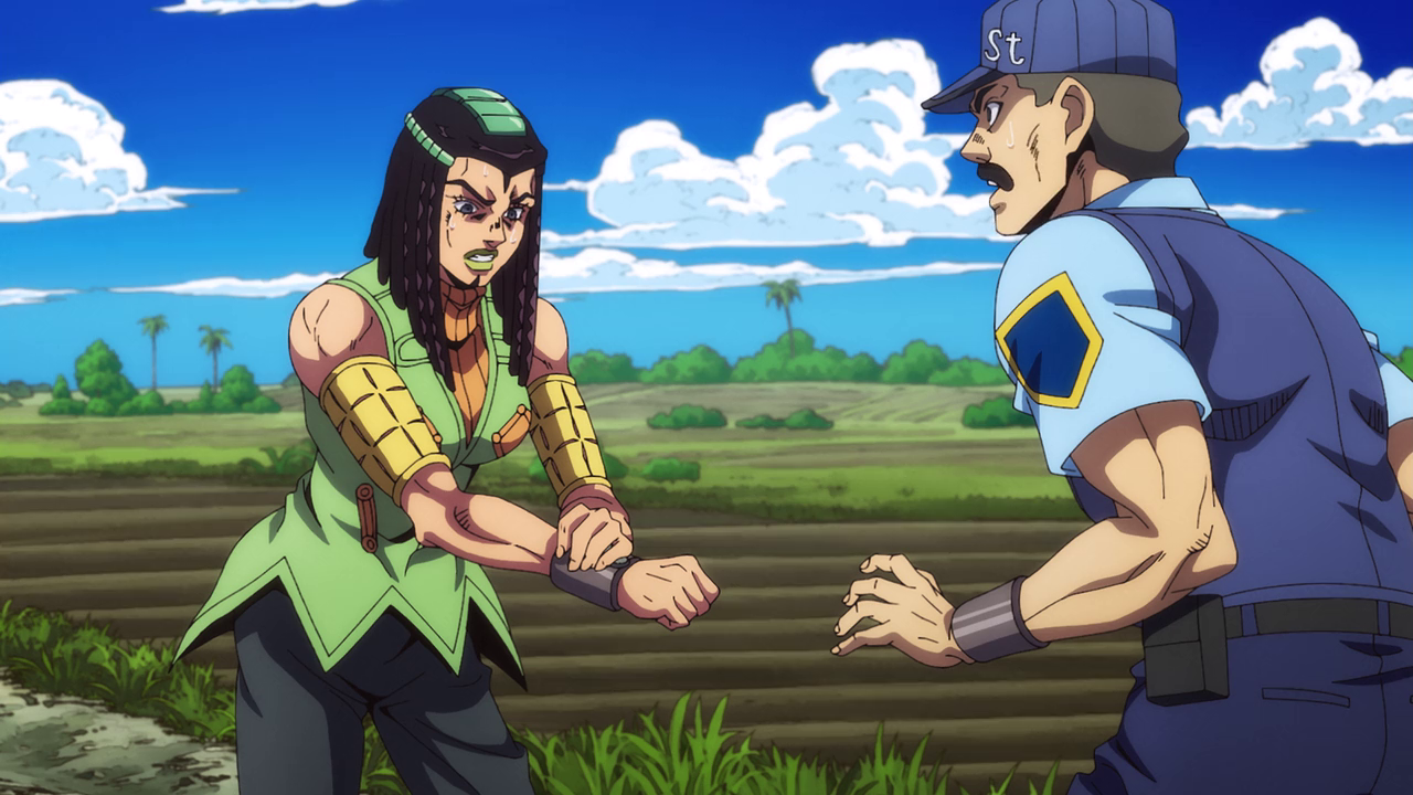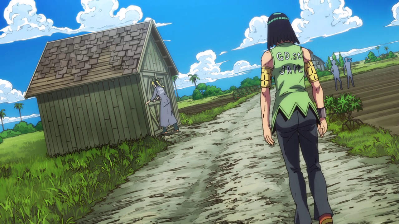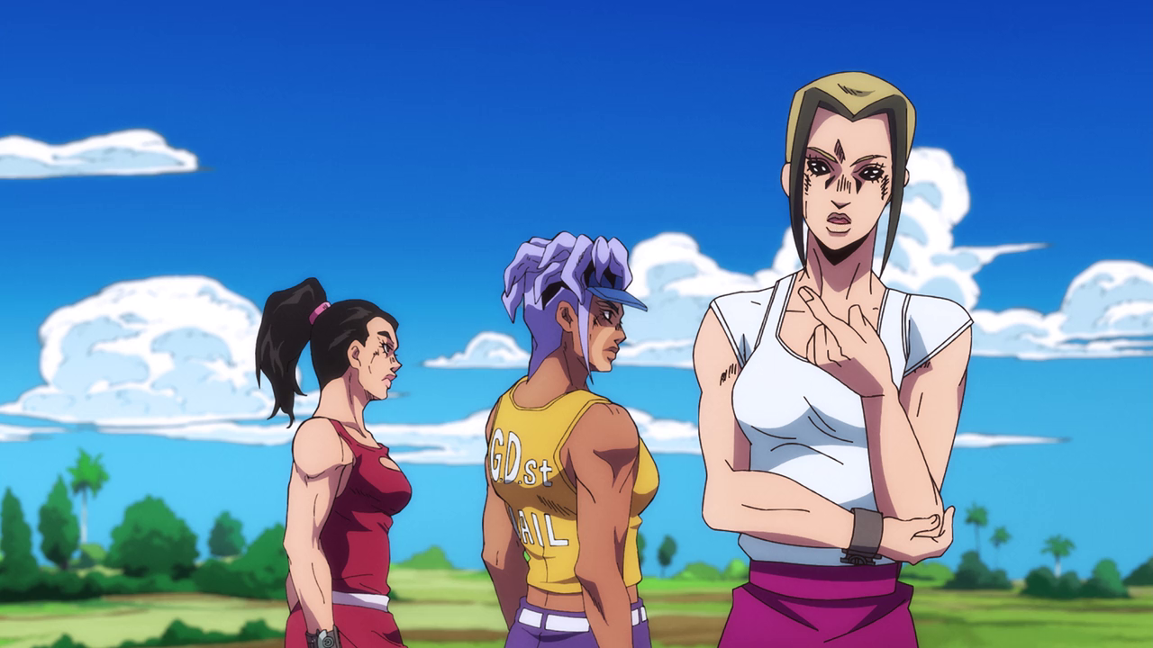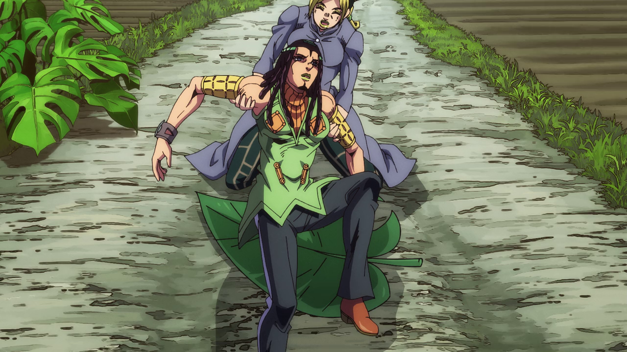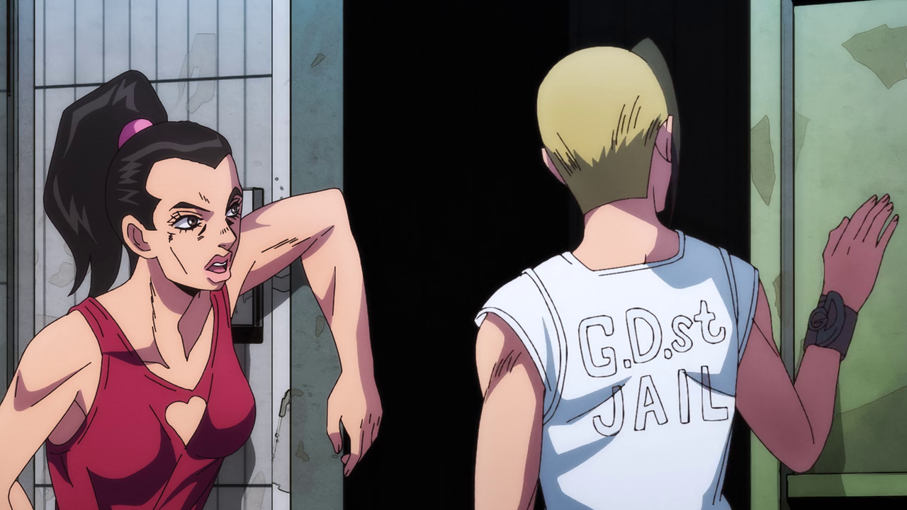 We open the episode up with a terrifying stand devouring two male inmates doing a job at night. Because of these two’s disappearance, a volunteer search party is formed with some of the female inmates to find them. And two of them consist of Jolyne and Hermes, where they finally catch up about everything that’s been happening from the beginning.