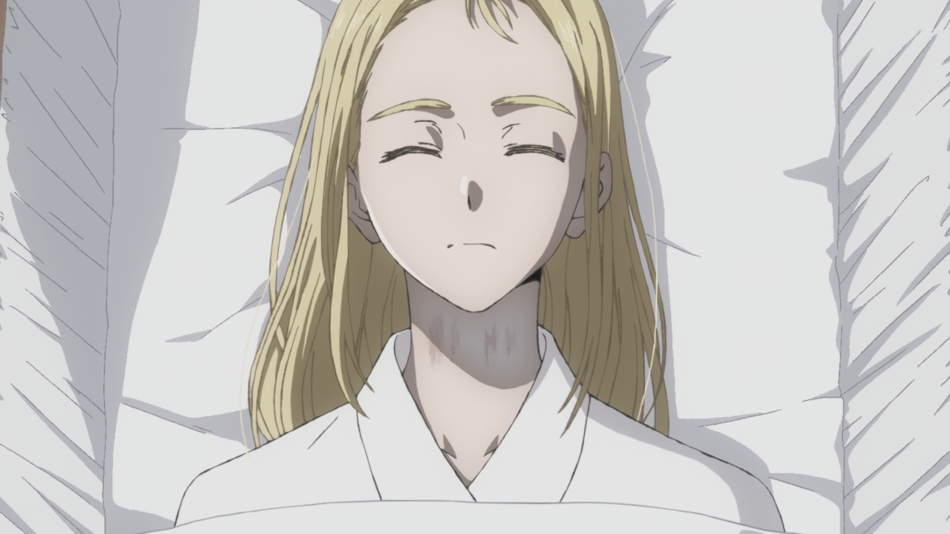 Now, one thing that stood out to me this episode was when Hizuru asked where Ushio’s body had been dressed. Alan said it was done by a nurse at the Hishigata clinic. Now, Hishigata is Sou and Tokiko’s last name. We know already that Sou’s father is a doctor and they have their own practice. Is it a coincidence that they’re the ones that had to dress her? Probably because this is such a small town on a small island that the Hishigata clinic is probably the biggest, or only, clinic on the island. It would also explain why Sou knew that Ushio had marks on her neck, but anyway. One thing from last episode were Tokiko’s last words before dying which were something along the lines of “I didn’t mean to get my hands dirty for this”. Something like that. That alone had me really suspicious of what sort of connection Toki or the family in general had to the Shadows. The fact that her family were the ones that dressed Ushio’s body and didn’t report anything to the police or just tried hiding the strangle marks on her neck makes things even more suspicious. The hiding the marks with makeup I can understand as wanting to hide any imperfections on Ushio’s body in respect to the family as this was an open casket funeral, and it’s just common practice anyway. Still, the Hishigata family is connected again. I won’t feel satisfied unless the family is confirmed to be connected in some sort of way, but it might be awhile until we find out. And then maybe I won’t feel too bad for suspecting Sou and Toki from the start. Though again seeing Sou die like that was pretty sad.