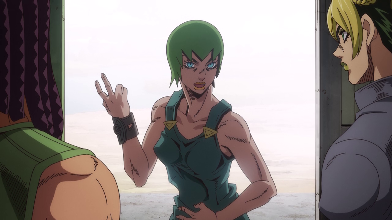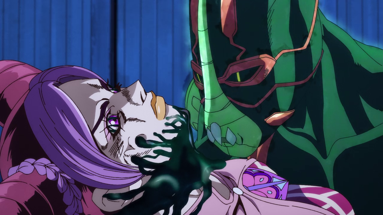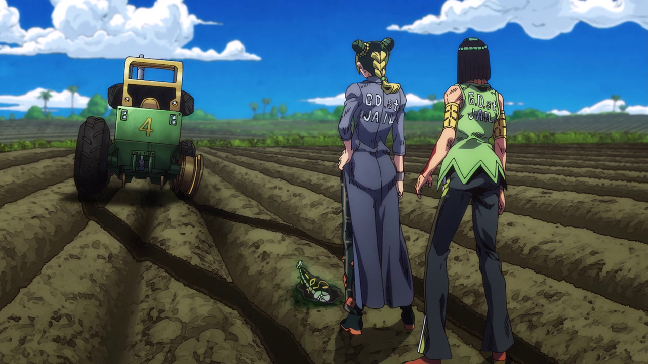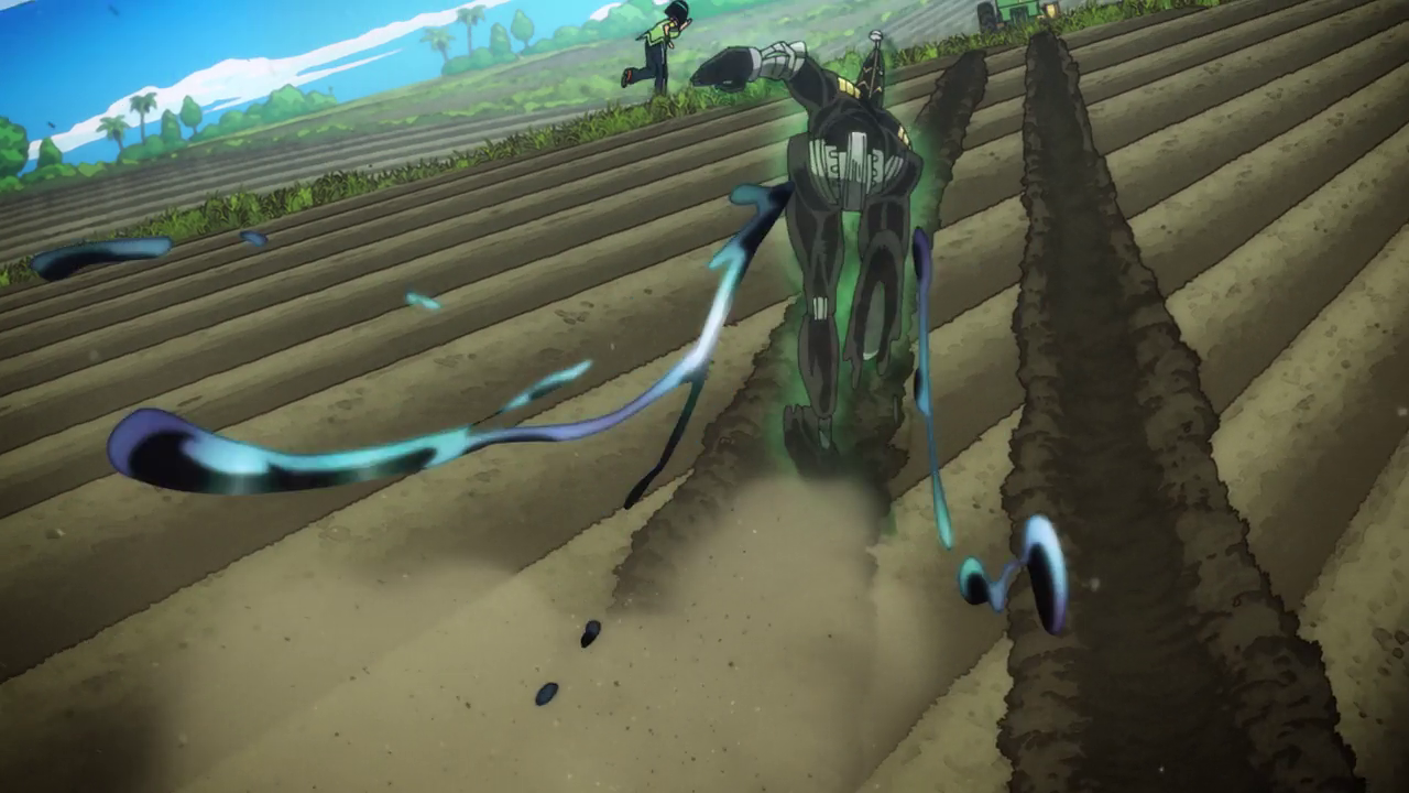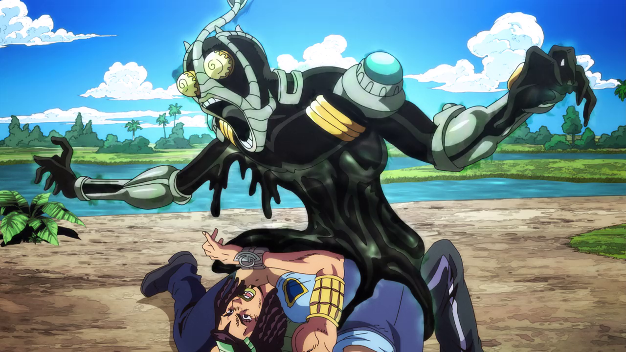 I knew the mystery sixth person in the group was the woman in the tank top since we had seen the other ladies in the shot where Jolyne and Hermes run to catch up to the jeep. But man that whole scene in the beginning with their bodies getting sucked of their moisture and all that was horrifying. I didn’t remember that particular scene so I wasn’t expecting it, but it was done really well. We find out that Foo Fighters, or F.F., is not a human but an organism with intelligence. After that long existential speech, FF is basically a stand user that started off as a plankton with intelligence and stuff. But thanks to that it has a pretty big weakness, being that it needs water to survive at all times. It needs a some source of water nearby, such as taking it from the wetlands nearby, or from humans, etc. Maybe not the most exciting fight but there were some good moments.