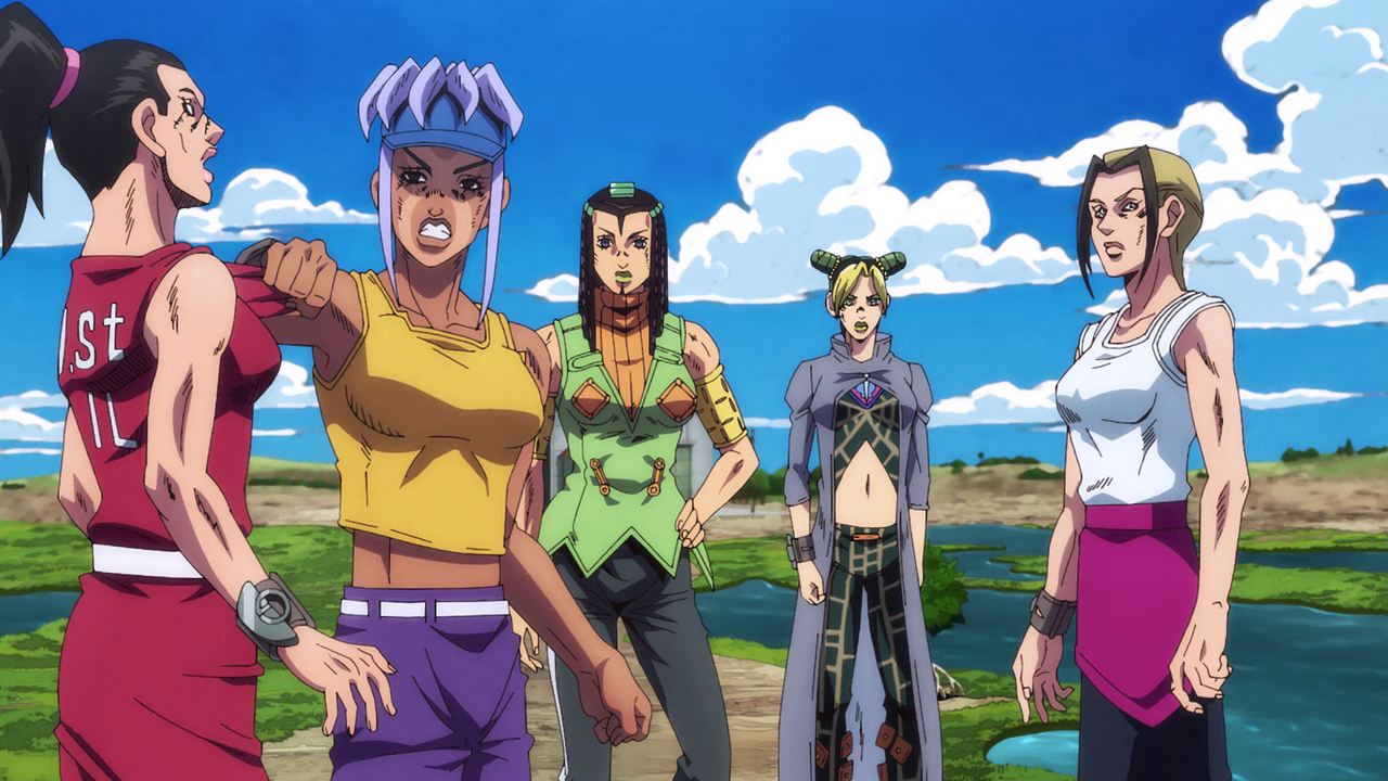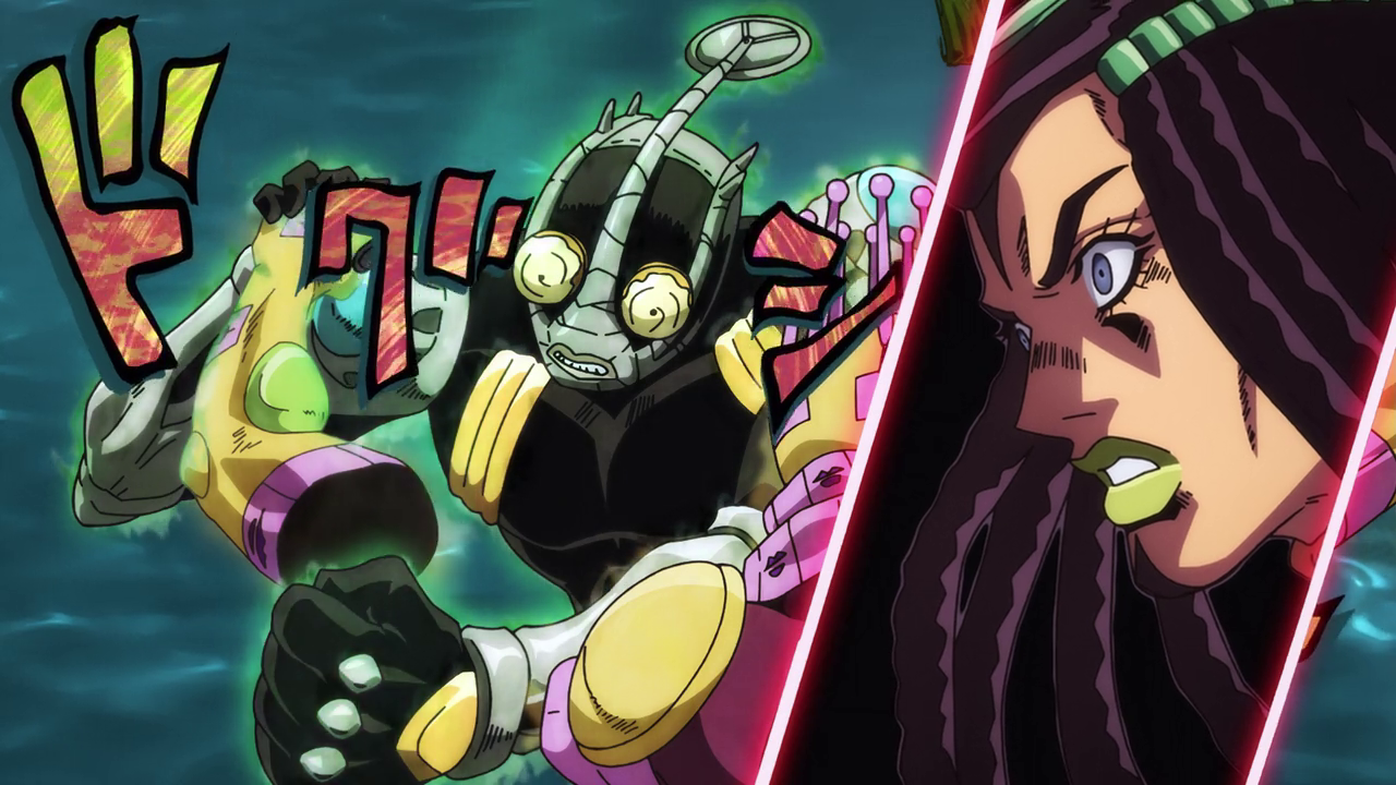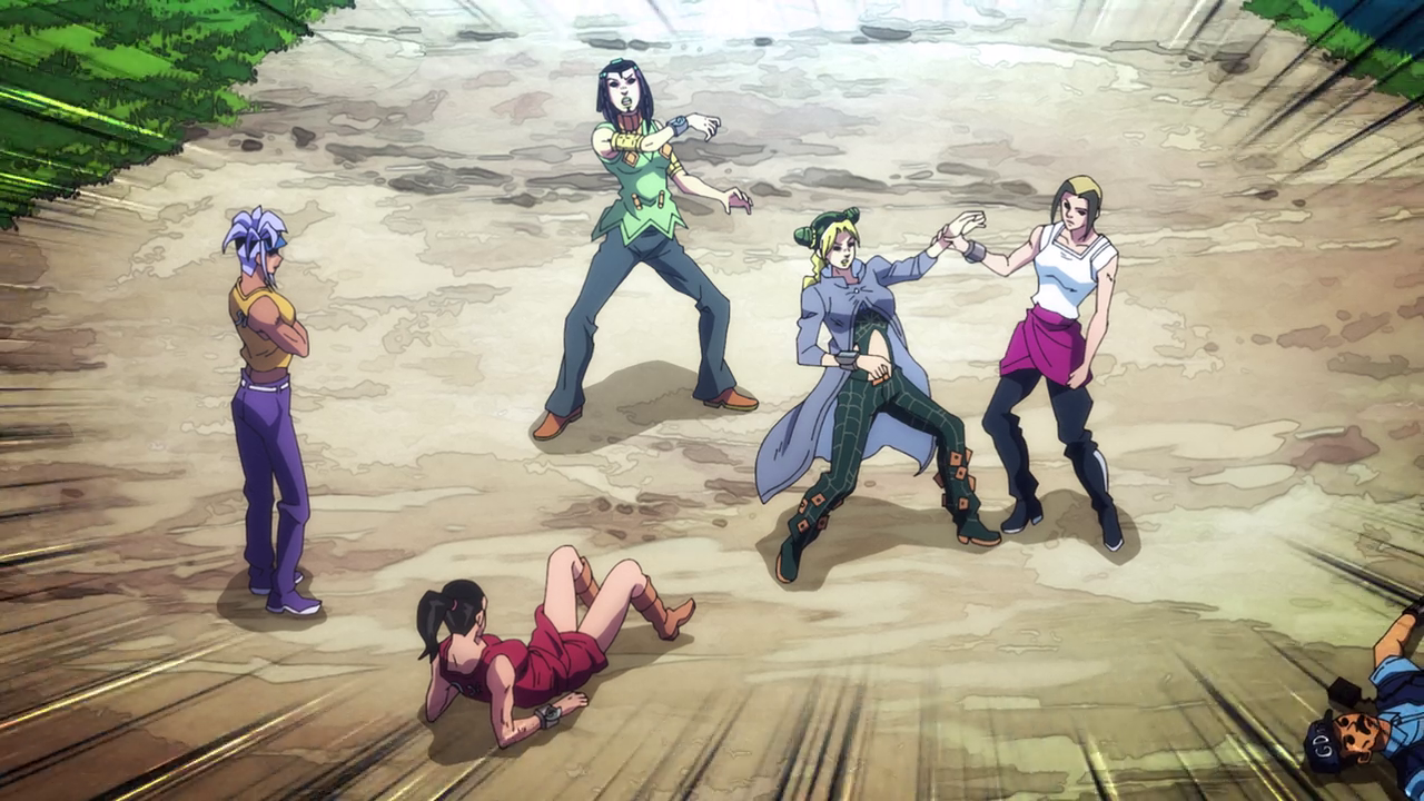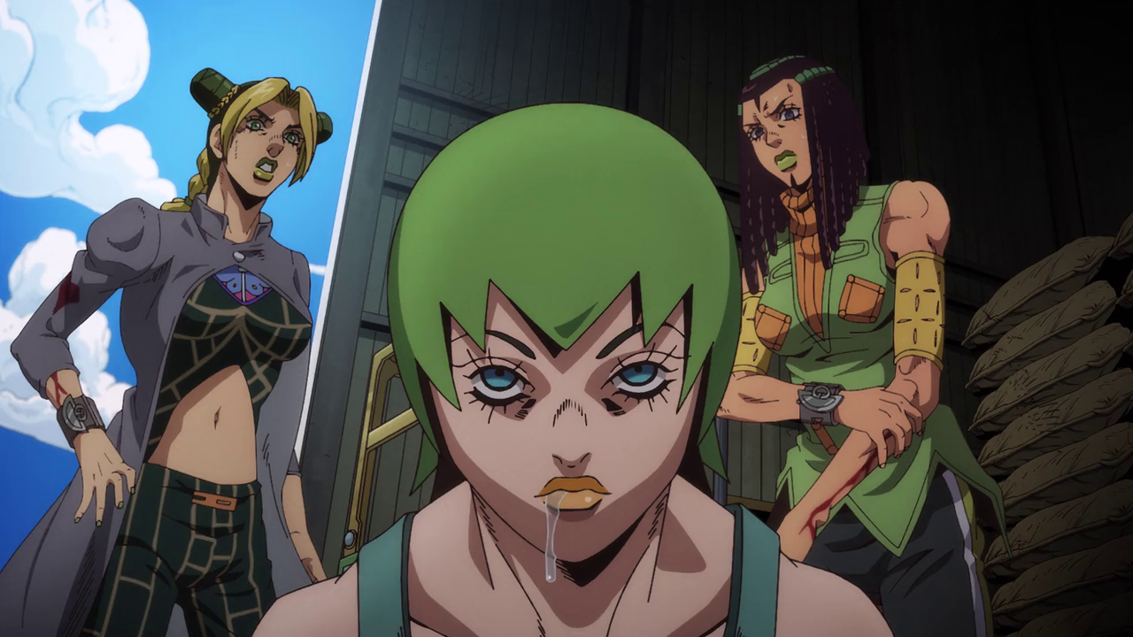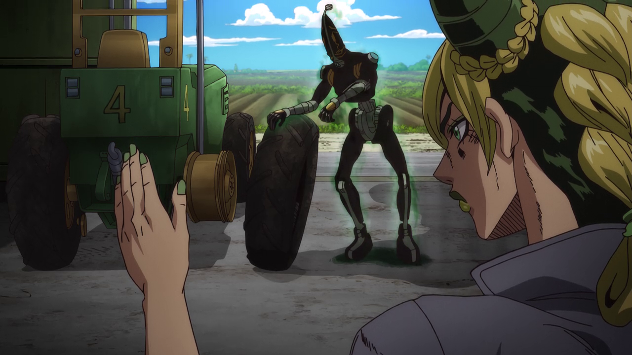 I knew the mystery sixth person in the group was the woman in the tank top since we had seen the other ladies in the shot where Jolyne and Hermes run to catch up to the jeep. But man that whole scene in the beginning with their bodies getting sucked of their moisture and all that was horrifying. I didn’t remember that particular scene so I wasn’t expecting it, but it was done really well. We find out that Foo Fighters, or F.F., is not a human but an organism with intelligence. After that long existential speech, FF is basically a stand user that started off as a plankton with intelligence and stuff. But thanks to that it has a pretty big weakness, being that it needs water to survive at all times. It needs a some source of water nearby, such as taking it from the wetlands nearby, or from humans, etc. Maybe not the most exciting fight but there were some good moments.