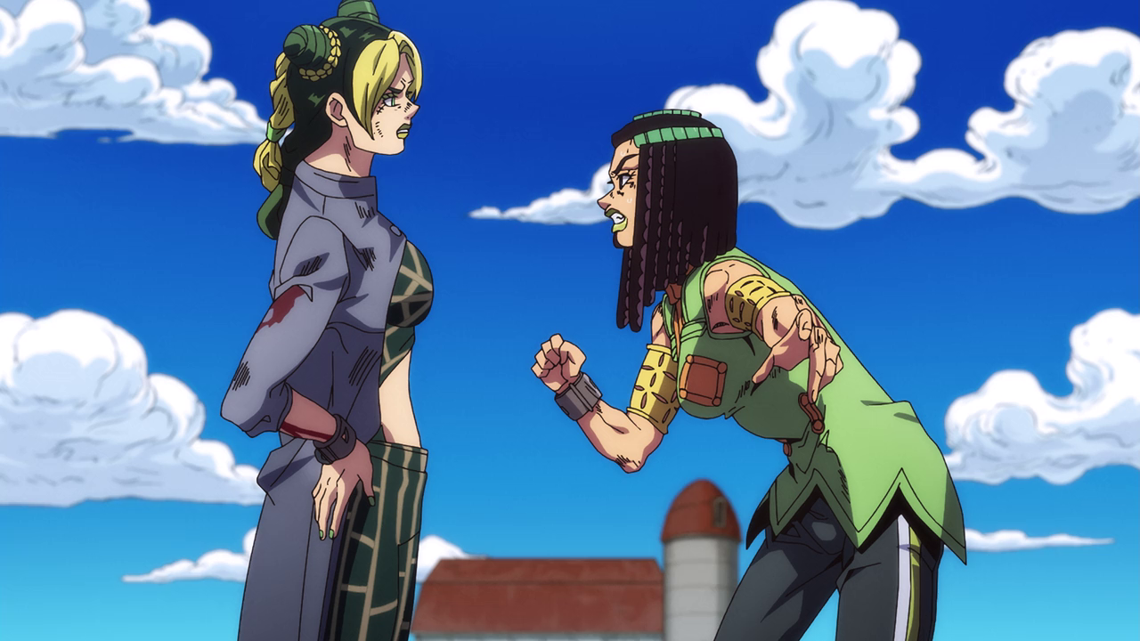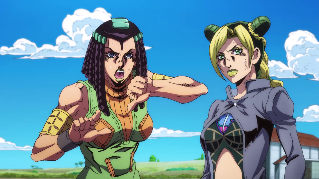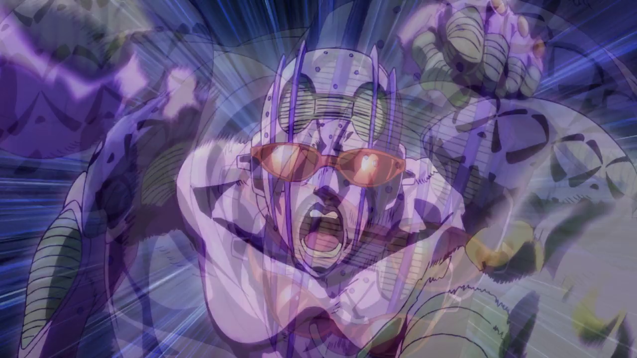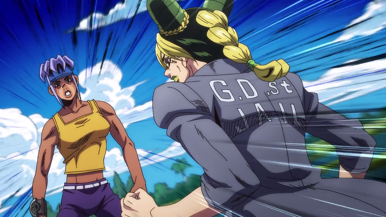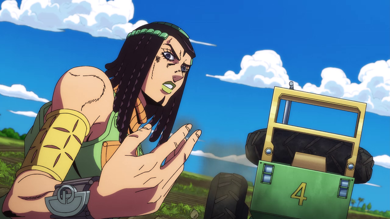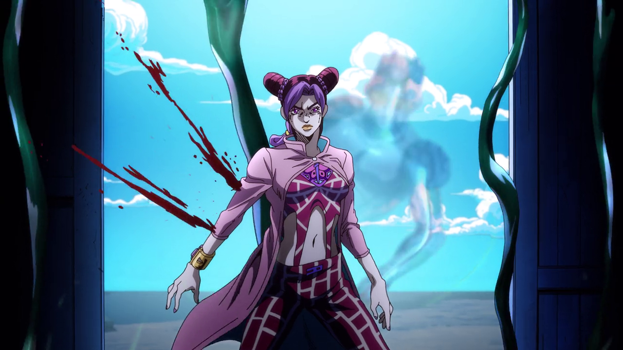 I knew the mystery sixth person in the group was the woman in the tank top since we had seen the other ladies in the shot where Jolyne and Hermes run to catch up to the jeep. But man that whole scene in the beginning with their bodies getting sucked of their moisture and all that was horrifying. I didn’t remember that particular scene so I wasn’t expecting it, but it was done really well. We find out that Foo Fighters, or F.F., is not a human but an organism with intelligence. After that long existential speech, FF is basically a stand user that started off as a plankton with intelligence and stuff. But thanks to that it has a pretty big weakness, being that it needs water to survive at all times. It needs a some source of water nearby, such as taking it from the wetlands nearby, or from humans, etc. Maybe not the most exciting fight but there were some good moments.